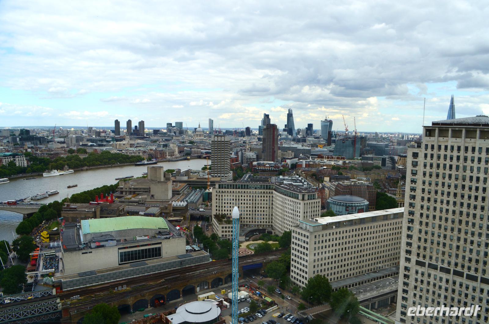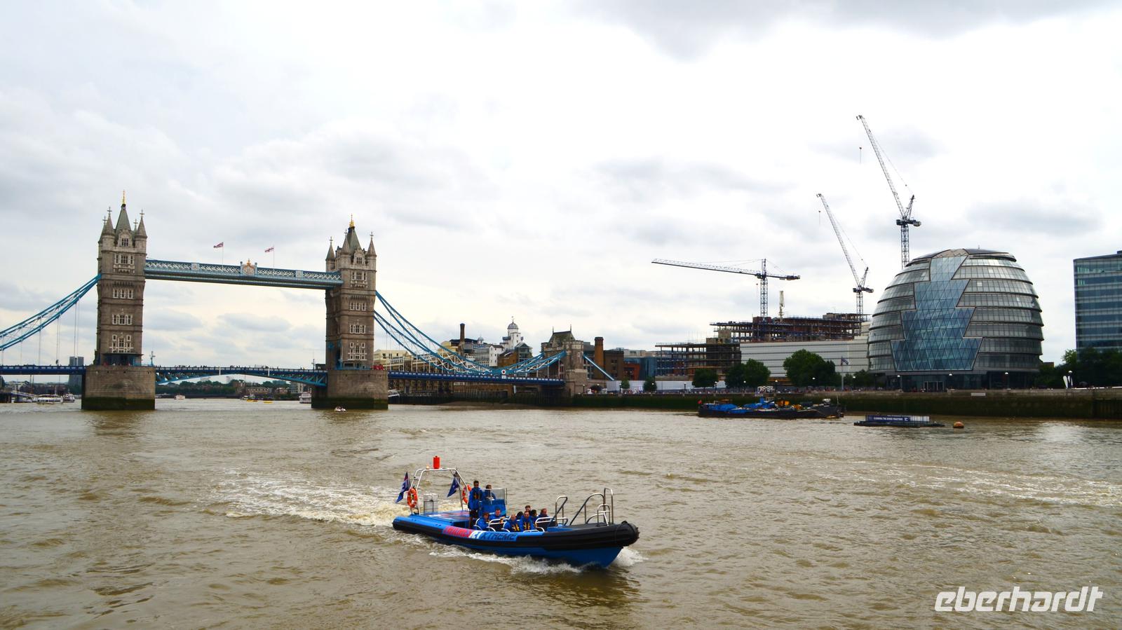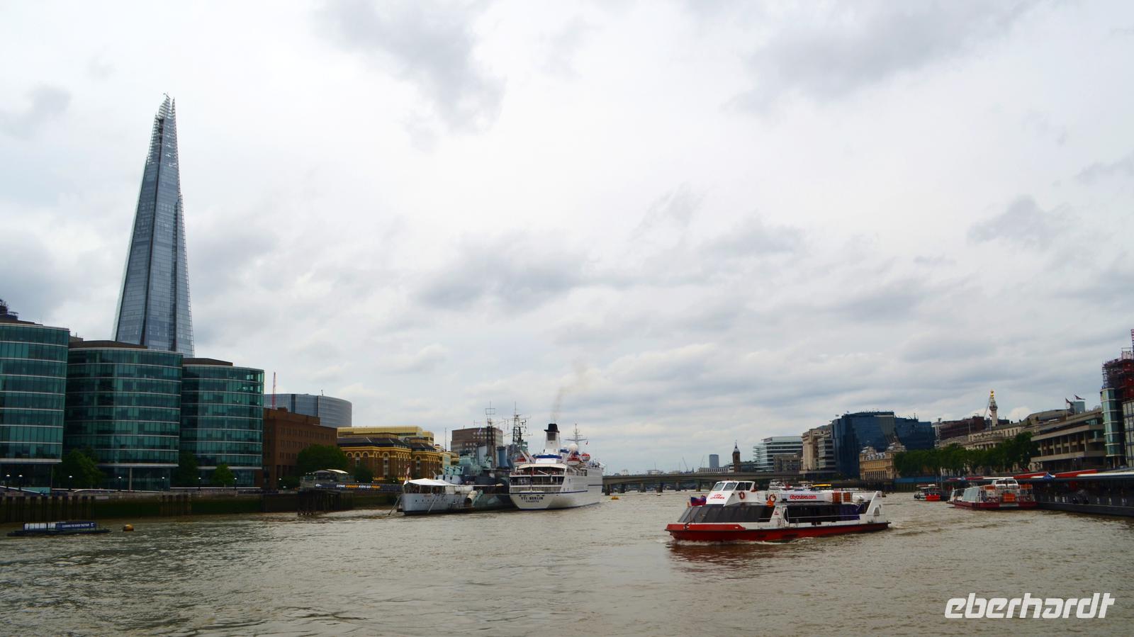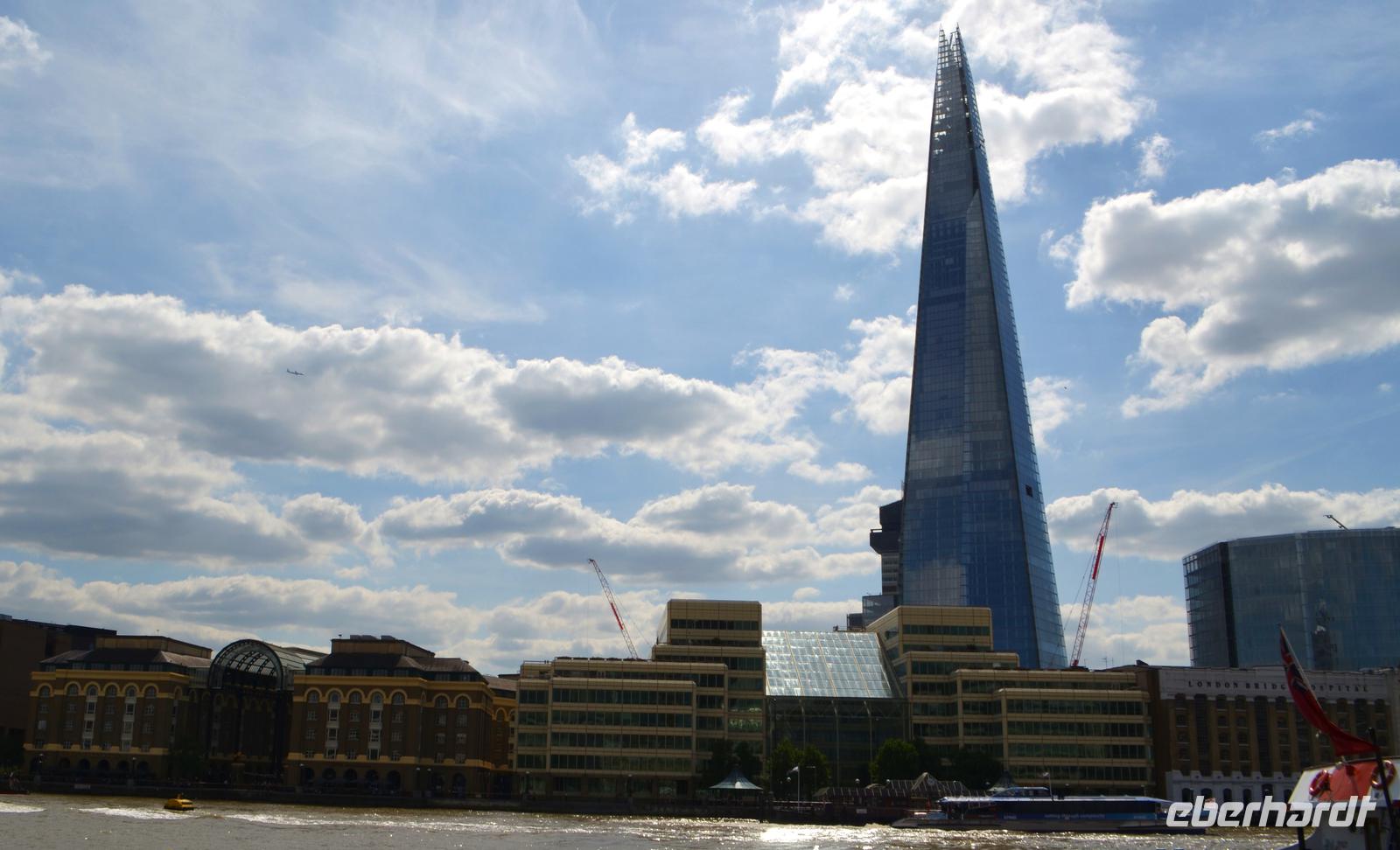 Tony hat alles wunderbar erklärt und so erkennen wir vieles auf unserer anschließenden Fahrt mit dem City-Cruise-Schiff themseabwärts wieder. Spektakuläre Ausblicke auf die Stadt eröffnen sich vom Fluss aus. Gerade an den Flussufern hat sich die Stadt in den letzen Jahren und im Zuge der olympischen Spiele total gewandelt. Die alten Speicher und Werften sind zu modernen Wohn- und Arbeitsorten umgebaut worden und bilden attraktive Ensemble.
