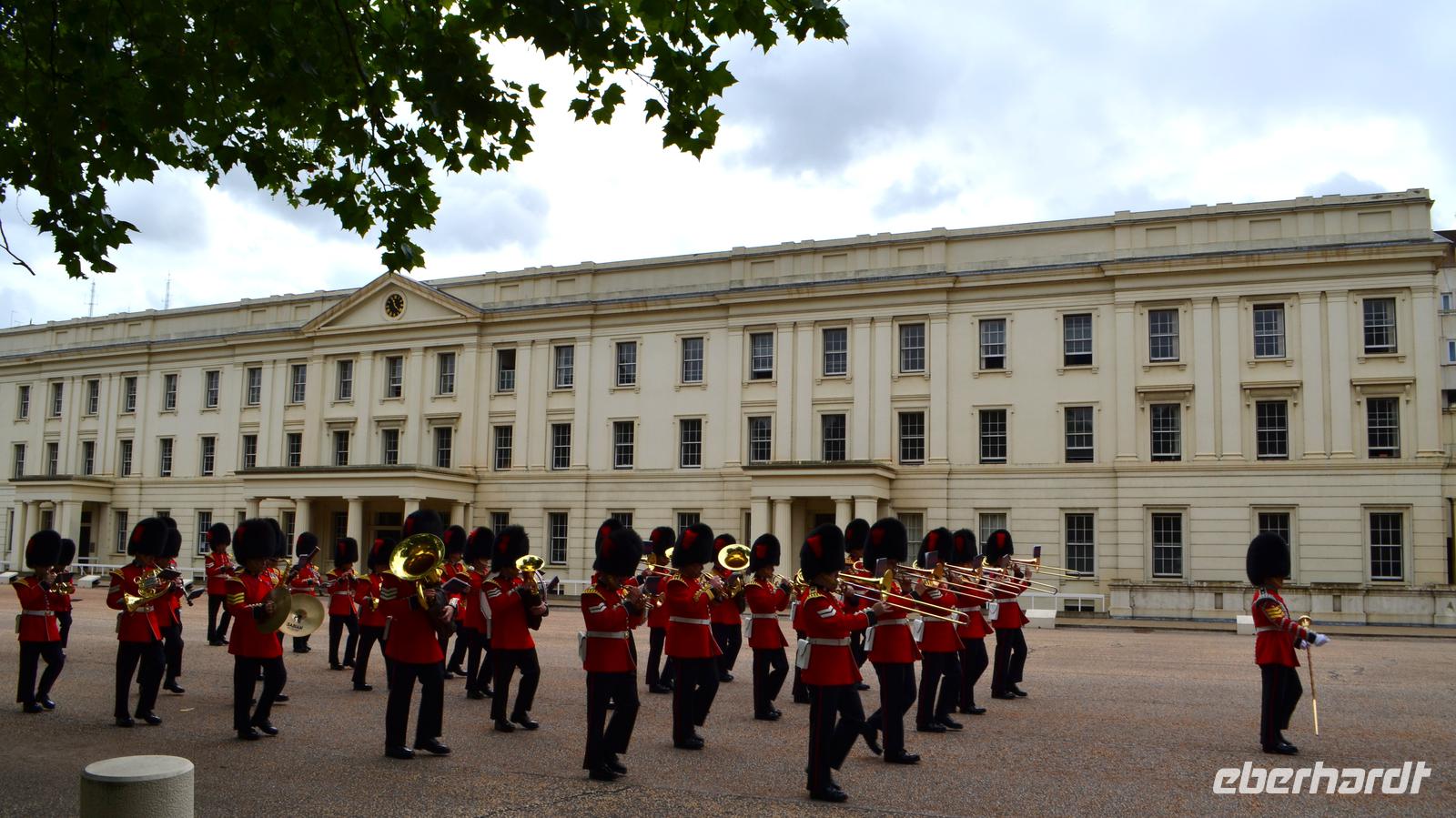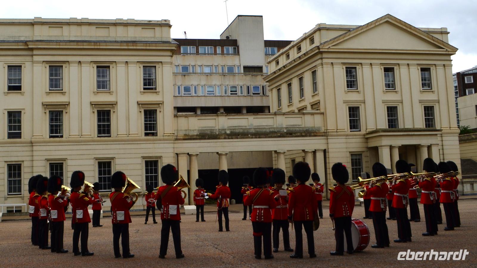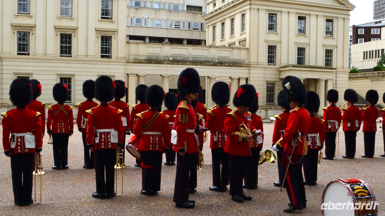 Das Wetter ist teils heiter, teils bewölkt als wir zum Trafalgar Square fahren und dort aussteigen. Von hier führt uns der gemeinsame Fußweg über den Trafalgar Square hin zu The Mall und weiter zum St. James Park. Dabei können wir die angetretenen Horse Guards beim Morgenapell beobachten. Am See des St. James Parks entlang spazieren wir weiter zu den Kasernen neben dem Park, wo sich das Wachregiment und die Musikkapelle für den großen Wachaufzug rüsten. Wir suchen uns einen schönen Beobachtungsplatz nahe dem Buckingham Palace.