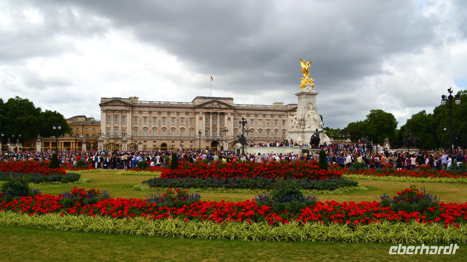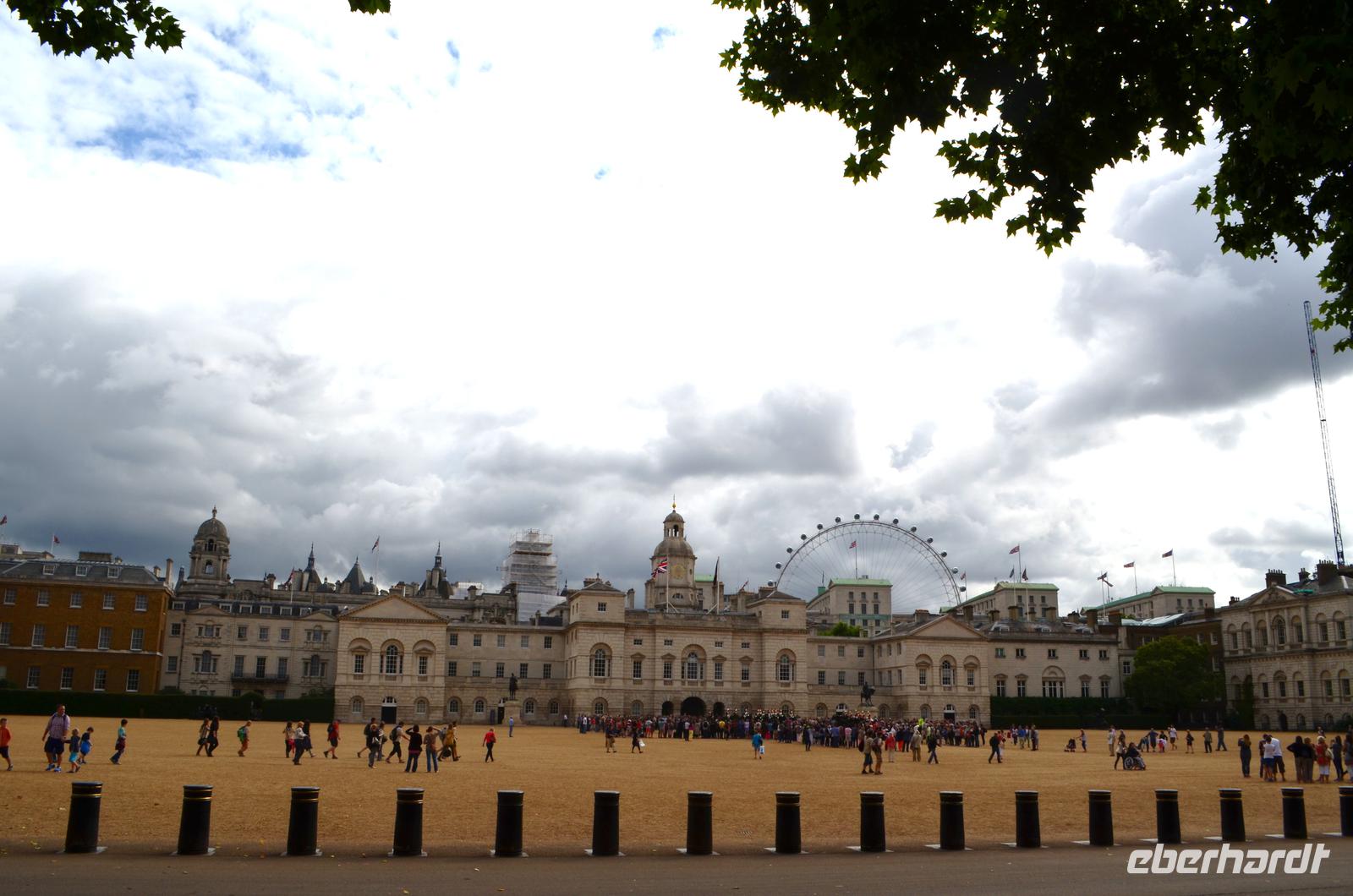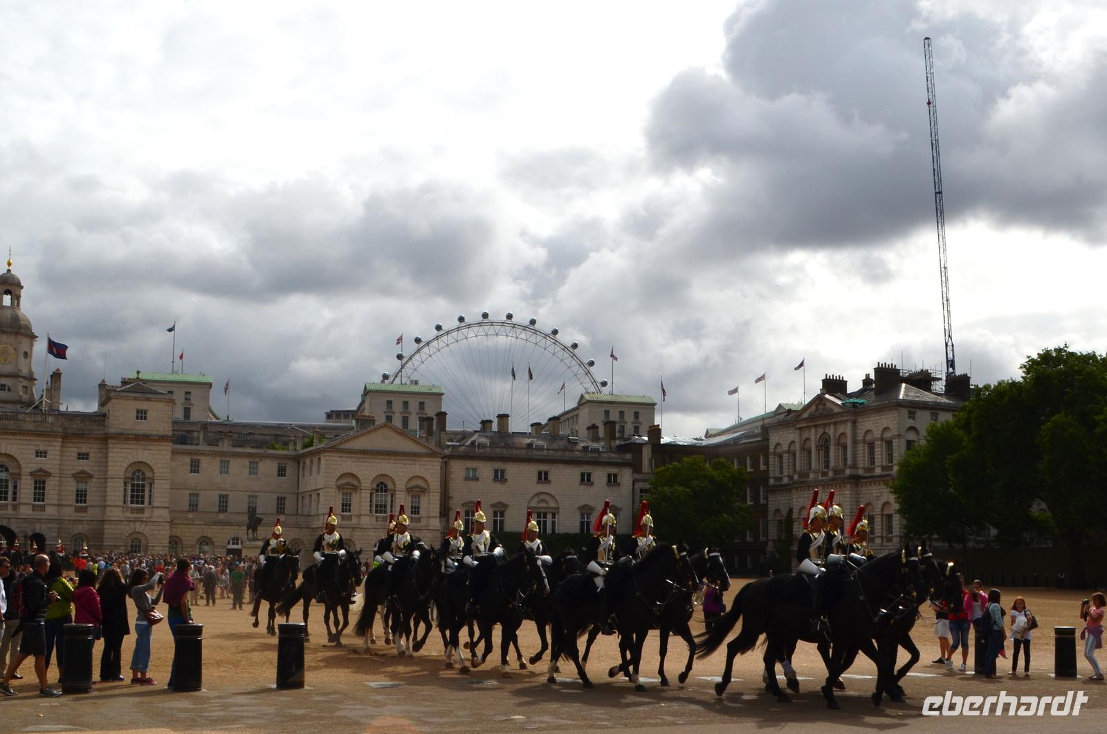 Das Wetter ist teils heiter, teils bewölkt als wir zum Trafalgar Square fahren und dort aussteigen. Von hier führt uns der gemeinsame Fußweg über den Trafalgar Square hin zu The Mall und weiter zum St. James Park. Dabei können wir die angetretenen Horse Guards beim Morgenapell beobachten. Am See des St. James Parks entlang spazieren wir weiter zu den Kasernen neben dem Park, wo sich das Wachregiment und die Musikkapelle für den großen Wachaufzug rüsten. Wir suchen uns einen schönen Beobachtungsplatz nahe dem Buckingham Palace.