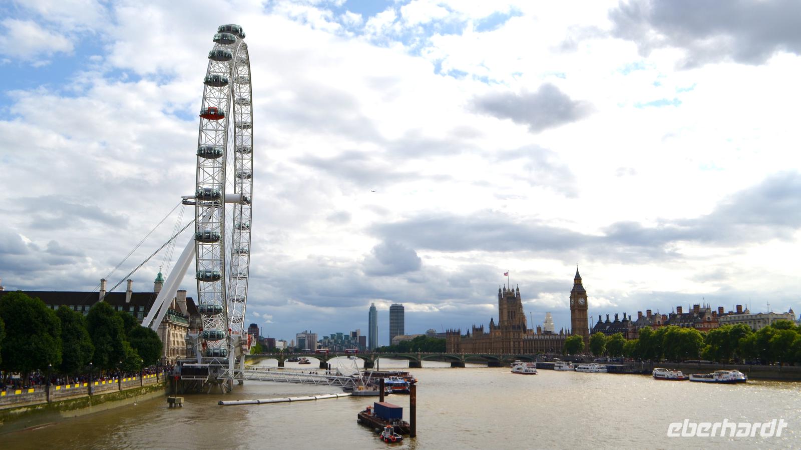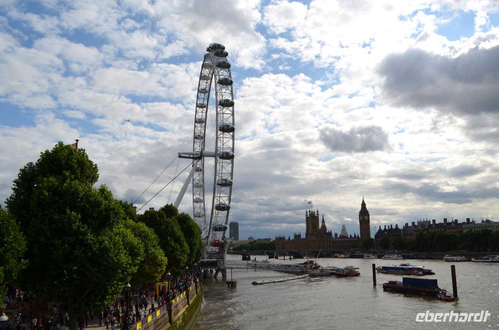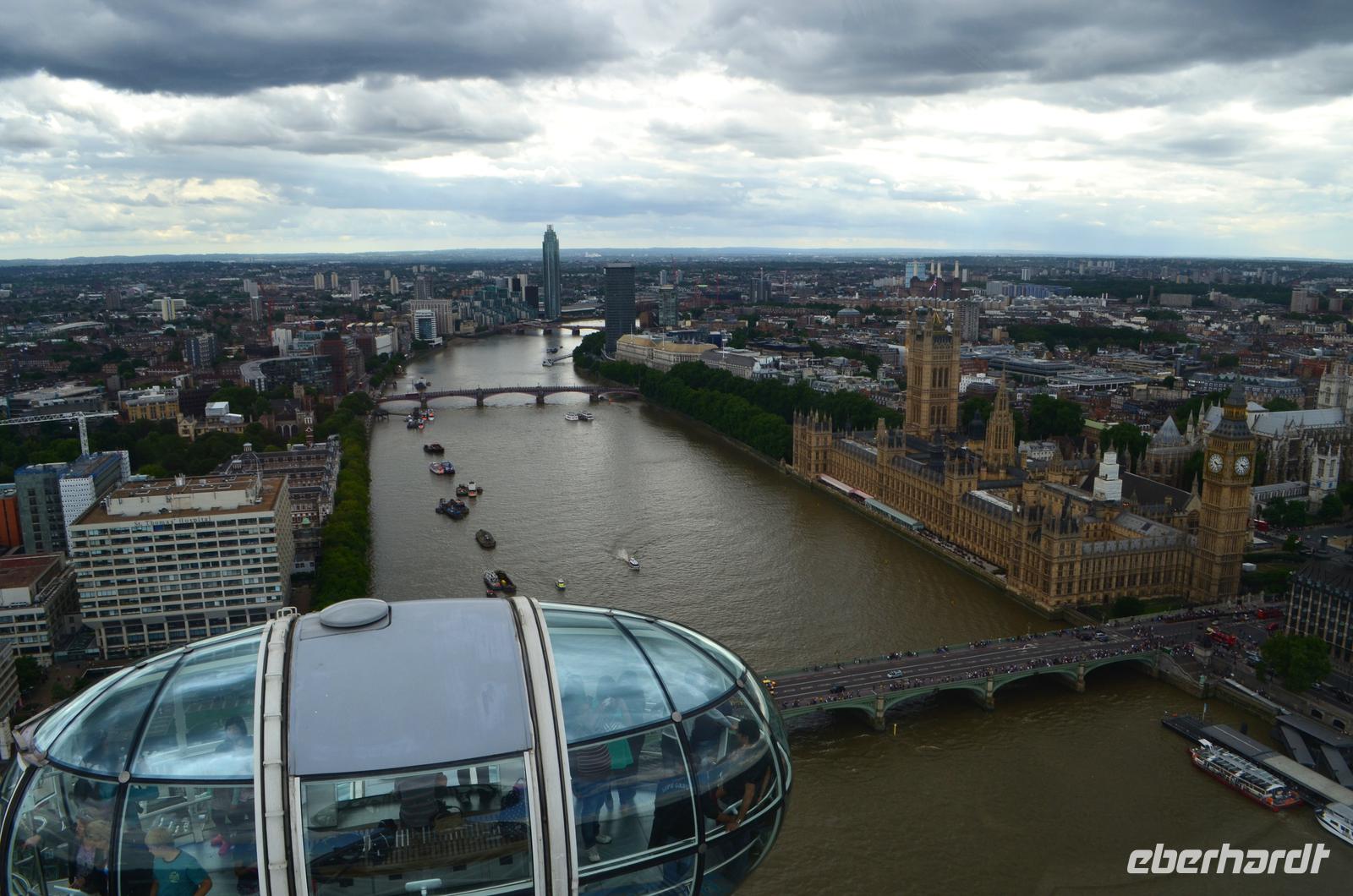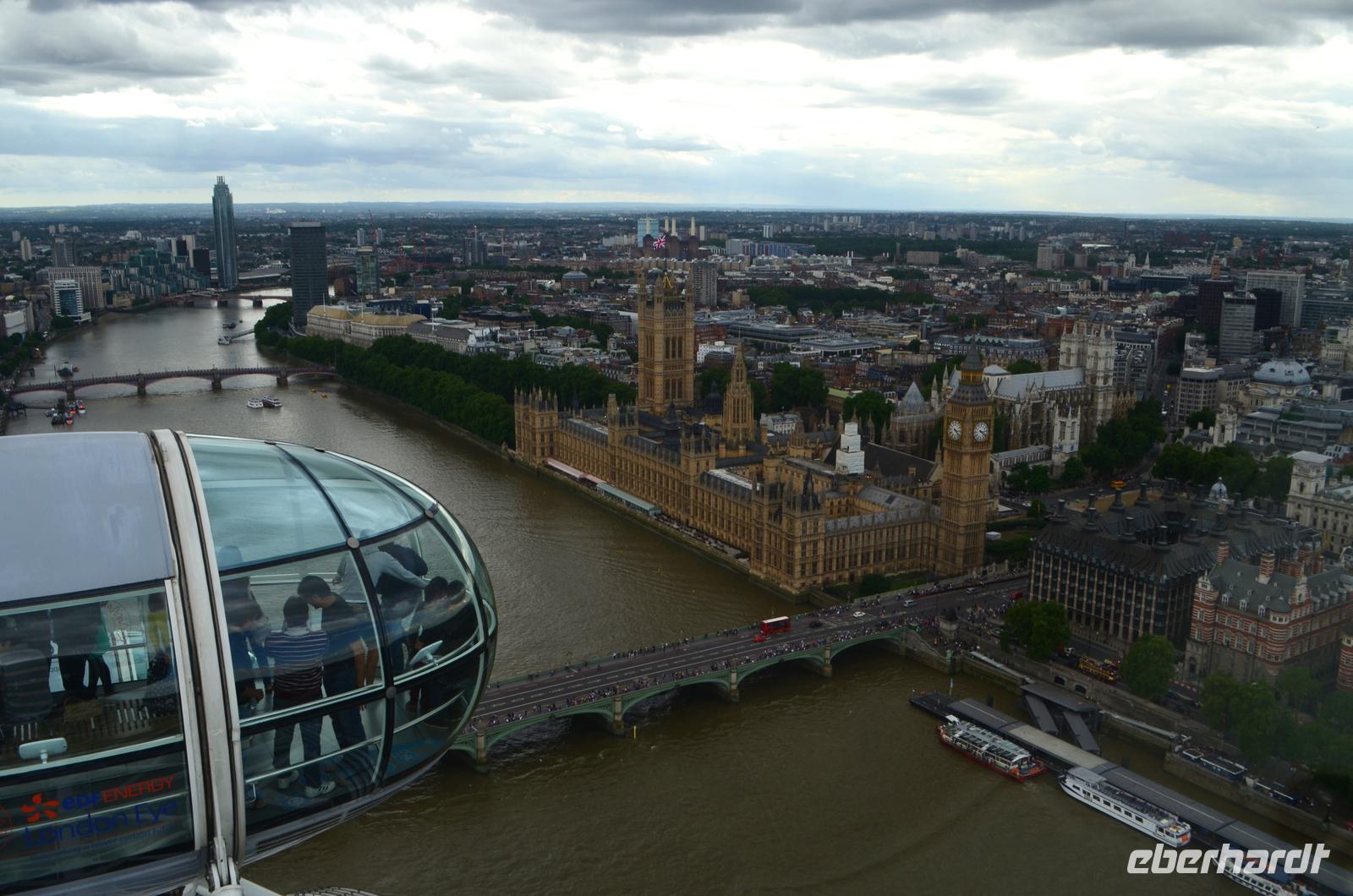 Danach spazieren wir zurück durch den Park, den St. James Park, auf der anderen Seeseite entlang zur King Charles Street, zur Downing Street dem Sitz des Regierungschefs, weiter zum Parliament Square und vorbei an der Westminster Abbey, dann über die Westminster Bridge hinüber zum London Eye. Die vielen Touristen in der Stadt an diesem Wochenende veranlassen uns dazu so schnell wie möglich das berühmte Riesenrad zu besteigen. Toll und einmalig die Aussicht bei dieser Panoramafahrt. Den tollen 4D-Filmstreifen im Informationszentrum besuchen wir hinterher. Am späten Nachmittag bringt uns der Bus zurück zum Hotel.