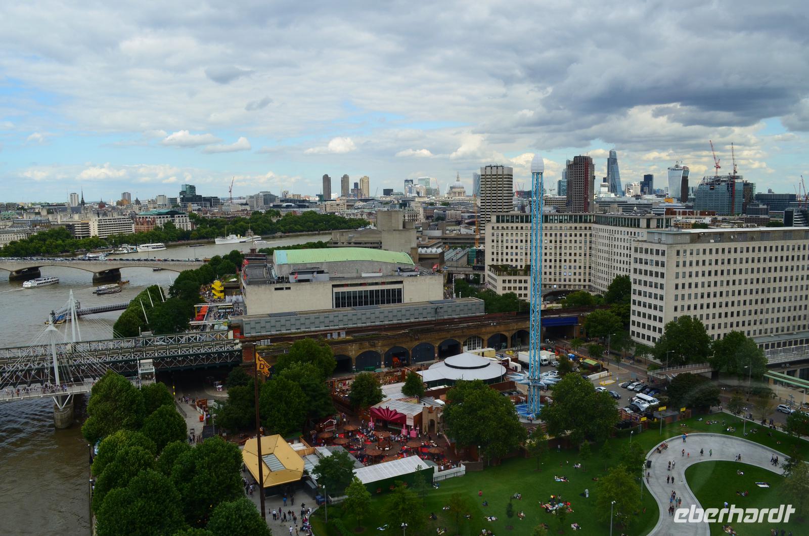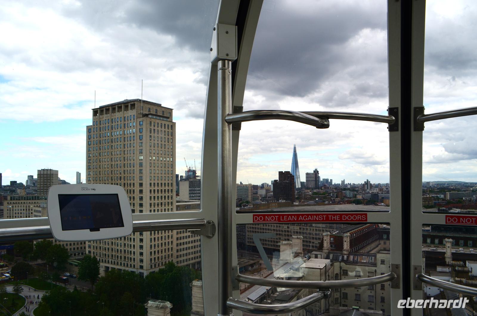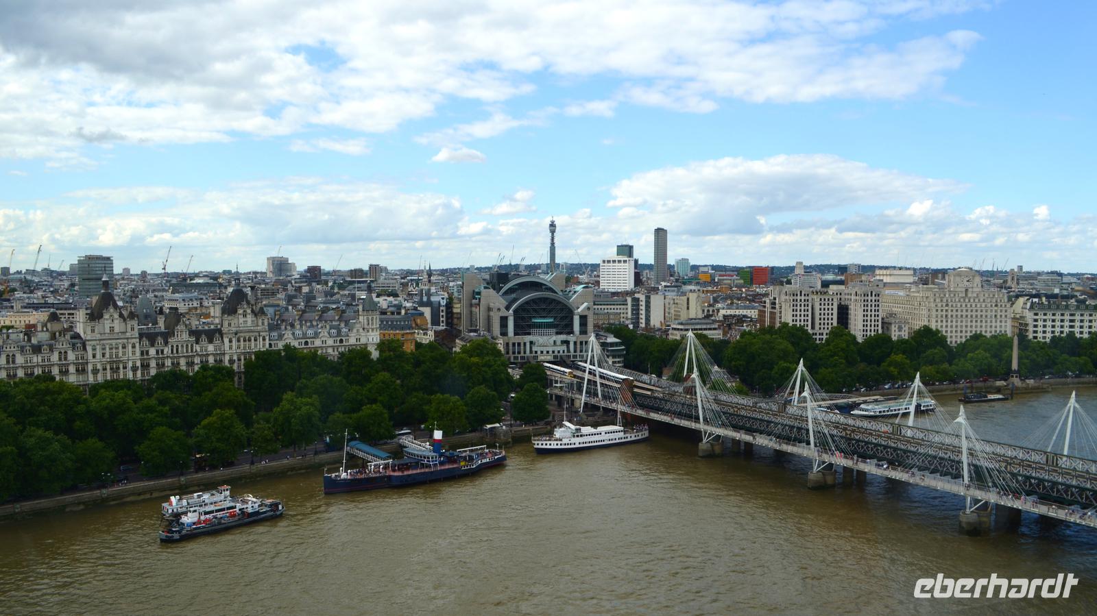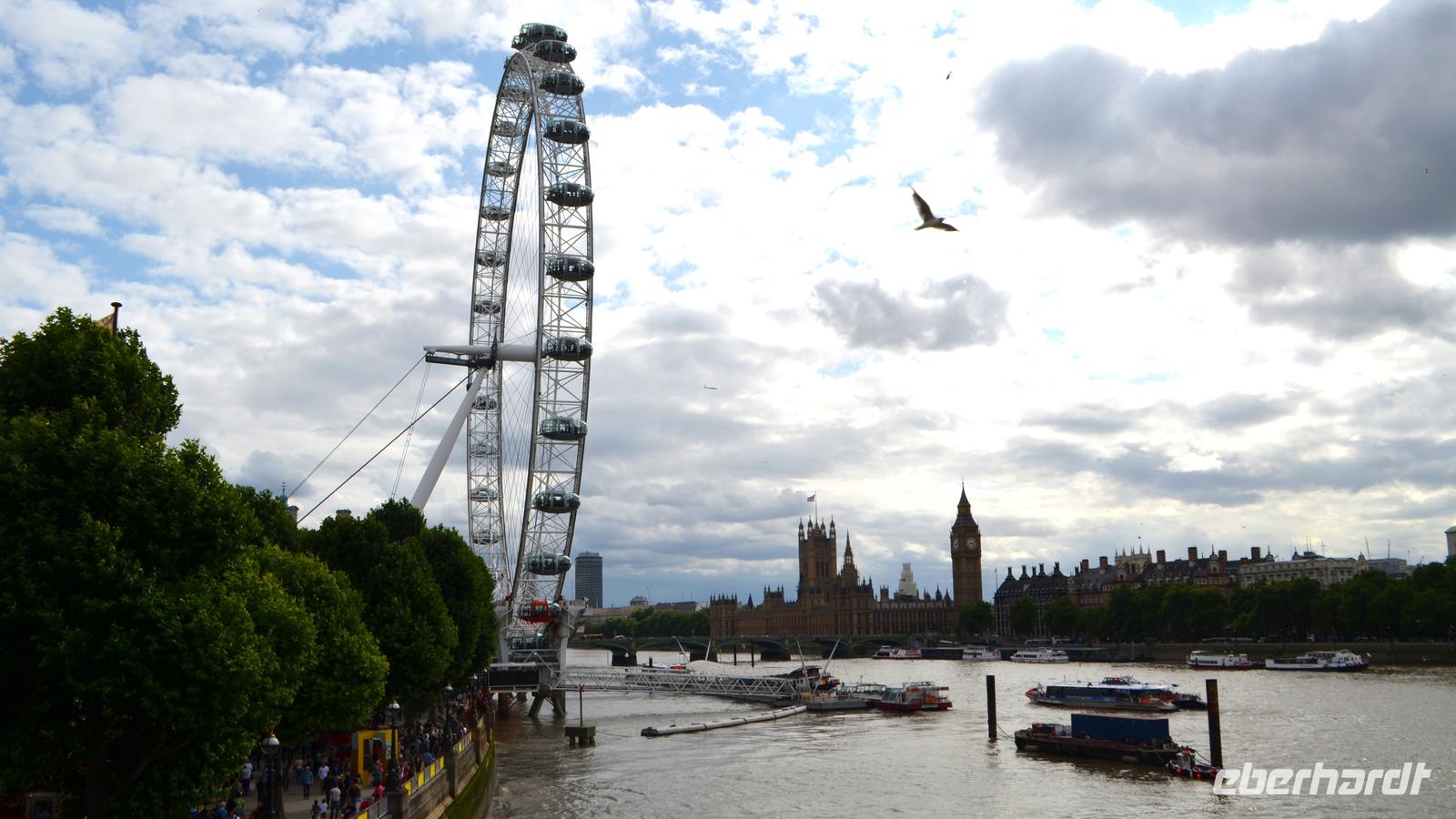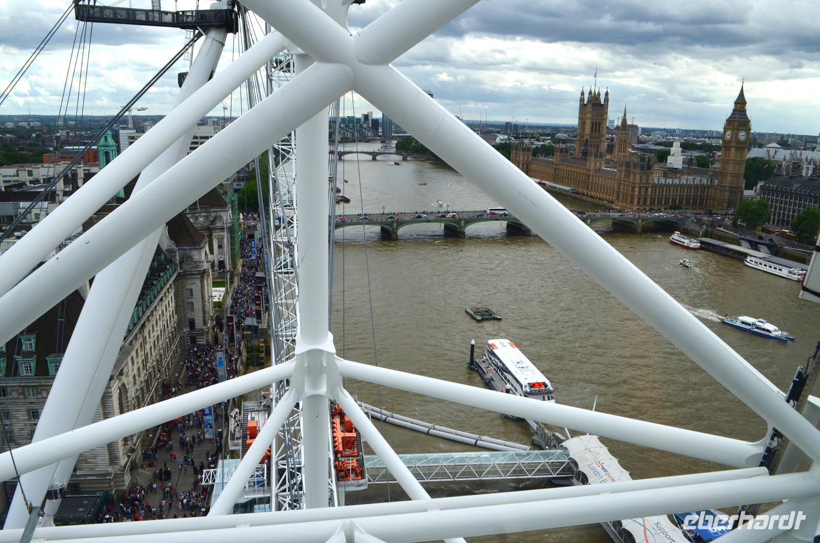 Danach spazieren wir zurück durch den Park, den St. James Park, auf der anderen Seeseite entlang zur King Charles Street, zur Downing Street dem Sitz des Regierungschefs, weiter zum Parliament Square und vorbei an der Westminster Abbey, dann über die Westminster Bridge hinüber zum London Eye. Die vielen Touristen in der Stadt an diesem Wochenende veranlassen uns dazu so schnell wie möglich das berühmte Riesenrad zu besteigen. Toll und einmalig die Aussicht bei dieser Panoramafahrt. Den tollen 4D-Filmstreifen im Informationszentrum besuchen wir hinterher. Am späten Nachmittag bringt uns der Bus zurück zum Hotel.