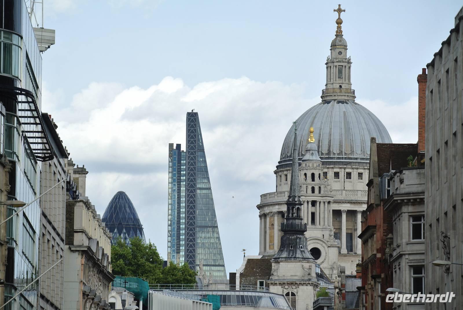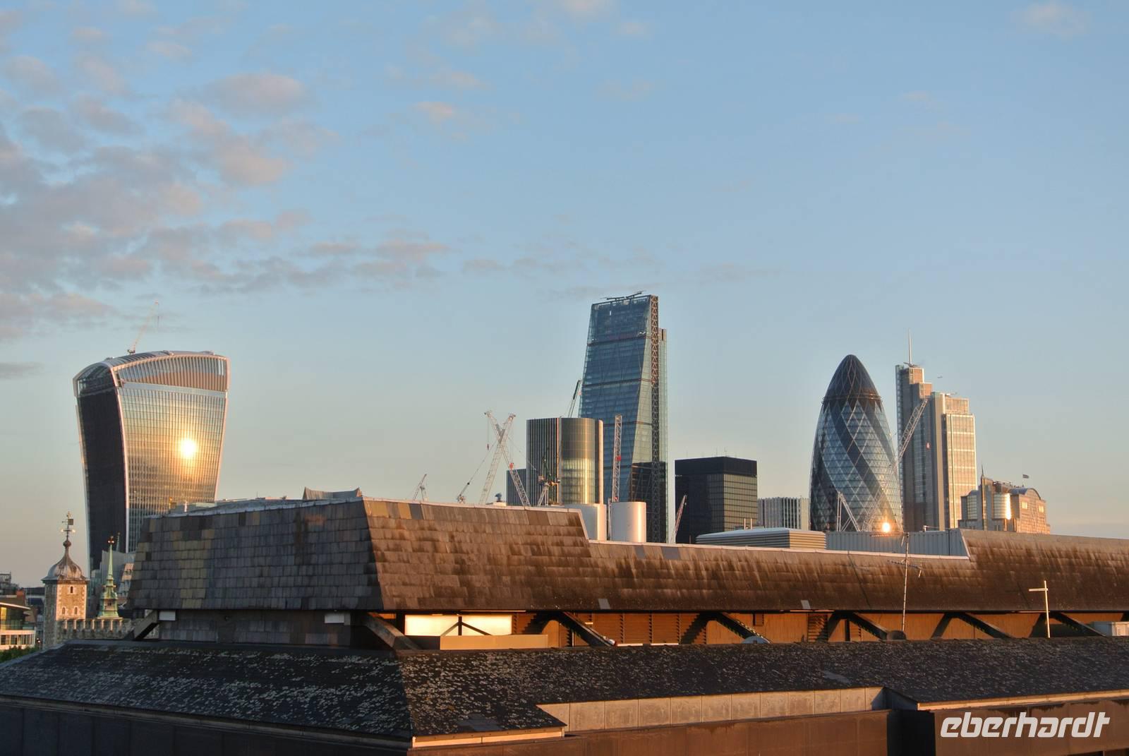 Dort hatten wir einen Aufenthalt von 30 Minuten. Julia erzählte uns - von einer Aussichtsterrasse eines gegenüber liegenden Eikaufcenter aus - viel Interessantes zur der Kathedrale und den umliegenden Sehenswürdigkeiten, darunter auch etwas zu den modernen Hochhäusern der „Käsehobel" und „Gurke".