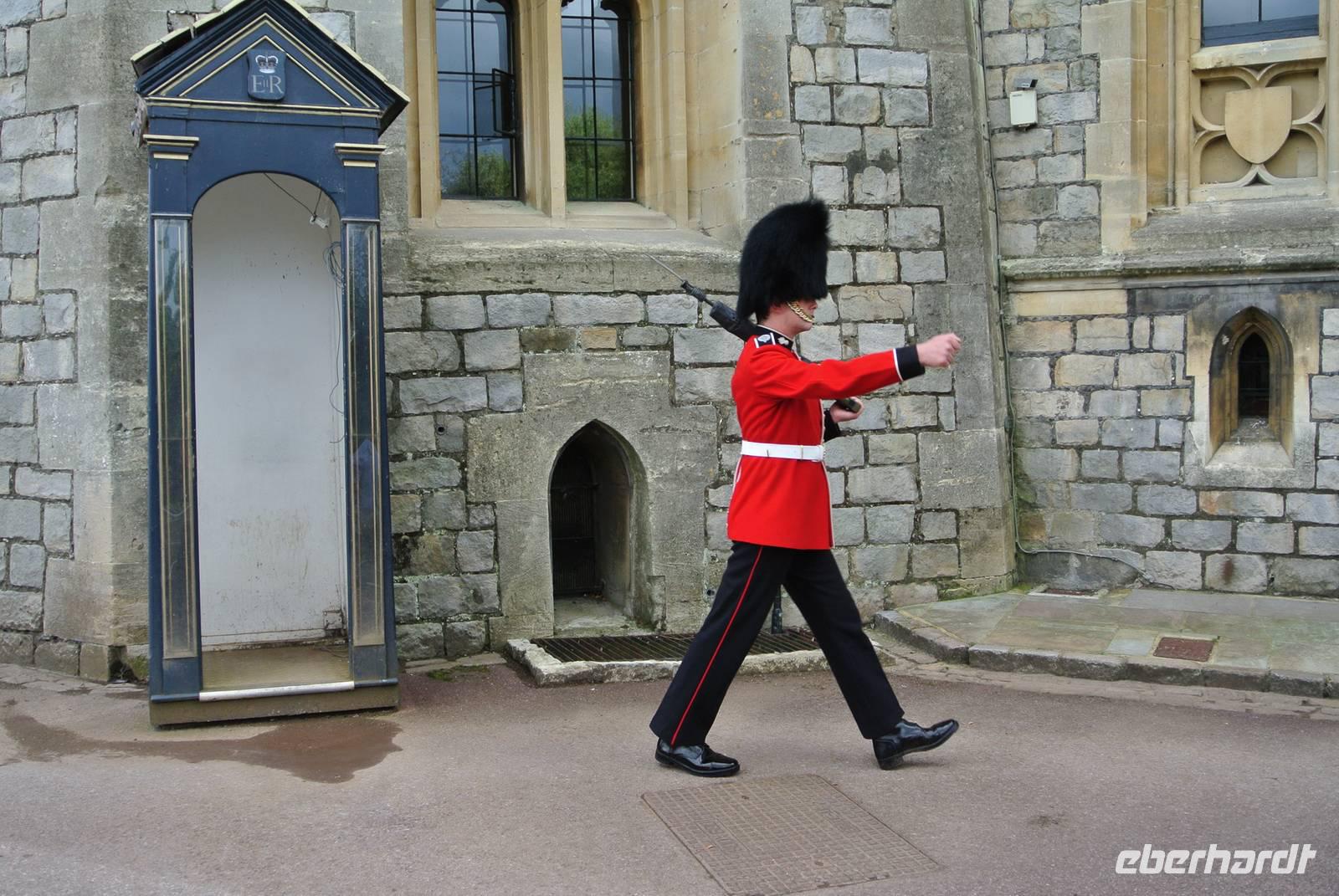 Auf dem Weg zum Schloss der englischen Queen machten wir einen Stopp am Guards House, wo zwei Guards in der schwarzen Fellmütze und rotem Uniformjacke in zwei Wachhäuschen standen.