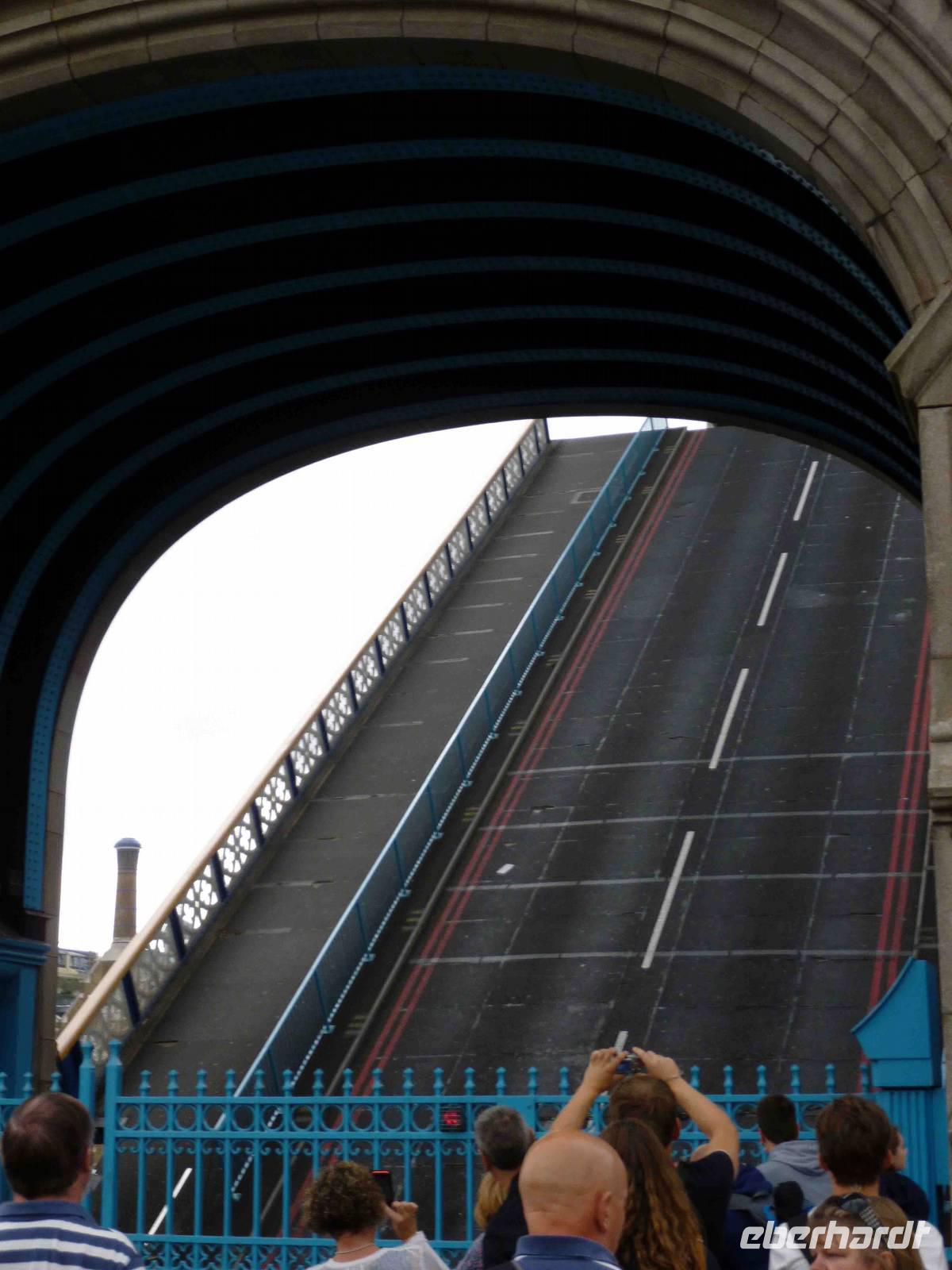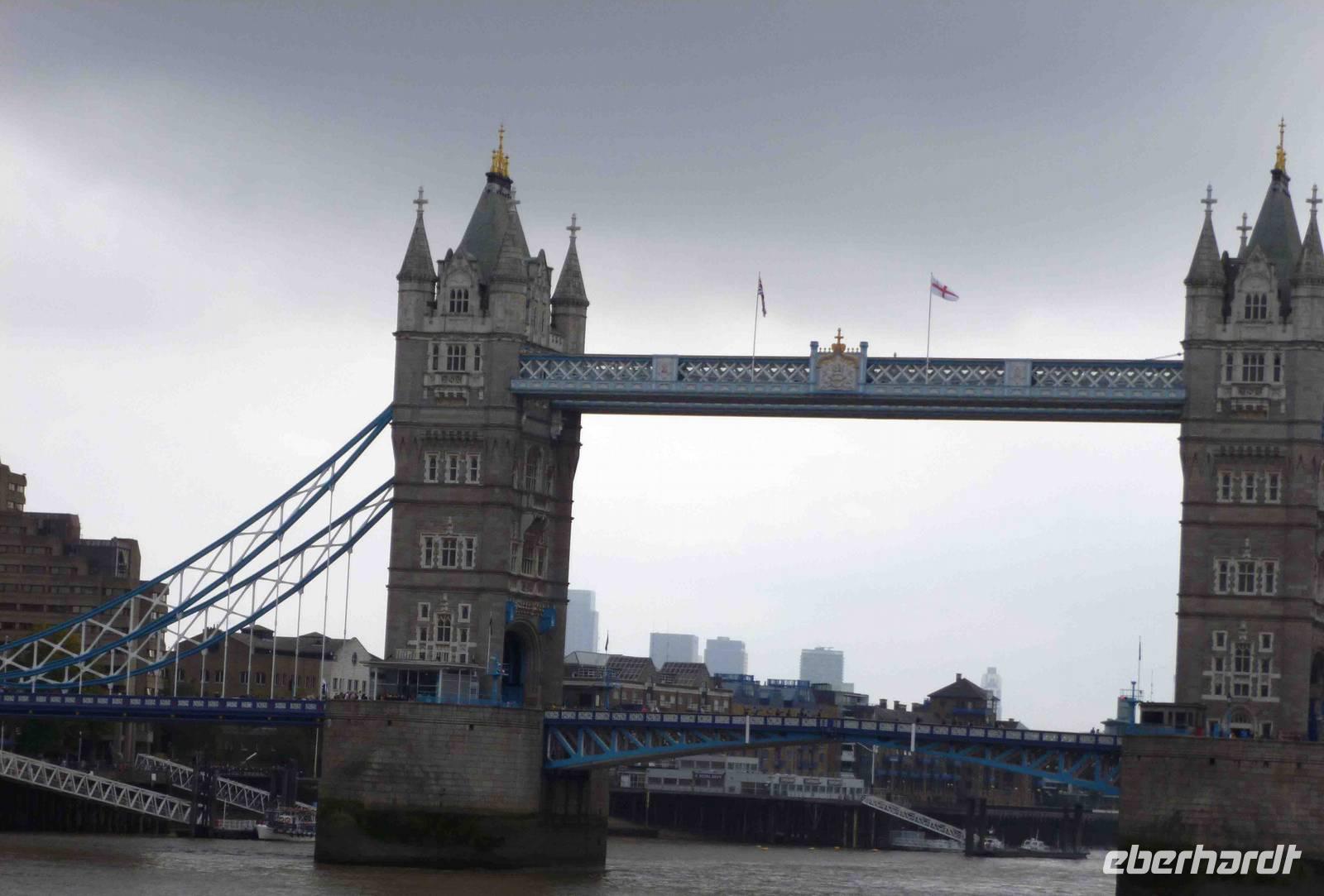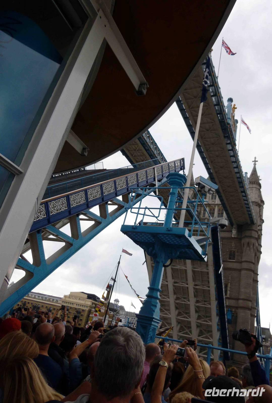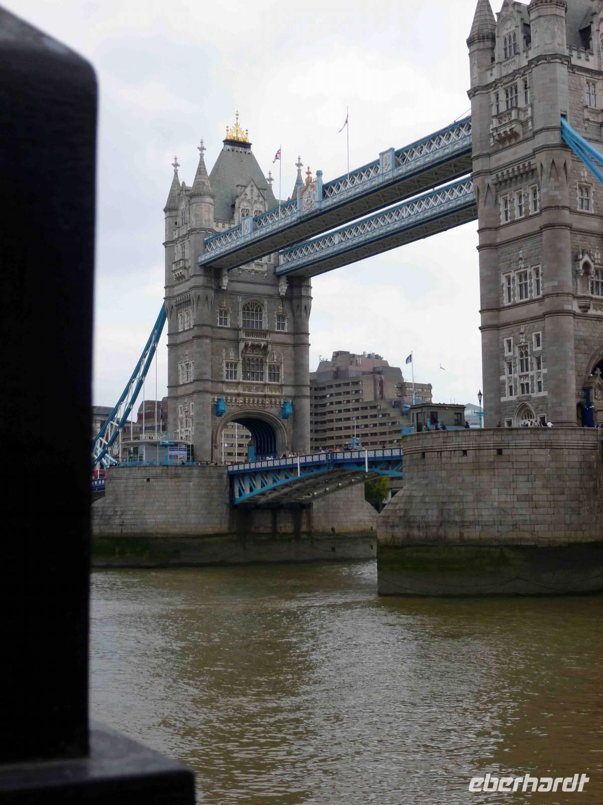 Wieviele rabenschwarze Geschichten mögen sich hier abgespielt haben: um Anna Boleyn, um Sir Walter Raleigh im Bloody Tower und um all die anderen. Wir verließen nicht ohne einen Schauder diesen Turm und stärkten uns im hellen Sonnenschein, in der Freiheit mit einem Snack, bevor wir über die Tower Bridge liefen, die sich gerade für ein Segelboot öffnete - sehr eindrucksvoll, wie rasch das ging! Es gibt wohl nicht viele Personen, die diese Brücke öffnen können.