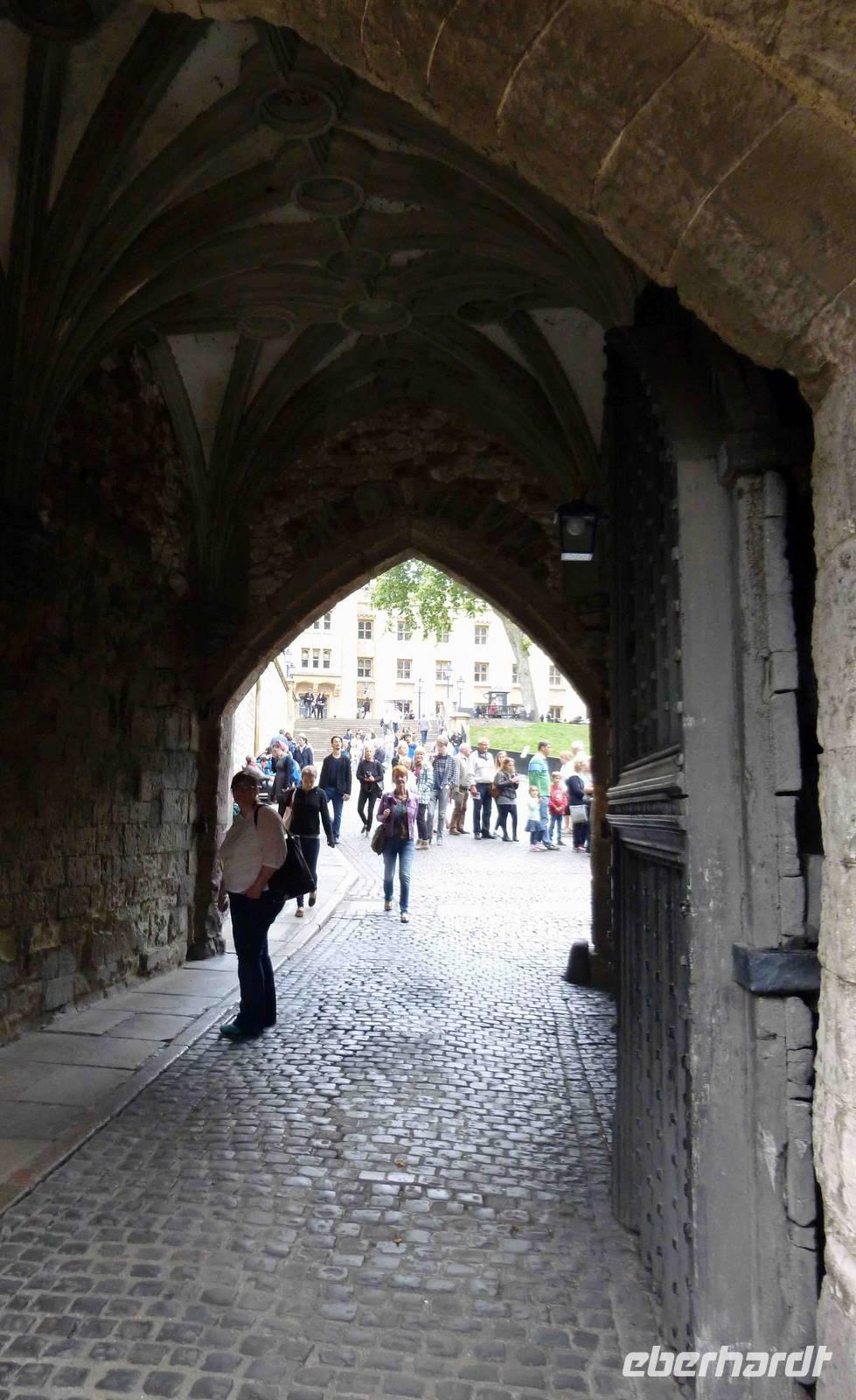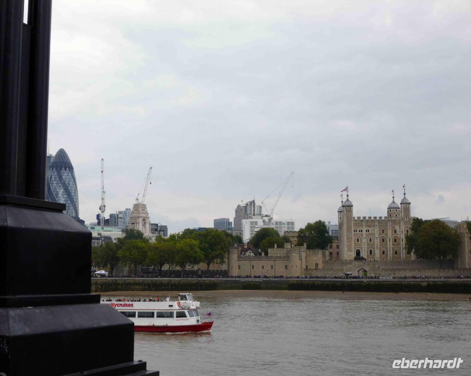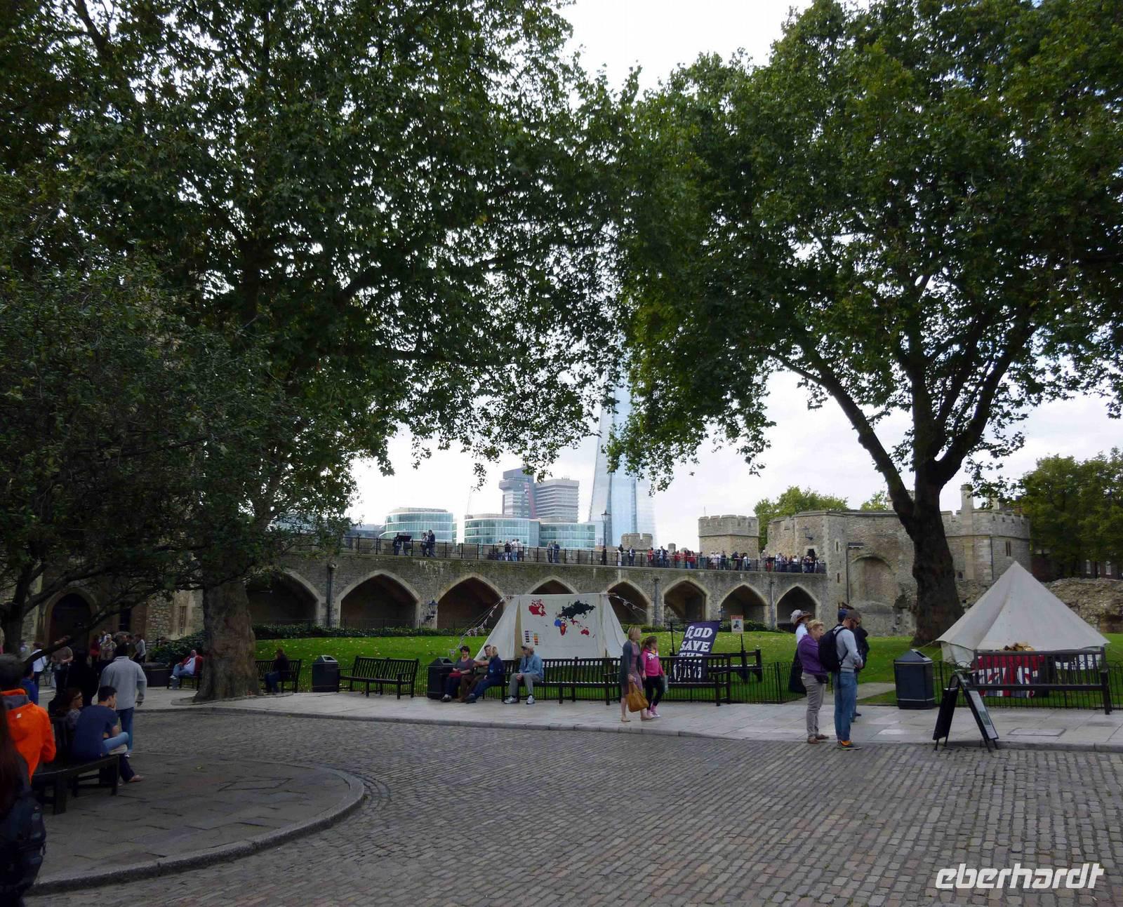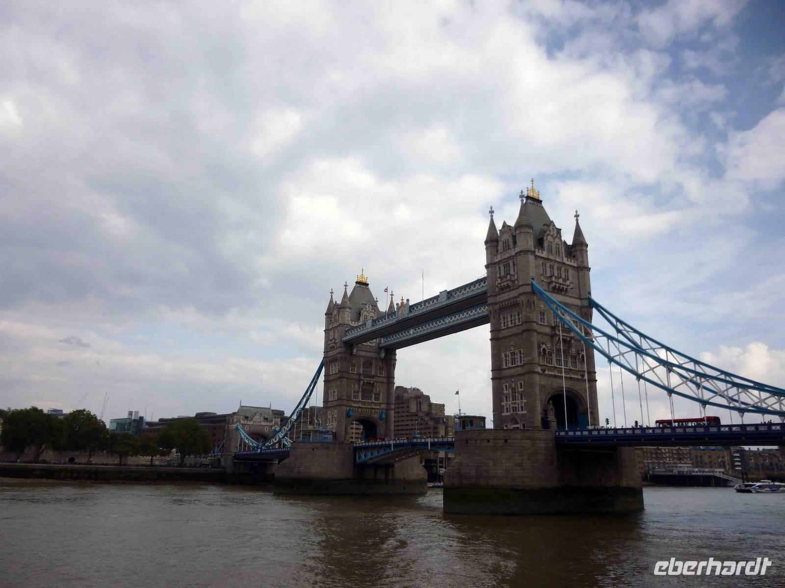 Wieviele rabenschwarze Geschichten mögen sich hier abgespielt haben: um Anna Boleyn, um Sir Walter Raleigh im Bloody Tower und um all die anderen. Wir verließen nicht ohne einen Schauder diesen Turm und stärkten uns im hellen Sonnenschein, in der Freiheit mit einem Snack, bevor wir über die Tower Bridge liefen, die sich gerade für ein Segelboot öffnete - sehr eindrucksvoll, wie rasch das ging! Es gibt wohl nicht viele Personen, die diese Brücke öffnen können.