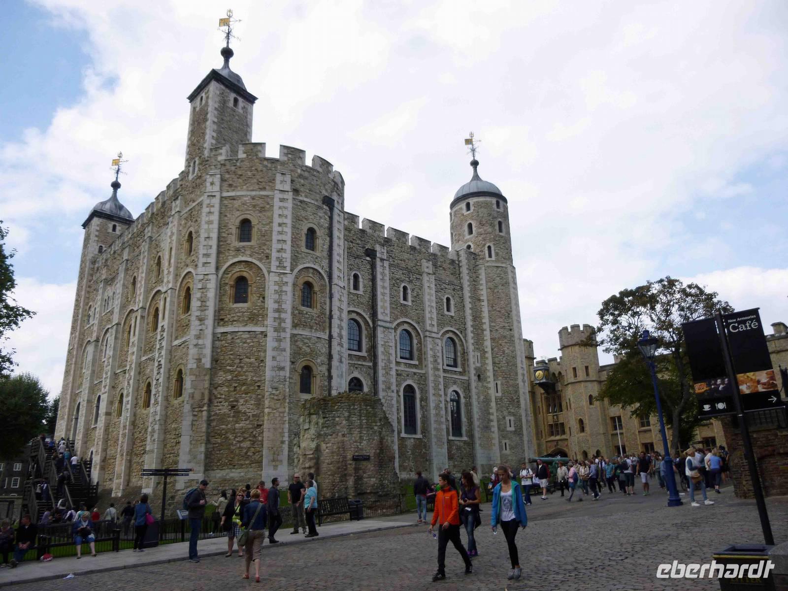Wir betrachteten auch die königliche Waffensammlung im weißen Turm (mit den vier Zwiebeltürmchen): Rüstungen für Ritter und Pferde, mittelalterliche Waffen aller Coleur - vier einfache normannische Toiletten wirkten dagegen recht menschlich. Der Gebrauch der Langbogen und normannischen Waffen wurde erlärt und wir sahen auch durch ein Rittervisier: die Augenschlitze ließen für uns Ungeübte nichts erkennen von der Umgebeung, auweia!
