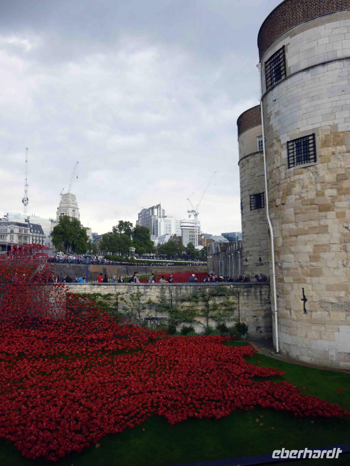 Heute erwartete uns ein besonderes königliches Gebäude: der Tower. Da ein Radrennen stattfand, umfuhren wir südlich des Themseflusses und liefen zu Fuß über die Tower Bridge zum Wassertor und betrachteten die mächtige Festungsanlage zunächst vom Außenring, bevor wir durch den Themseeingang in den zweiten Innenring schlüpften: zunächst beeindruckte uns außen der gewaltige blutrote See von keramischen Mohnblumen rund um den Tower im Graben zum Gedenken an die Gefallenen im Weltkrieg. Innen gingen wir gemeinsam an den Fundamenten der ehemaligen römischen Stadtmauer und am White Tower vorbei in Richtung der Waterloo Barracks mit den berühmten Kronjuwelen.