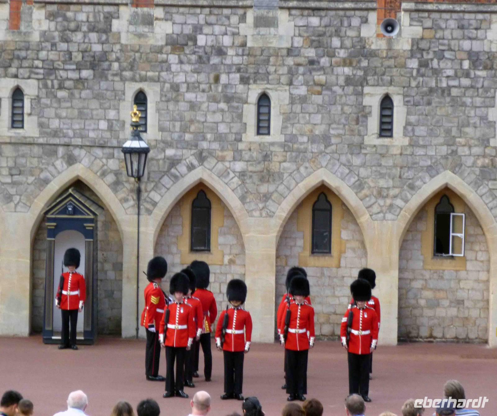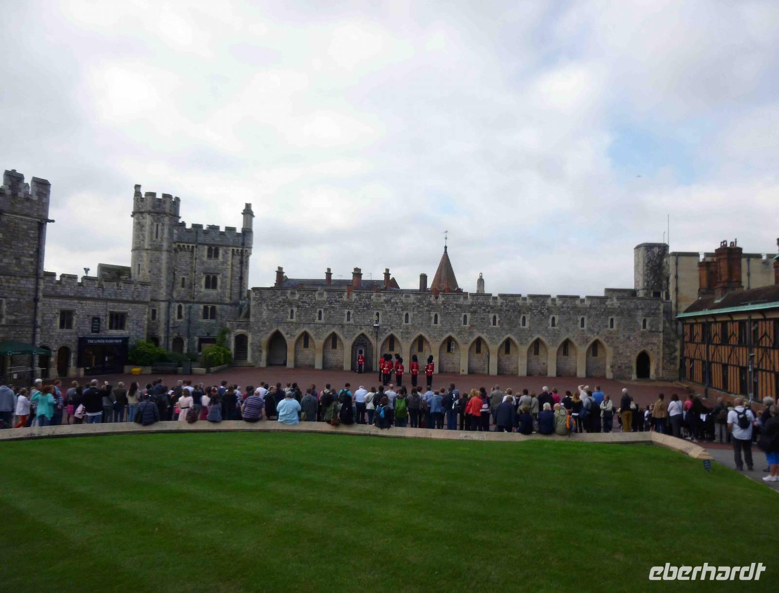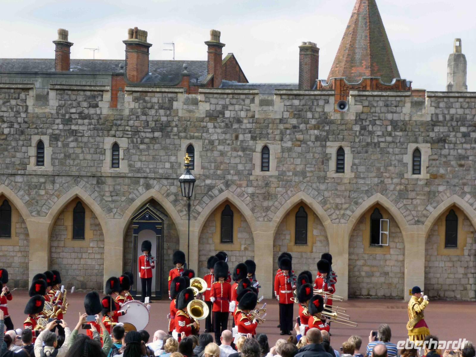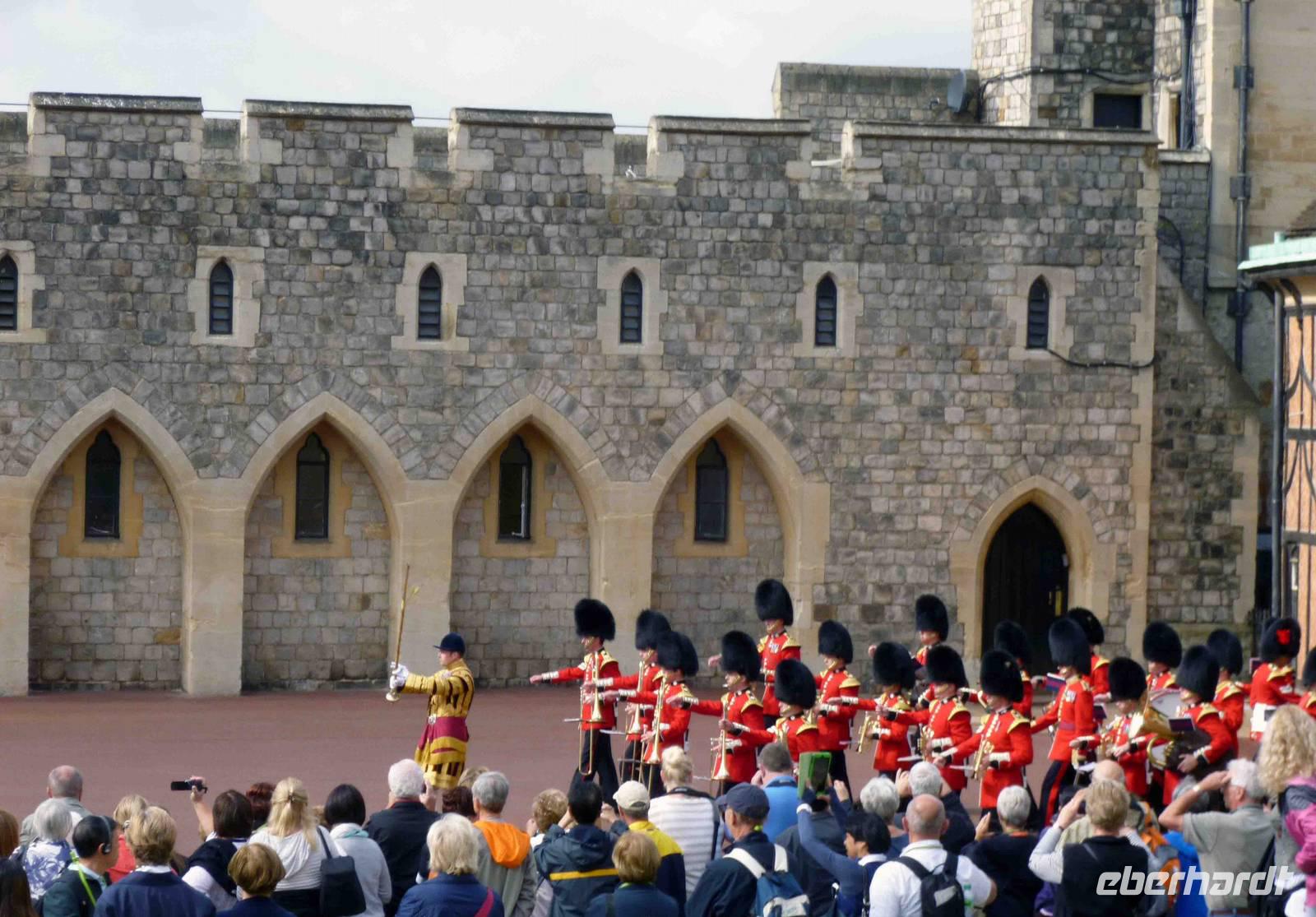 Auf nach Windsor Castle, nur ca. 40 km vom Londoner Westen entfernt: das "englische Versailles" ist das größte und älteste durchgängig bewohnte Schloss der Welt im Ort Windsor in der Grafschaft Berkshire. Seine Ursprünge reichen bis in der Zeit von Wilhelm dem Eroberer zurück. Das Schloss befindet sich im Besitz der Krone und ist mit dem Buckingham Palace und dem Holyrood Palace in Edinburgh eine der offiziellen Hauptresidenzen der britischen Monarchen. Unterhalb der Burg fließt die Themse auf ihrem Weg nach Osten zur Hauptstadt London. Wir betraten voller Erwartung nach der Sicherheitskontrolle mit unseren Audioguides den mittleren Burghof und liefen zunächst zum unteren Burghof in Richtung St. Georgs Kapelle mit Grablegen englischer und britischer Könige und mit der Albert Memorial Hall. Hier auf dem unteren Hof sollte 11 Uhr die Wachablösung stattfinden und tatsächlich ertönte bald flotte Marschmusik.