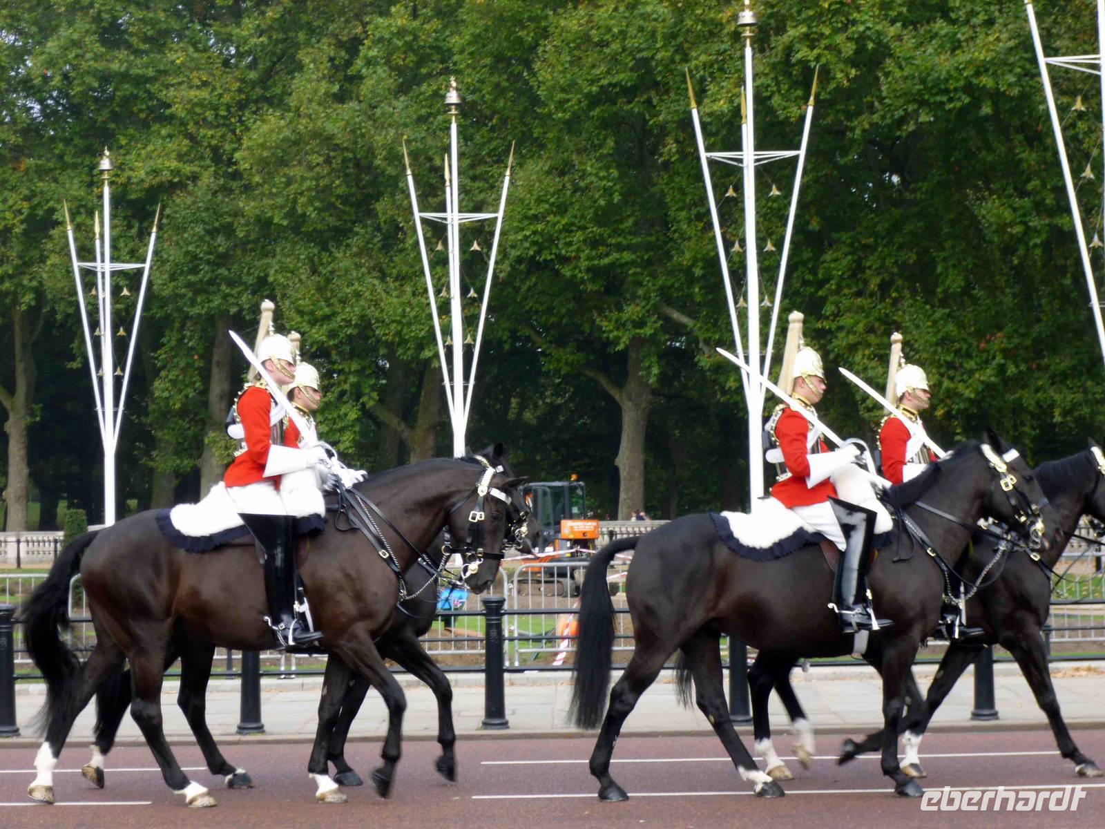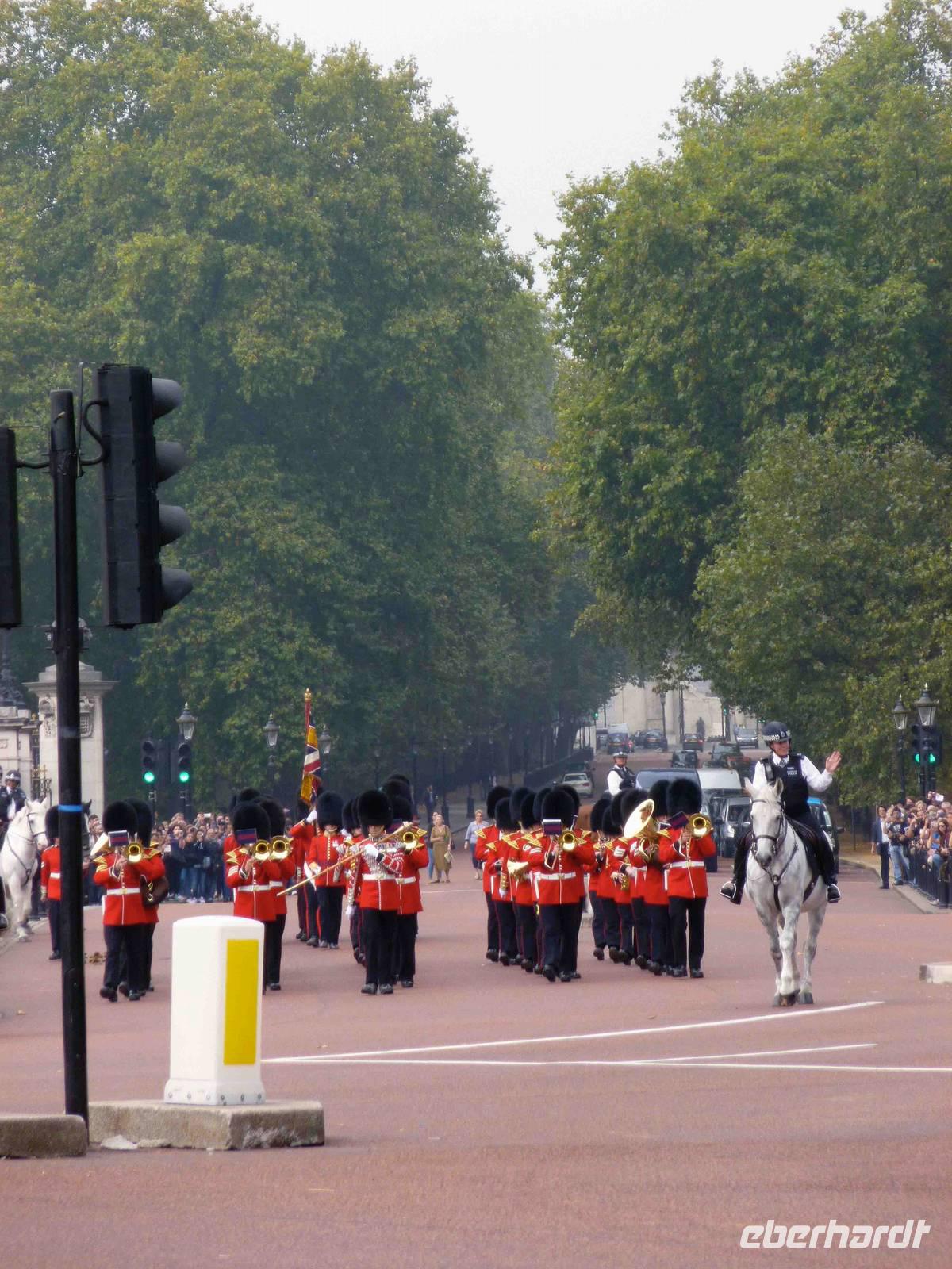 So bezogen wir rechtzeitig günstige Plätze zum Fotografieren und staunten, wie die Bobbies bei laufendem Verkehr Wachsoldaten, Leibgarde, Musik-Kapellen sicher und unaufwendig zum Palast und zurück geleiteten, Hut ab!