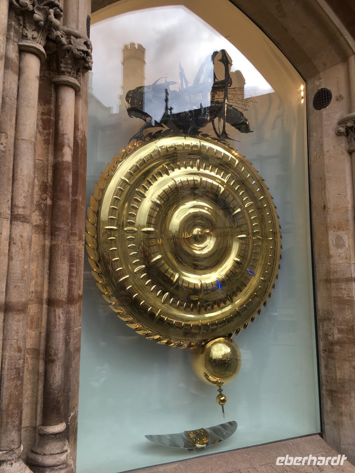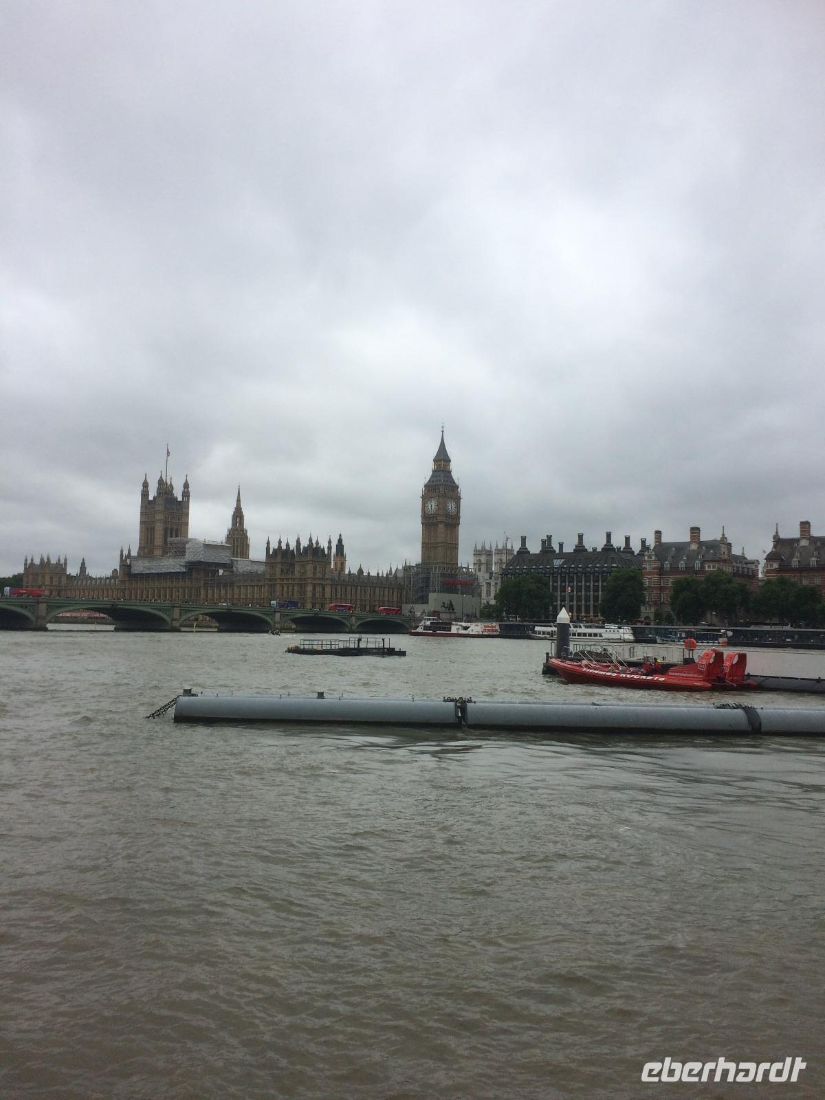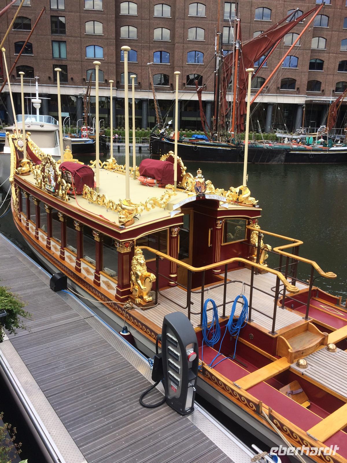 Ein letztes englisches Frühstück erwartete uns. Dann spazierten wir noch einmal über die Themse Brücke hinüber. Viele besichtigten die Belfast, ein Kriegsschiff, andere liefen zu St. Pauls und nahmen am Gottesdienst teil. Schnell noch zur Royal Barge, das königliche Ruderboot, das die Queen „Gloriana" taufte und zu ihrem Diamantenen Jubiläum 2012 verwendete. Es lag hinter unserem Hotel in den St. Katherine Docks, wo noch andere interessante Boote ankerten. Die olympische Flagge wurde auch mit diesem vergoldeten Ruderboot auf der Themse befördert.
