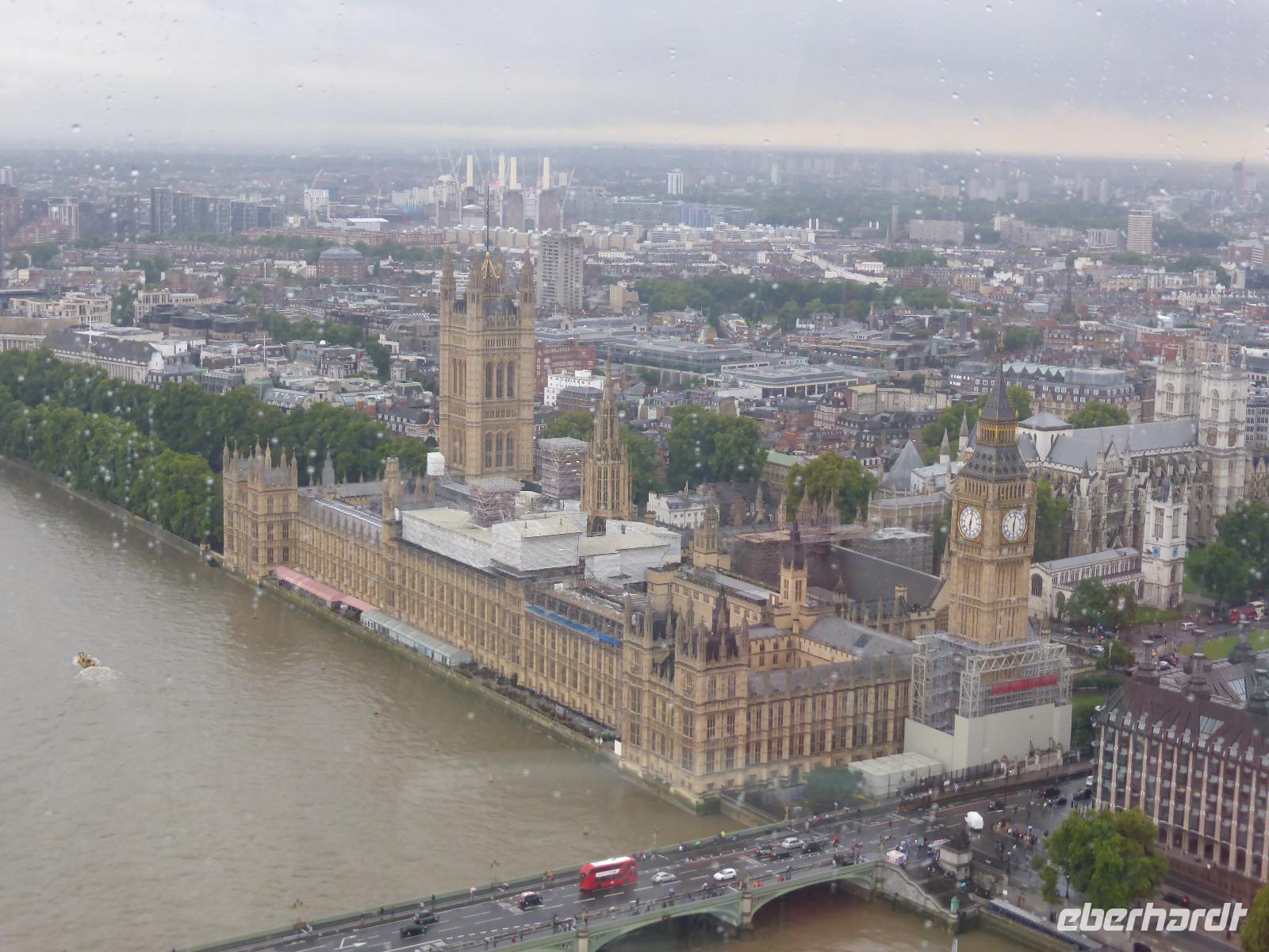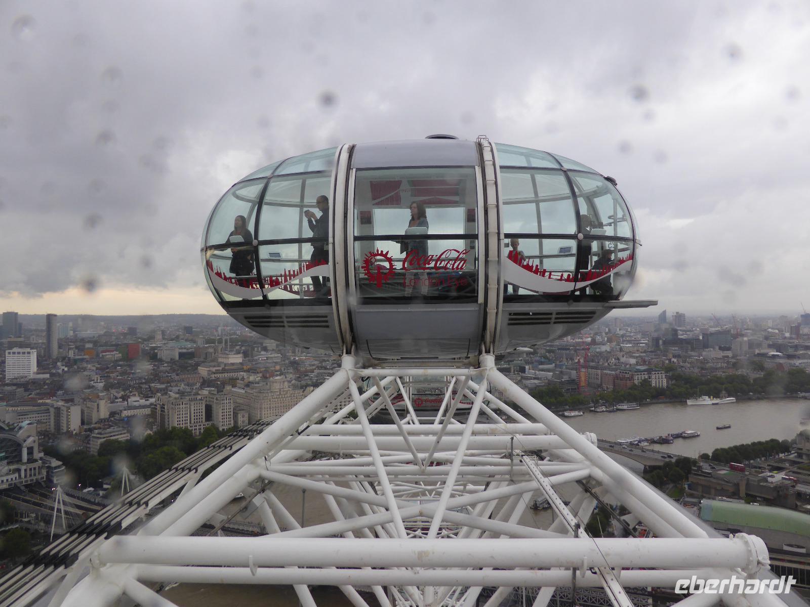 Das London Eye ist ein 135 m hohes Riesenrad, welches zu den Millenniumsfeierlichkeiten 2000 eröffnet und schnell zum Wahrzeichen Londons wurde. Leider hatten wir keine gute Sicht und leichten Regen, sodass wir nur die Sehenswürdigkeiten in der nähern Umgebung erkennen konnten. Die oft gepriesene Fernsicht blieb uns leider verwehrt. Trotzdem genossen wir die 30minütige Fahrt und den ersten Eindruck von London.