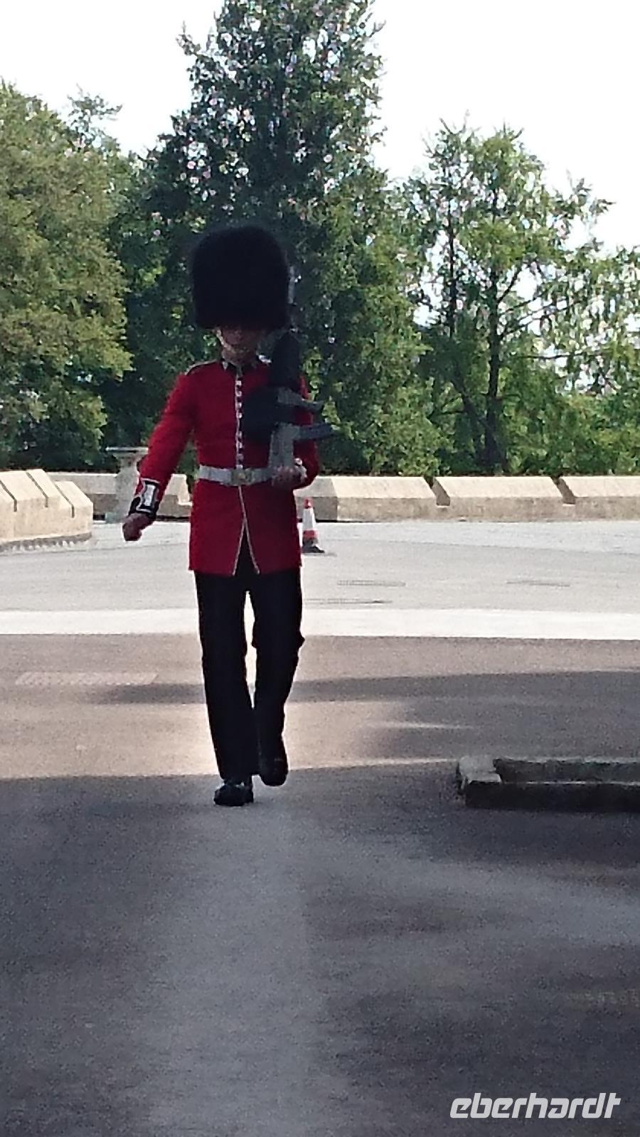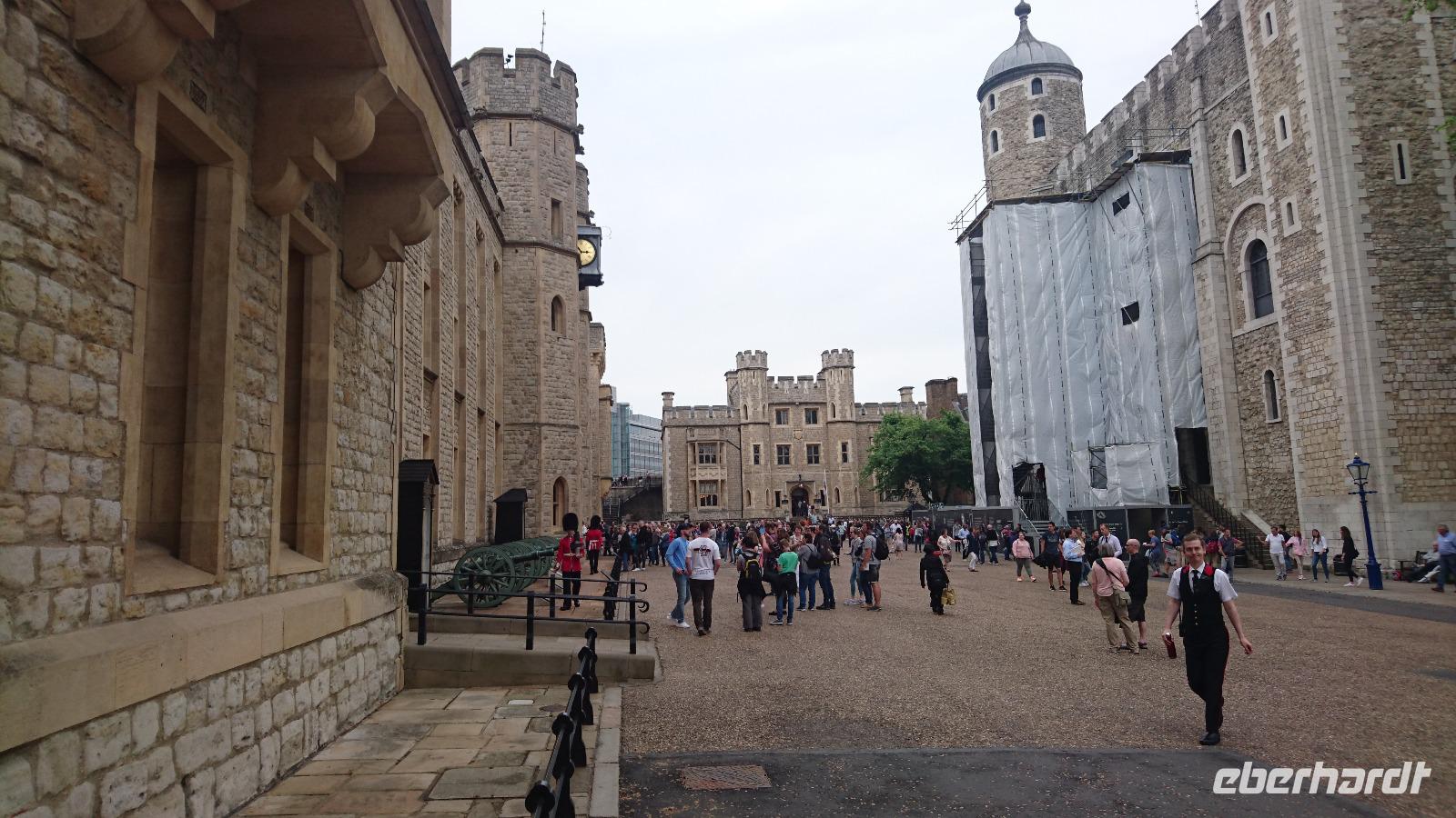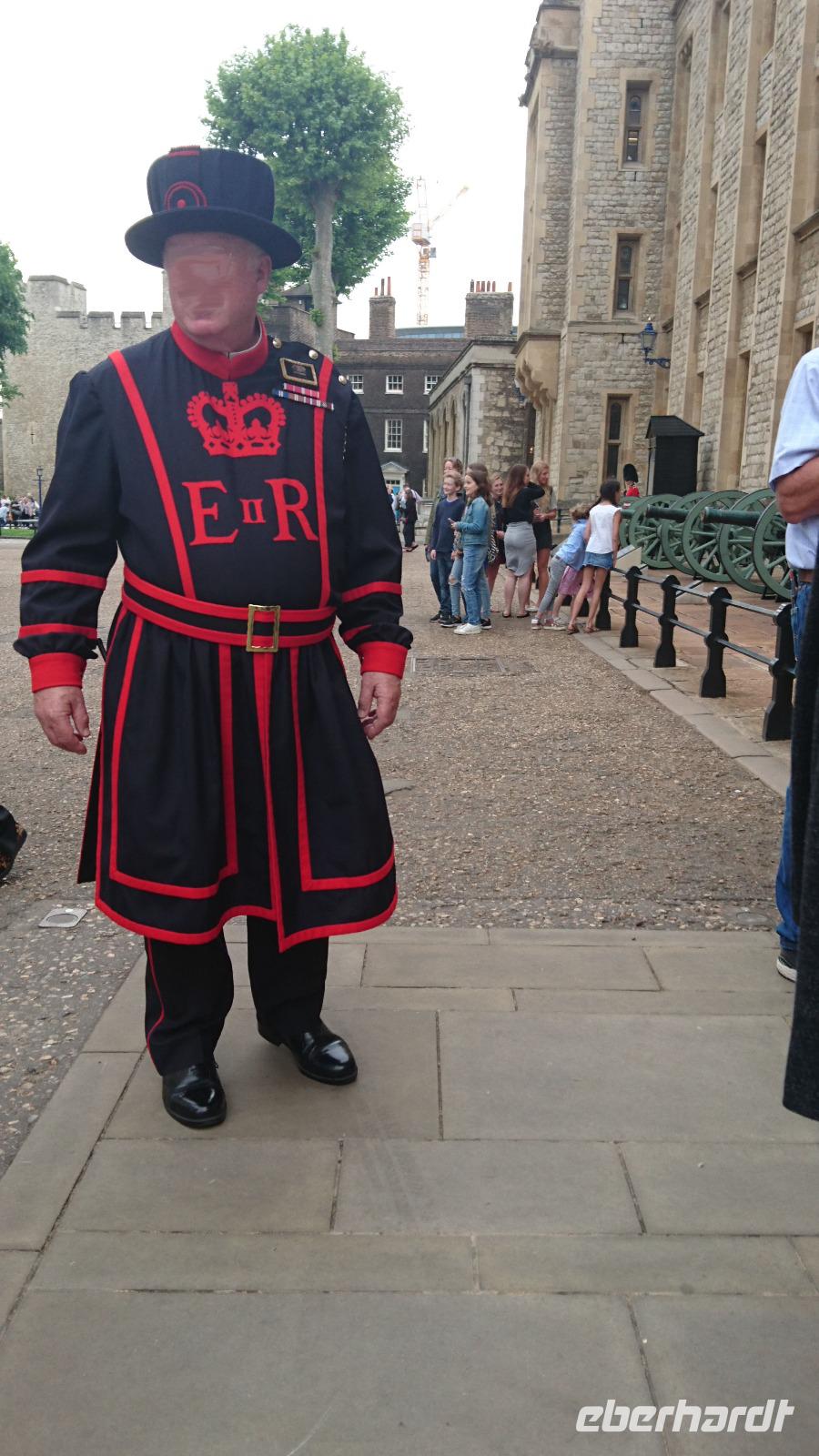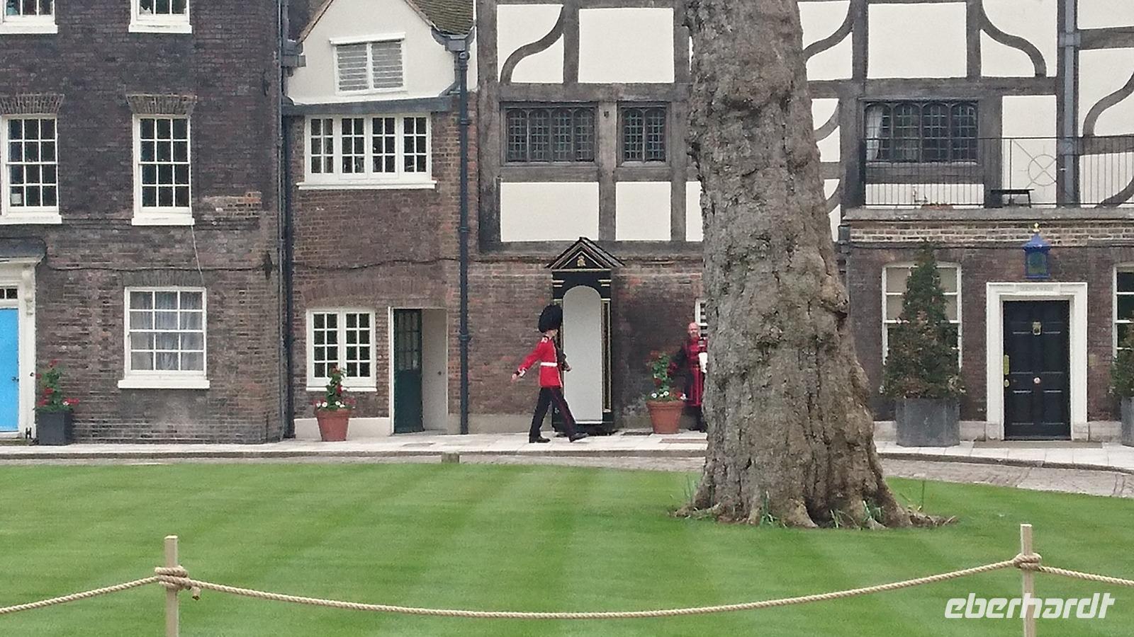 Nach einem Frühstück trafen wir Stefan und unseren englischen Bus am Hotel und fuhren nach Westminster zu „Victoria Embankment", spazierten zuerst zur Zentrale der „New Scotland Yard", wo natürlich Fotos entstehen mussten, weil das sich dort langsam drehende Logo der Polizeibehörde ja zum Beispiel aus den alten „Edgar-Wallace-Filmen" in schwarz-weiß bekannt war. Dann ging es zum nächsten Fototermin hinüber zur „Downing Street No. 10" und weiter zu den „Horse Guards", von da dann direkt in den „St. James Park". Die Gegensätze von Häuserschluchten verschiedenster Baustile und Architekturmerkmale und ruhigen Parkzonen wurden uns wieder einmal deutlich. Durch den Park, entlang an Seen und vielen Seevögeln ging es zu „The Mall" und wir erhaschten einen ersten Blick zum „Buckingham Palace" an diesem Morgen. Am Palast angekommen machten wir uns Zeit und Ort unseres Wiedersehens aus und suchten uns gute Sichtplätze für die täglich stattfindende große Wachablösung. Die einzelnen Garden kamen mit lauter Musik zu Fuß oder hoch zu Ross zum Palastvorplatz und „changing of the guard" konnte beginnen. Anschließend und nach vielen interessanten Eindrücken vom militärischen Drill der Garde ging es mit Stefan zur „Pall Mall", einer Straße am „St. James Palace", wo wir bald wieder auf unseren Bus trafen. Die kurze Wartezeit, die wir bei allen Treffen mit unserem fahrbaren Untersatz in Kauf nehmen mussten, konnten wir beim verkehrsmäßig aufgrund Hauptstadtflair, Pfingsten und Hochzeitsbesuchern stets verstopften Straßensystem Londons gut verstehen und Stefan stand stets mit dem jeweiligen Fahrer in telefonischer Verbindung, sodass wir in etwa einschätzen konnten, wann es weiter geht. Nun fuhren wir also zum „Tower of London" und damit zur Schatzkammer der Queen, aber auch einem architektonischen und geschichtlichen Zeugnis der militärischen Vormachtstellungs-Vergangenheit des Vereinigten Königreiches. Nachdem wir von Stefan unsere Eintrittskarten erhielten, ging es hinein in die Geschichte der Stadt. Staunend sahen wir die kostbaren Schätze, die dicken Mauern darum herum, die einzelnen Ausstellungen und die bunt angezogenen „Beefeater" sowie die berühmten Raben des „Tower of London". Jeder konnte sich zeit nehmen, wie er wollte, um den Tower zu besichtigen. Ein paar unserer Gäste hatten einen Besuch bei „Madam Tussaud" gebucht. Dabei ging leider etwas schief. Die Ausstellung wird privat geführt und änderte kurzfristig ihre Öffnungszeiten, ohne die Gäste oder die Tickets vertreibenden Agenturen darüber zu informieren, wodurch einige schon, andere jedoch leider nicht ihr Ticket einlösen und die Wachsfiguren besuchen konnten. Das war schade, doch wir blieben guter Dinge, denn wir sahen und erfuhren bereits soviel in und über London, dass wir uns davon die Laune nicht verderben ließen. Den Nachmittag und Abend des Tages nutzten wir nun für individuelle Erkundungen in London und für ein gutes Abendessen wo es uns auf unseren Erkundungen am Besten gefiel, ehe wir uns für den kommenden Tag ausruhten.