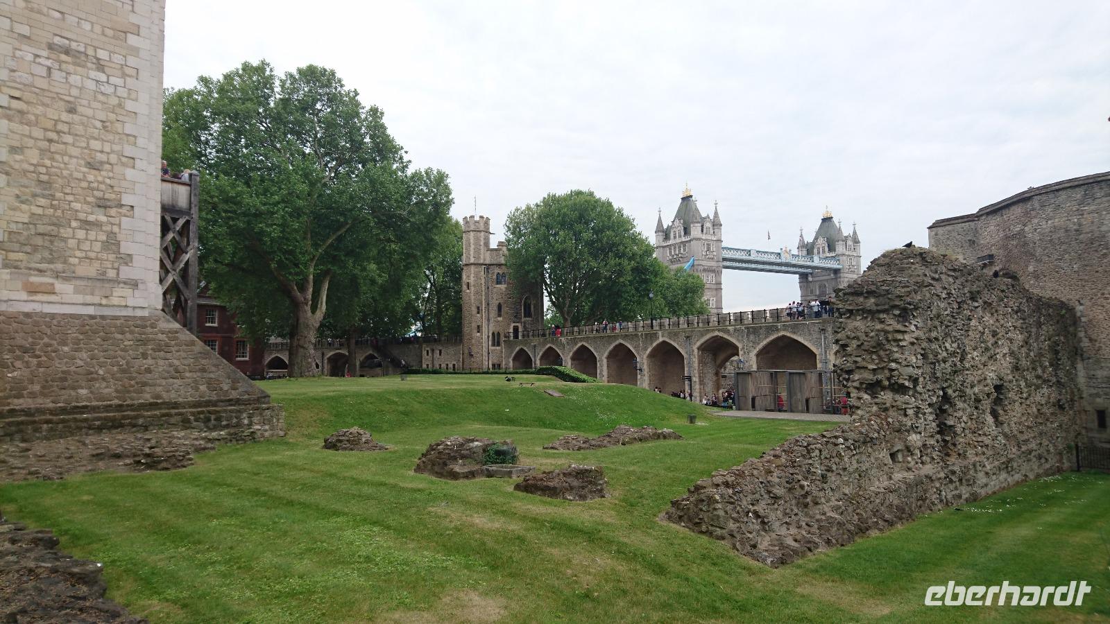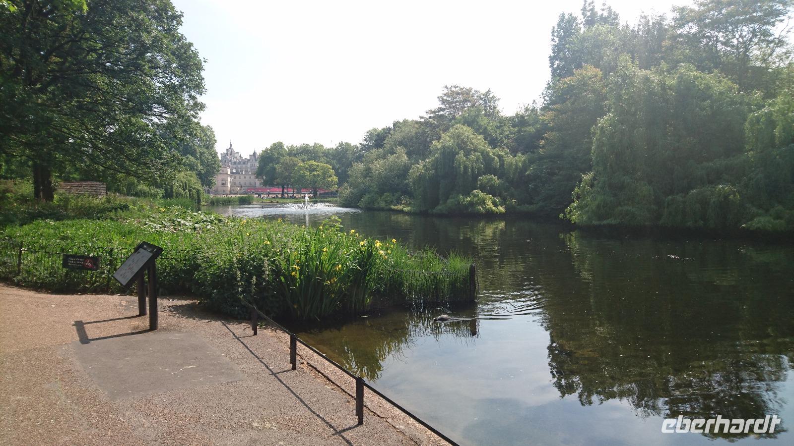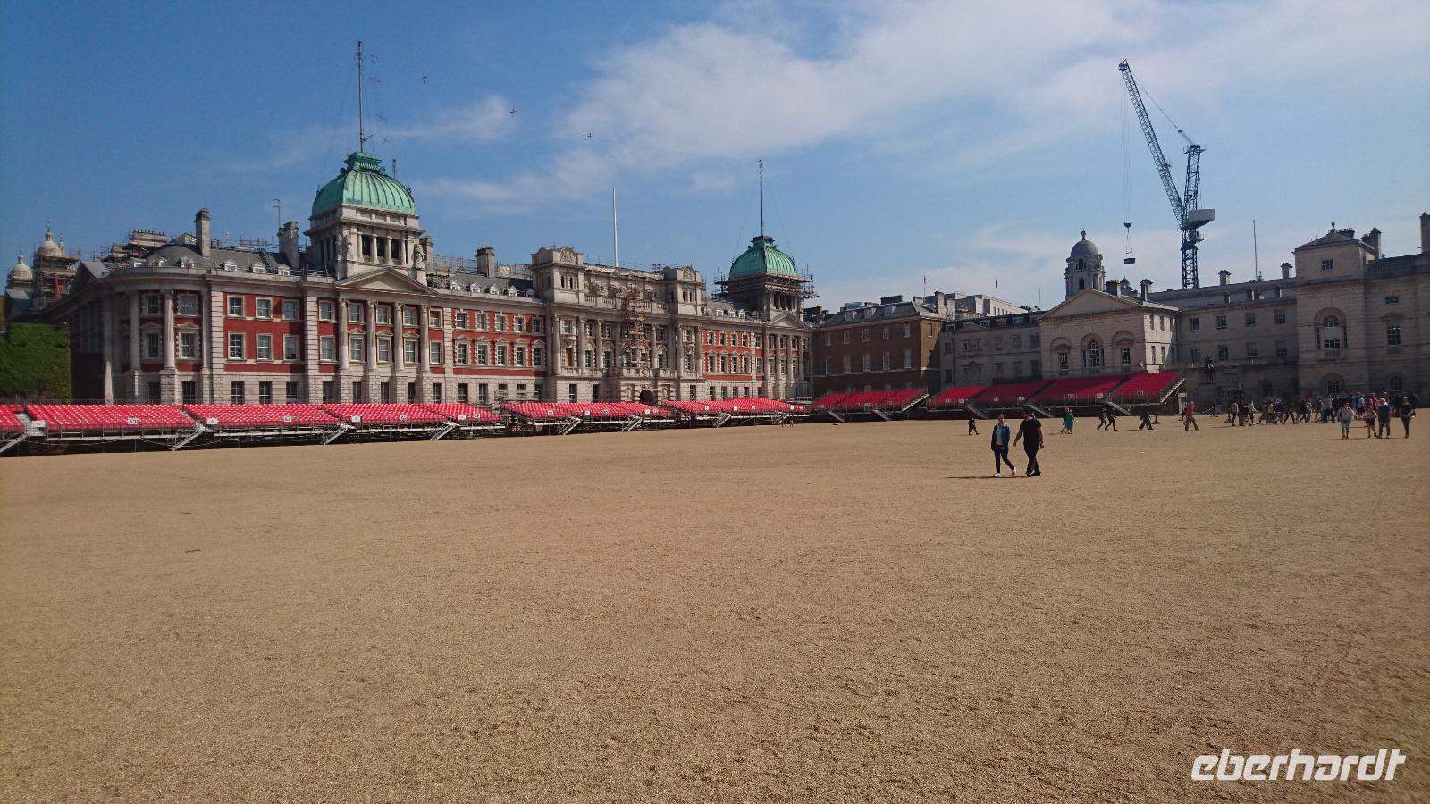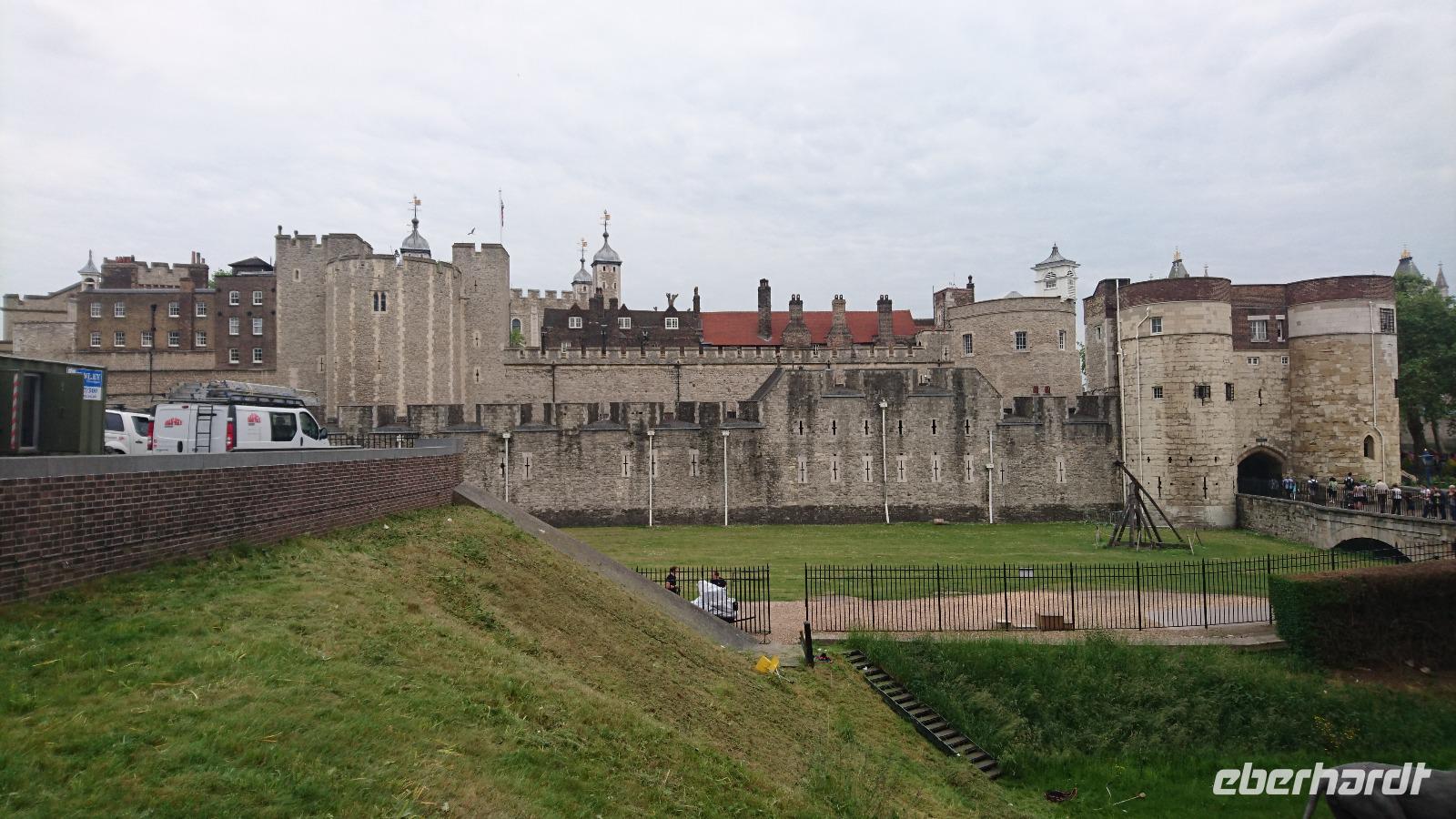 Nach einem Frühstück trafen wir Stefan und unseren englischen Bus am Hotel und fuhren nach Westminster zu „Victoria Embankment", spazierten zuerst zur Zentrale der „New Scotland Yard", wo natürlich Fotos entstehen mussten, weil das sich dort langsam drehende Logo der Polizeibehörde ja zum Beispiel aus den alten „Edgar-Wallace-Filmen" in schwarz-weiß bekannt war. Dann ging es zum nächsten Fototermin hinüber zur „Downing Street No. 10" und weiter zu den „Horse Guards", von da dann direkt in den „St. James Park". Die Gegensätze von Häuserschluchten verschiedenster Baustile und Architekturmerkmale und ruhigen Parkzonen wurden uns wieder einmal deutlich. Durch den Park, entlang an Seen und vielen Seevögeln ging es zu „The Mall" und wir erhaschten einen ersten Blick zum „Buckingham Palace" an diesem Morgen. Am Palast angekommen machten wir uns Zeit und Ort unseres Wiedersehens aus und suchten uns gute Sichtplätze für die täglich stattfindende große Wachablösung. Die einzelnen Garden kamen mit lauter Musik zu Fuß oder hoch zu Ross zum Palastvorplatz und „changing of the guard" konnte beginnen. Anschließend und nach vielen interessanten Eindrücken vom militärischen Drill der Garde ging es mit Stefan zur „Pall Mall", einer Straße am „St. James Palace", wo wir bald wieder auf unseren Bus trafen. Die kurze Wartezeit, die wir bei allen Treffen mit unserem fahrbaren Untersatz in Kauf nehmen mussten, konnten wir beim verkehrsmäßig aufgrund Hauptstadtflair, Pfingsten und Hochzeitsbesuchern stets verstopften Straßensystem Londons gut verstehen und Stefan stand stets mit dem jeweiligen Fahrer in telefonischer Verbindung, sodass wir in etwa einschätzen konnten, wann es weiter geht. Nun fuhren wir also zum „Tower of London" und damit zur Schatzkammer der Queen, aber auch einem architektonischen und geschichtlichen Zeugnis der militärischen Vormachtstellungs-Vergangenheit des Vereinigten Königreiches. Nachdem wir von Stefan unsere Eintrittskarten erhielten, ging es hinein in die Geschichte der Stadt. Staunend sahen wir die kostbaren Schätze, die dicken Mauern darum herum, die einzelnen Ausstellungen und die bunt angezogenen „Beefeater" sowie die berühmten Raben des „Tower of London". Jeder konnte sich zeit nehmen, wie er wollte, um den Tower zu besichtigen. Ein paar unserer Gäste hatten einen Besuch bei „Madam Tussaud" gebucht. Dabei ging leider etwas schief. Die Ausstellung wird privat geführt und änderte kurzfristig ihre Öffnungszeiten, ohne die Gäste oder die Tickets vertreibenden Agenturen darüber zu informieren, wodurch einige schon, andere jedoch leider nicht ihr Ticket einlösen und die Wachsfiguren besuchen konnten. Das war schade, doch wir blieben guter Dinge, denn wir sahen und erfuhren bereits soviel in und über London, dass wir uns davon die Laune nicht verderben ließen. Den Nachmittag und Abend des Tages nutzten wir nun für individuelle Erkundungen in London und für ein gutes Abendessen wo es uns auf unseren Erkundungen am Besten gefiel, ehe wir uns für den kommenden Tag ausruhten.