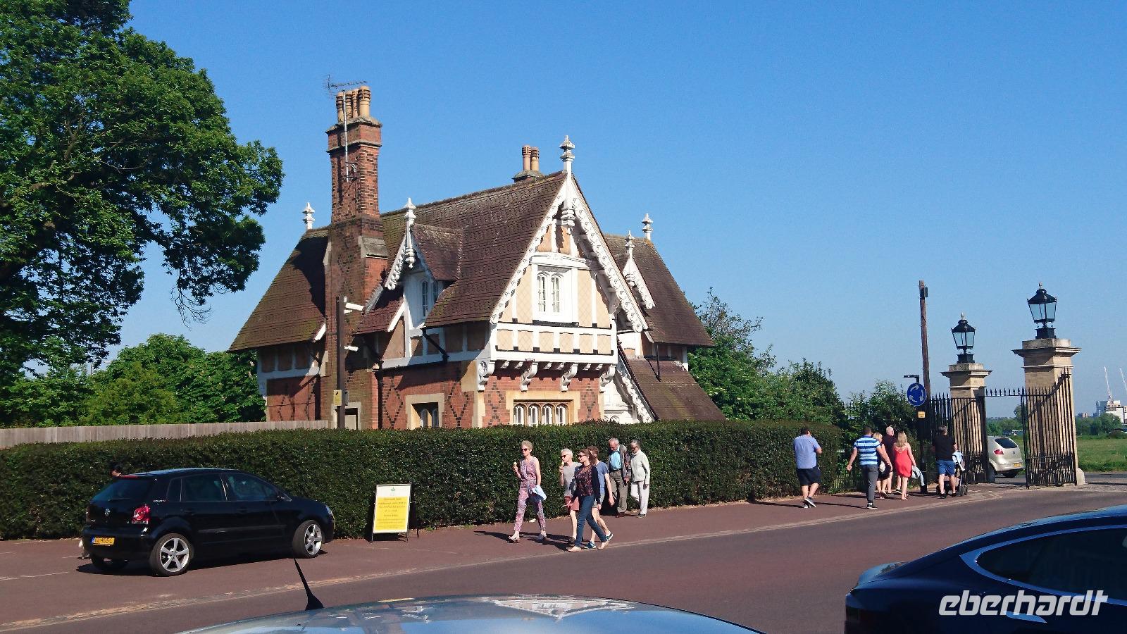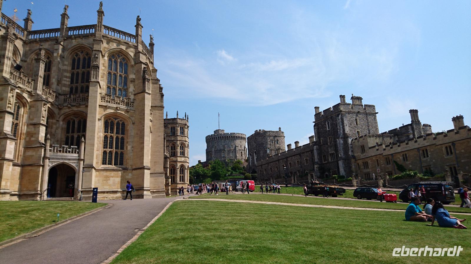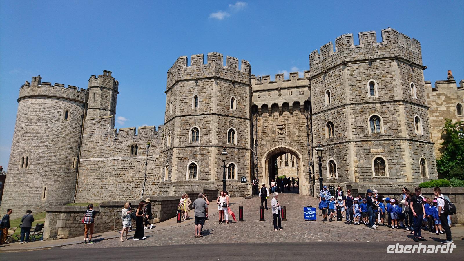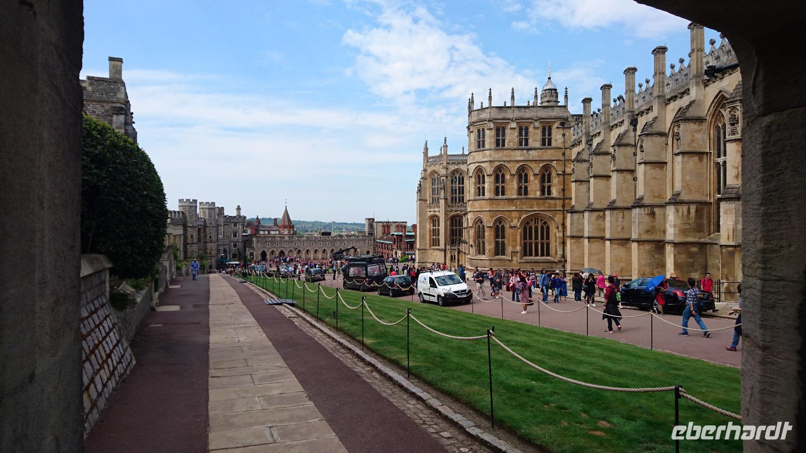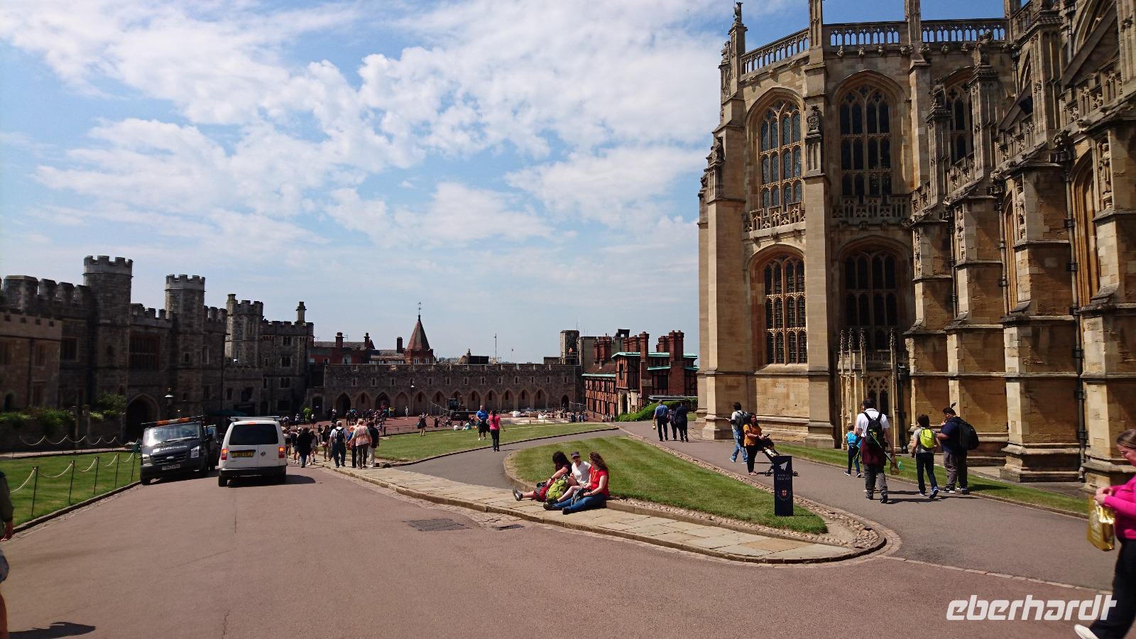 Am Vormittag trafen sich alle Windsor-Besucher wieder an der Rezeption, andere unternahmen bereits eigene Touren durch London oder hatten andere Pläne. Unser Bus fuhr dann durch den morgendlichen Verkehr durch die Innenstadt und dann zur Autobahn in Richtung „London Heathrow" und weiter nach Windsor. Natürlich sahen wir hier schon bei unserer Ankunft, wie viele Menschen wohl zur Hochzeit vor drei Tagen hier gewesen sein mussten und wie man diese, aber auch die königliche Familie und deren Gäste absicherte. Wir spazierten zum Eingang des Castle und besuchten dieses mit Audioguides, konnten, da die königliche Familie gerade in London weilte, alle zugänglichen Räume sehen, was nicht immer der Fall ist, und staunten über königliche Gemächer, royales Spielzeug, dicke Mauern, unendlich viele Räume, grüne Oasen zwischen den alten Steinen und Unmengen von Besuchern, die jedoch aufgrund der Weitläufigkeit in „Windsor Castle" nicht weiter störten. Jeder gestaltete sich seinen Schlossbesuch individuell, wer wollte, besuchte danach noch den kleinen Ort Windsor mit seinem Rathaus, in dem der „Prince of Wales" und Lady Camilla einst heirateten, dem alten Bahnhof, in dem man die Lokomotive des Regierungszuges von „Queen Victoria" bestaunen konnte, und den vielen Souvenirgeschäften, aber auch bunt angezogenen Damen auf den Straßen, welche die „Lustigen Weiber von Windsor" von William Shakespeare darstellen wollten. Später trafen wir uns fast alle für einen Spaziergang mit Stefan nach Eton. Leider war das „Eton College" aufgrund gerade laufender Prüfungen für die Öffentlichkeit geschlossen, doch Stefan zeigte und alte Häuser, schön gestaltete Gärten und Gassen und lud uns darauf noch in den zünftigen alten Eton-Pub „The George" auf ein Getränk unserer Wahl ein. Dabei sprachen wir gern über die vielen schönen Erlebnisse unserer Reise. Später spazierten wir wieder über die Themsebrücke zurück nach Windsor uns fuhren darauf mit unserem Bus zurück nach London, um noch einen Abend individuell gier zu verbringen und doch schon unsere Koffer zu packen. Dann wollten wir uns noch einmal ausruhen für den nächsten Tag.