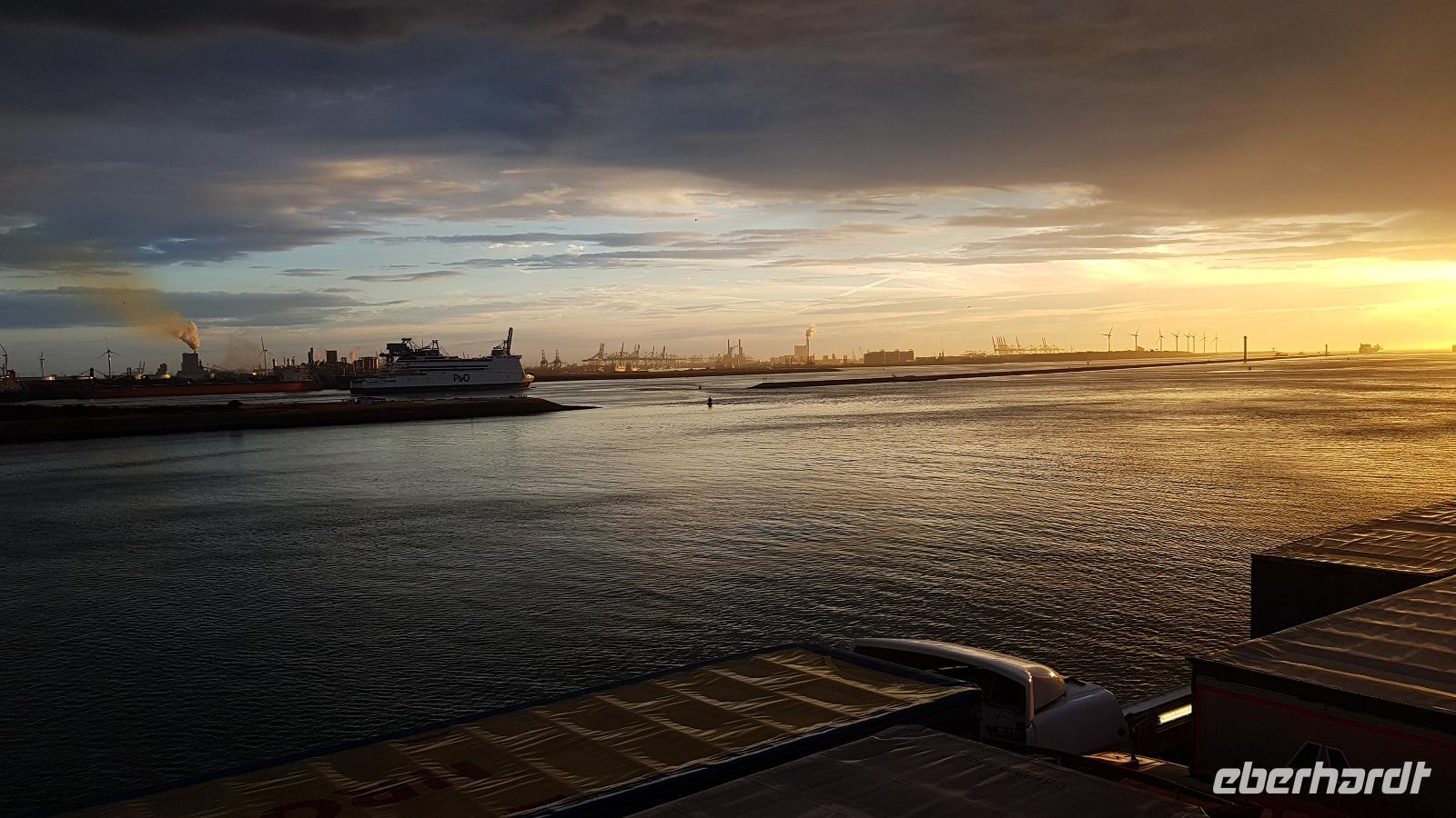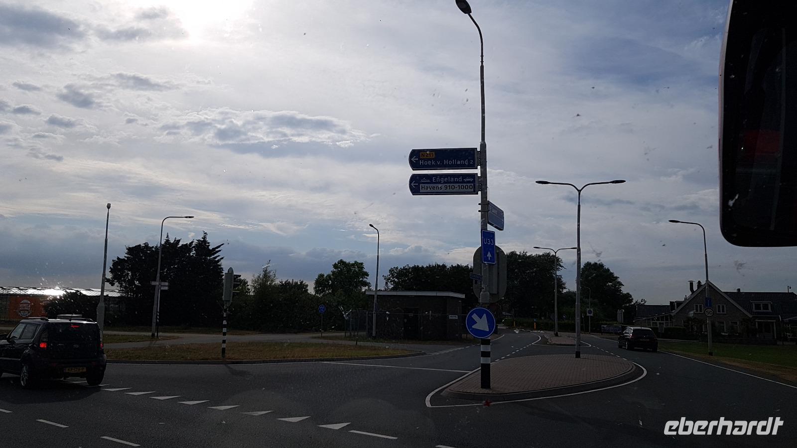 16 reiselustige Gäste machten sich ab dem frühen Morgen ab Dresden auf den Weg nach Hoek van Holland. Hier wartete unsere Fähre der Stena Line um uns sicher nach Harwich zu bringen. Via Meerane, Rasthof Teufelstal und Gotha steigen Gäste zu und nach den obligatorischen Pausen in Hessisch Lichtenau beim Tischlein-Deck-Dich, dem Rasthof am Haarstrang mit zünftigem Bordservice und einem Tank-Stopp in Isselburg erreichten wir am frühen Abend unser Fähr-Terminal. Noch konnten wir nicht einchecken, deshalb warteten wir lieber drinnen- draußen war es mit mehr als 35 °C mehr als unangenehm warm und niemand hatte Lust, noch ein wenig spazieren zu gehen. Wie verlockend da die Aussicht, dass es in London mindestens 10 Grad weniger heiß ist als für Deutschland gemeldet. Doch schon hieß es Tickets in Empfang nehmen, Passkontrolle passieren und auf der Fähre die Kabinen beziehen. Kurze Zeit später trafen wir uns am Service-Desk, unser Dinner war vorbereitet und so gingen wir gemeinsam zum "Metropolitan" um unser 3-Gang-Menü zu genießen. Hmmm. Sehr lecker! Wir waren schon längst fertig, da kämpfte sich auch unser Busfahrer Roy durch- er mußte bis zuletzt warten mit seinem Bus um auf die Fähre fahren zu dürfen...wenigstens konnte er noch in der Fahrer-Lounge essen gehen. Die meisten von uns genossen einen traumhaften Sonnenuntergang an Bord bevor gegen 22 Uhr unsere Fähre ablegte und uns Richtung "Engeland" brachte. (So war die Fähre in Hoek van Holland ausgeschildert)