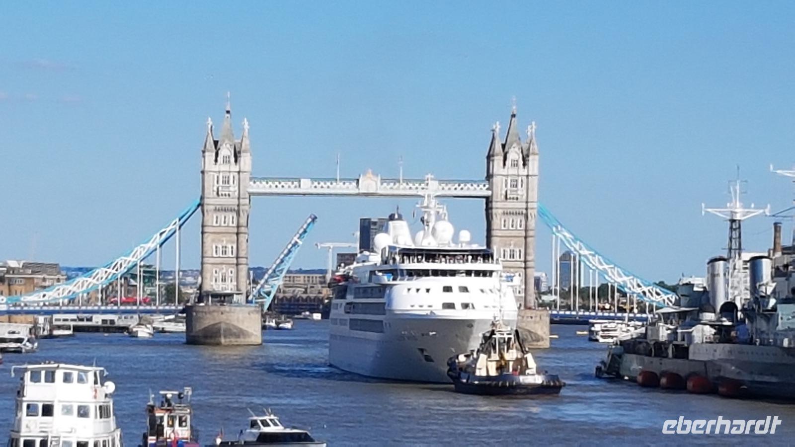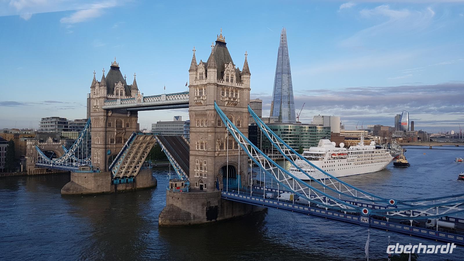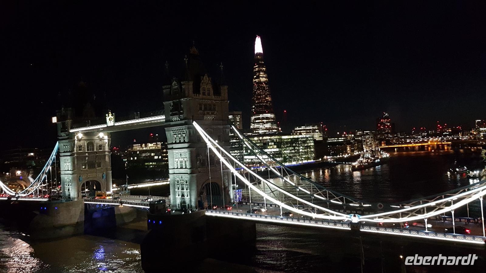 Für unsere Fluggäste geht es zeitig los, der Bus zum Flughafen ist pünktlich 07:30 Uhr da und abfahrtbereit. Ohne Probleme erreichen alle ihre Zielflüghäfen in Berlin, Dresden, Leipzig oder Stuttgart. Zwei Familien haben noch Aufschub, sie fliegen erst am Nachmittag, ihr Transfer kommt ebenfalls pünktlich 13:00 Uhr. Alle Bus-Gäste haben den ganzen Tag zur Verfügung, um noch einmal die Sehenswürdigkeiten anzuschauen, die sie bis dato noch nicht geschafft hatten. Und so stehen heute sowohl die St. Pauls Kathedrale als auch die Tower Bridge Experience auf dem Plan, genauso wir Harrods oder Millenium Bridge. Dank der Travel Cards, die alle erhalten hatten können sie ja alle öffentlichen Verkehrmittel nutzen, so oft sie wollen. Manche schauen auch dem mittelalterlichen Treiben in und um den Tower herum zu, heute und morgen findet hier das jährliche Tower-Fest satt, dieses Jahr unter dem Motto: Willkommen Königin Anne. Um 16 Uhr treffen wir uns am Hotel, laden unsere Koffer in den Bus und los geht es Richtung Harwich zur Fähre. Ein letztes Mal genießen wir die Fahrt durch London und ohne Staus erreichen wir unseren Fährhafen. Check In und Koffer- sowie Personenkontrollen sind kein Problem und wir können an Bord unsere Kabinen beziehen. Im Metropolitan Restaurant erwartet uns ein leckeres 3-Gang-Menü, wir stellen unsere Uhren wieder auf mitteleuropäische Sommerzeit vor und genießen den Anblick des Hafens bei Nacht.