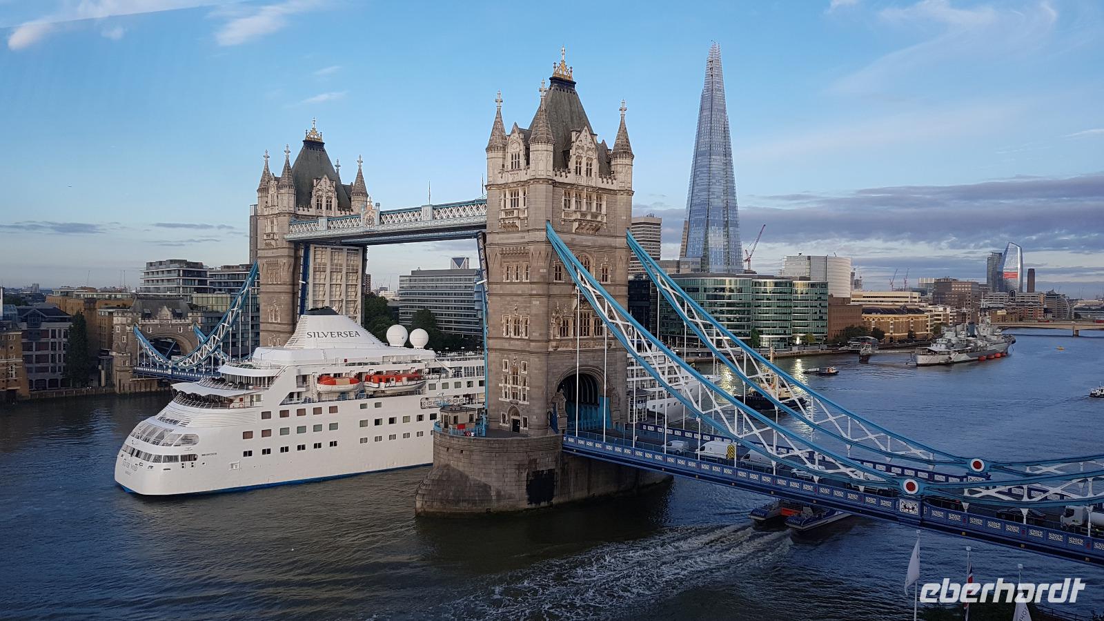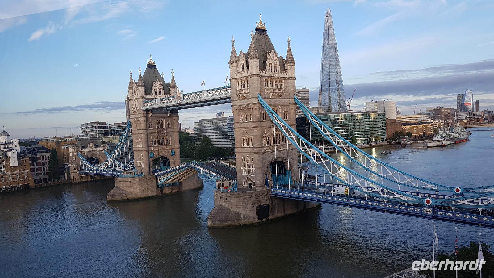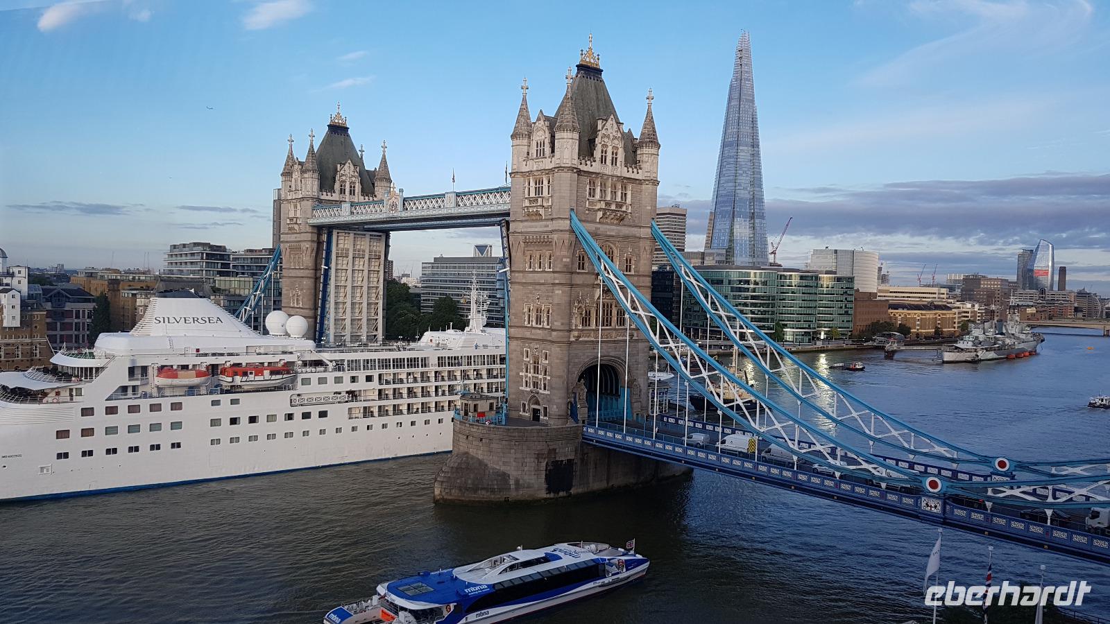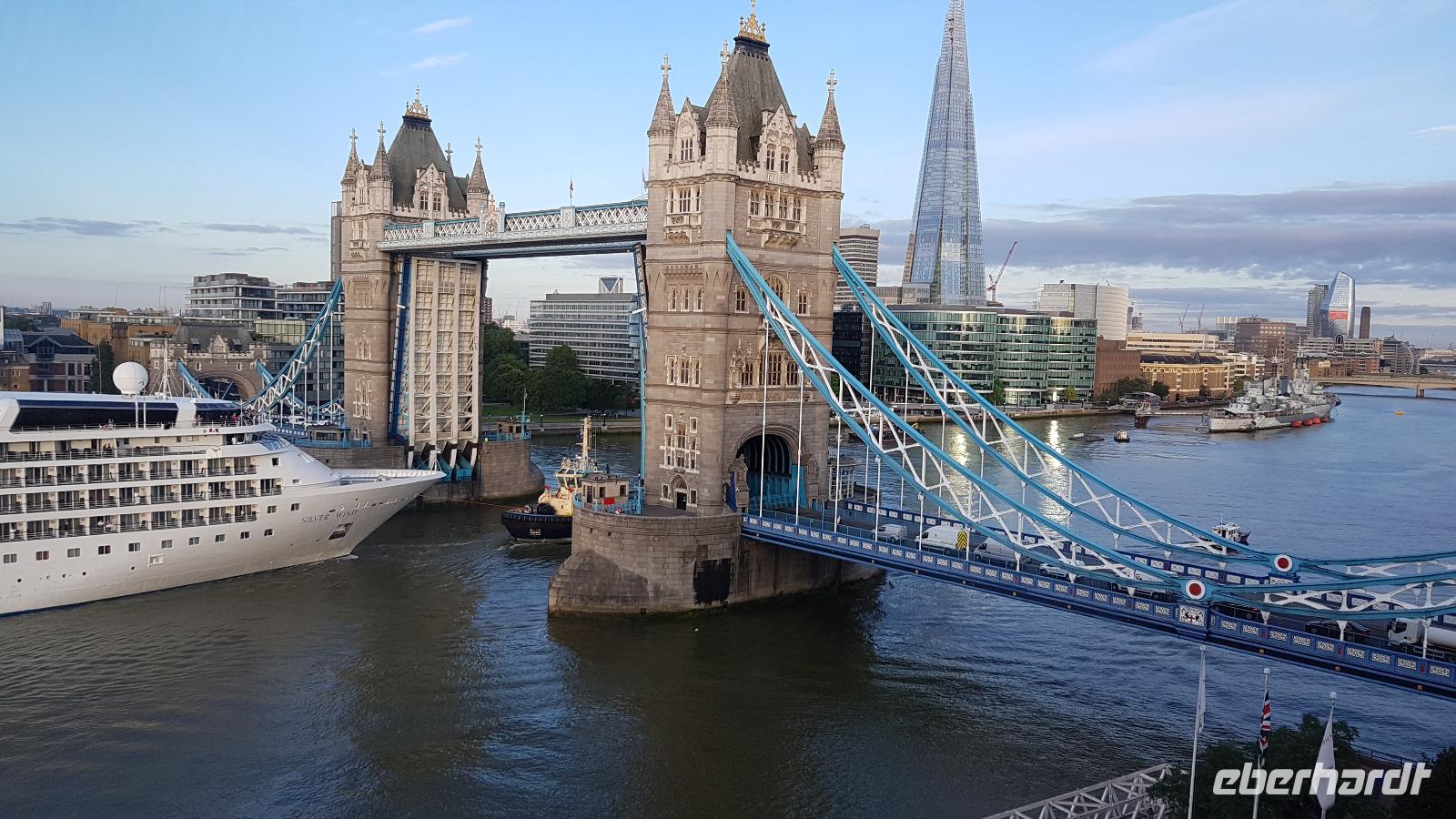 Heute fordert die gestrige Hitze Tribut, ich komme erst 20 Minuten später als geplant zur Gruppe, aber es geht wieder. Gemeinsam machen wir uns mit Monica auf, diese Metropole London besser kennenzulernen. Mit unserem Bus geht es zum Finanzdistrikt, zum Trafalger Square, dem Picadilly Circus, vorbei an Harrods und dem Ritz zum Denkmal für Prince Albert, den Mann von Königin Victoria. Dort machen wir eine kleine Pause und werfen auch einen Blick auf die Royal Albert Hall.Wir passieren das Naturkunde- und das Wissenschaftsmuseum, diese sind wie alle Museen Dank Albert kostenfrei für Besucher. Weiter geht es durch das Viertel der Botschaften bis zu White Hall und 10 Downing Street, dem Sitz der Premierministerin. Vorbei an den Horse-Guards fahren wir schließlich zurück Richtung Tower. Und dann stellen wir fest, dass es tatsächlich schon die letzte gemeinsame Busfahrt war. Nach Windsor fahren morgen nicht alle mit und übermorgen früh fliegen die Flug-Gäste bereits morgens zurück. Also singen wir heute bereits unser Abschieds-Lied: Auld Lang Syne. Schon sind wir am Tower angelangt-den wollen wir heute besuchen, also treffen wir uns am Eingang, jeder erhält Tickets und Übersichtspläne, dann hole ich noch Audio Guides für alle und los geht es. Jeder kann individuell erkunden, was ihn oder sie interessiert, die Kronjuwelen, die Rüstkammer, die Folterkammer, das Tower Green, die Kapelle,...Einige Gäste treffen sich am späten Nachmittag und spazieren zum Shard hinüber, gegen 17 Uhr können sie im 65. Stockwerk eine phantastische Aussicht genießen. Viele verfolgen auch gespannt, wie das Kreuzfahrtschiff London verläßt. Es hatte längsseits der HMS Belfast festgemacht. Schlepper ziehen es rückwärts die Themse hinaus und auch die Tower Bridge wird dafür wieder geöffnet. Was für ein Spektakel! Am Abend steht dann für einige ein Musical-Besuch an, andere lassen sich in der hoteleigenen Brasserie wieder mit einem guten Dinner verwöhnen, andere bummeln weiter durch die Stadt. Die untergehende Sonne taucht alles in goldenes Licht- eine tolle Stadt!