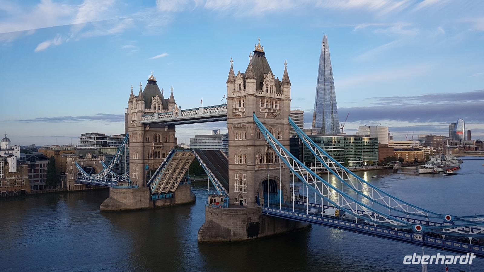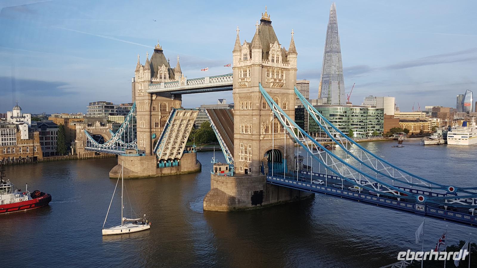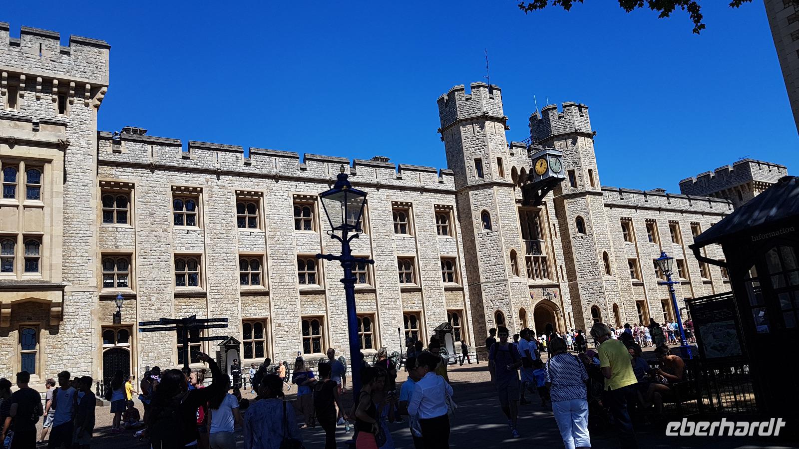 Heute fordert die gestrige Hitze Tribut, ich komme erst 20 Minuten später als geplant zur Gruppe, aber es geht wieder. Gemeinsam machen wir uns mit Monica auf, diese Metropole London besser kennenzulernen. Mit unserem Bus geht es zum Finanzdistrikt, zum Trafalger Square, dem Picadilly Circus, vorbei an Harrods und dem Ritz zum Denkmal für Prince Albert, den Mann von Königin Victoria. Dort machen wir eine kleine Pause und werfen auch einen Blick auf die Royal Albert Hall.Wir passieren das Naturkunde- und das Wissenschaftsmuseum, diese sind wie alle Museen Dank Albert kostenfrei für Besucher. Weiter geht es durch das Viertel der Botschaften bis zu White Hall und 10 Downing Street, dem Sitz der Premierministerin. Vorbei an den Horse-Guards fahren wir schließlich zurück Richtung Tower. Und dann stellen wir fest, dass es tatsächlich schon die letzte gemeinsame Busfahrt war. Nach Windsor fahren morgen nicht alle mit und übermorgen früh fliegen die Flug-Gäste bereits morgens zurück. Also singen wir heute bereits unser Abschieds-Lied: Auld Lang Syne. Schon sind wir am Tower angelangt-den wollen wir heute besuchen, also treffen wir uns am Eingang, jeder erhält Tickets und Übersichtspläne, dann hole ich noch Audio Guides für alle und los geht es. Jeder kann individuell erkunden, was ihn oder sie interessiert, die Kronjuwelen, die Rüstkammer, die Folterkammer, das Tower Green, die Kapelle,...Einige Gäste treffen sich am späten Nachmittag und spazieren zum Shard hinüber, gegen 17 Uhr können sie im 65. Stockwerk eine phantastische Aussicht genießen. Viele verfolgen auch gespannt, wie das Kreuzfahrtschiff London verläßt. Es hatte längsseits der HMS Belfast festgemacht. Schlepper ziehen es rückwärts die Themse hinaus und auch die Tower Bridge wird dafür wieder geöffnet. Was für ein Spektakel! Am Abend steht dann für einige ein Musical-Besuch an, andere lassen sich in der hoteleigenen Brasserie wieder mit einem guten Dinner verwöhnen, andere bummeln weiter durch die Stadt. Die untergehende Sonne taucht alles in goldenes Licht- eine tolle Stadt!