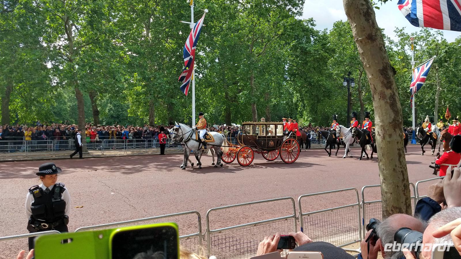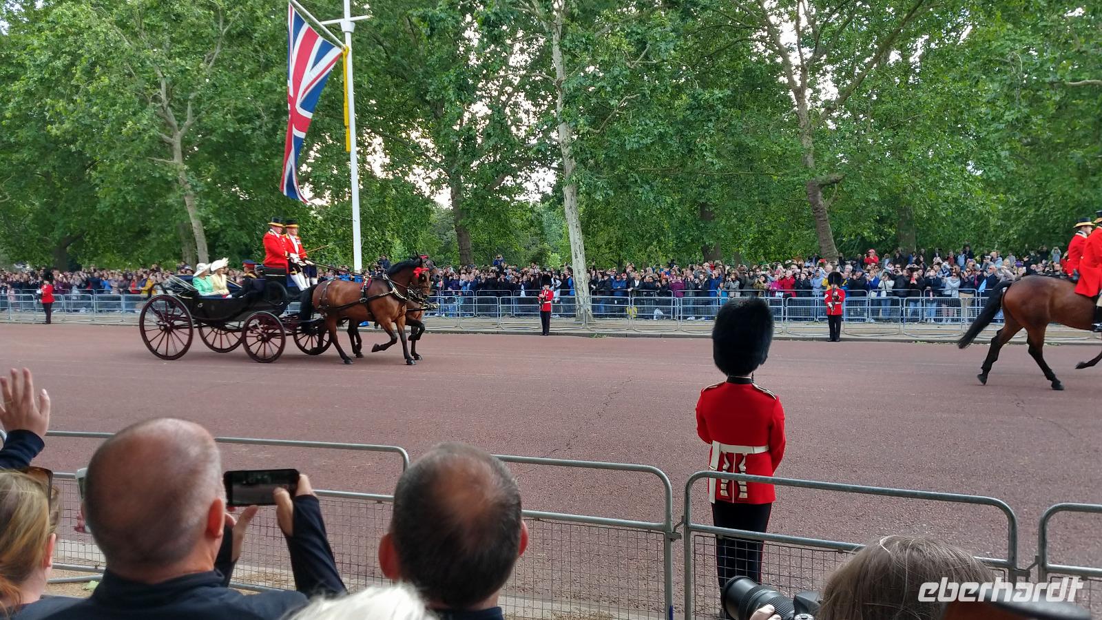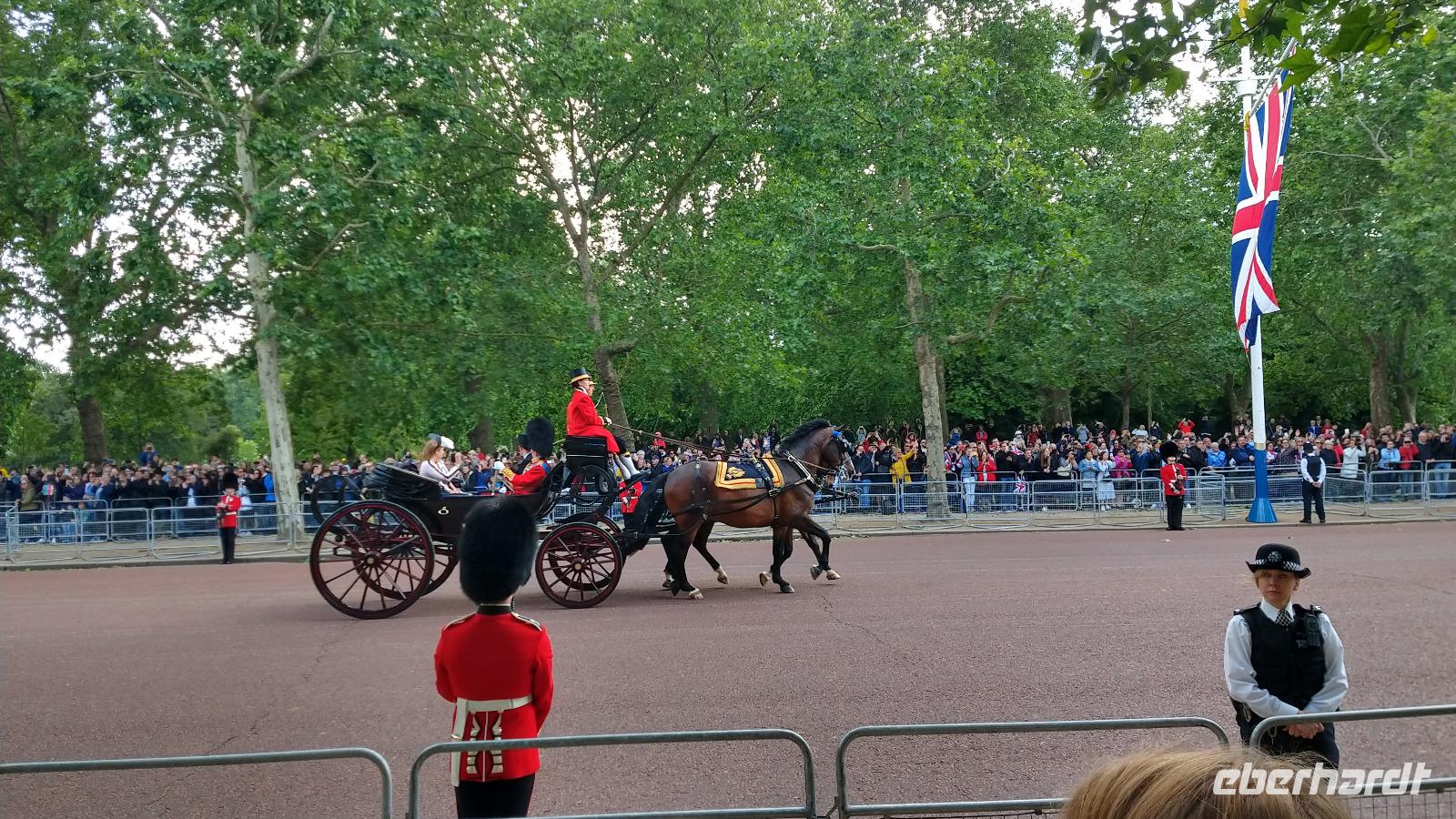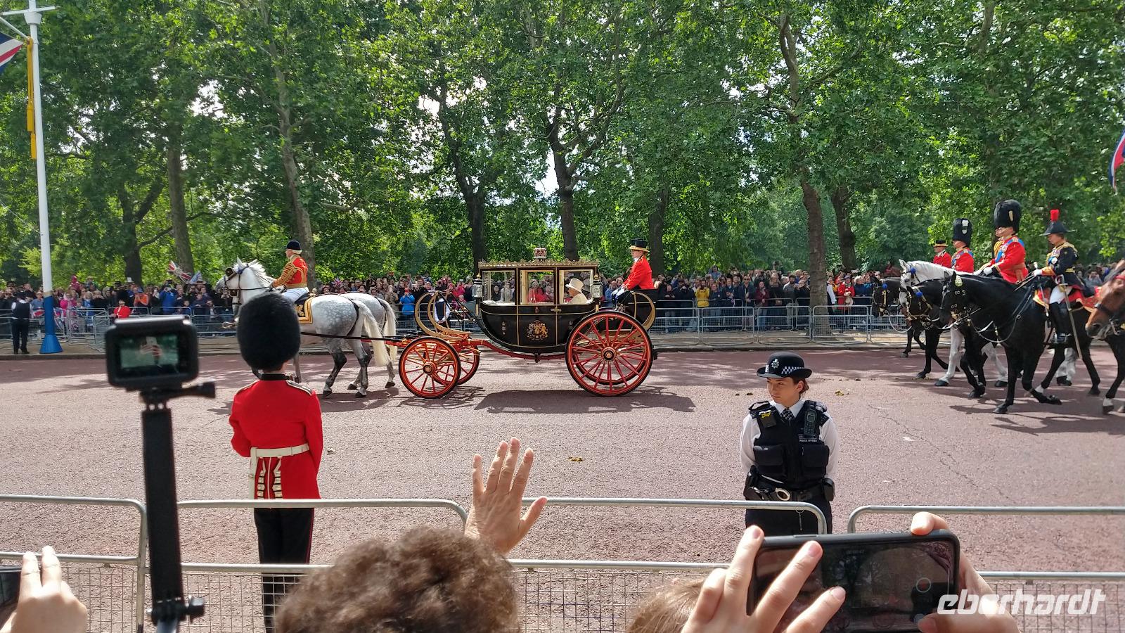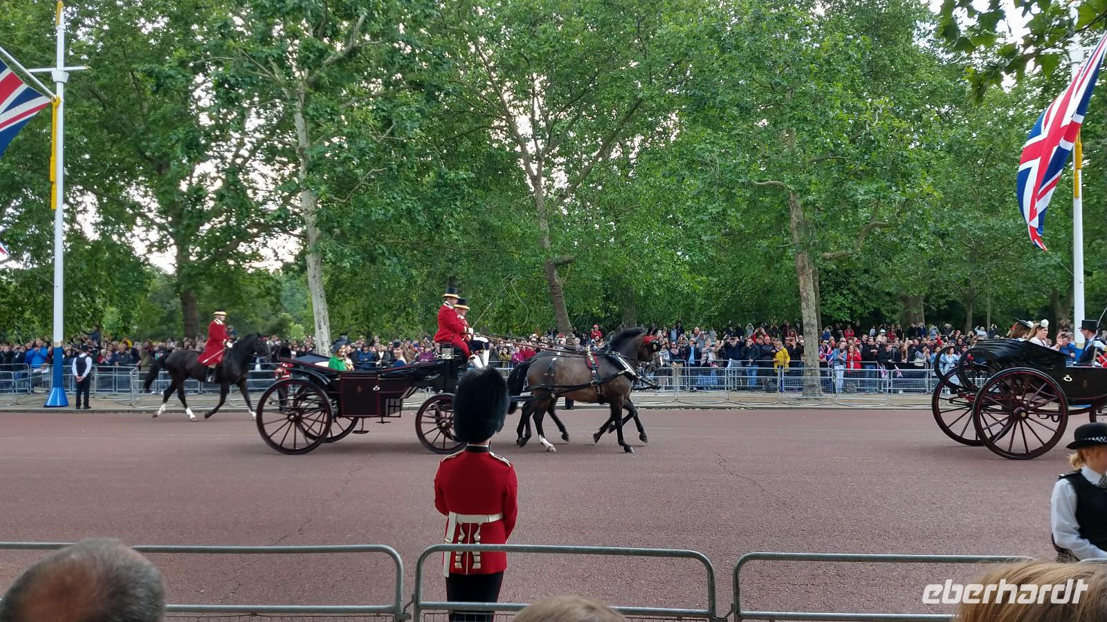 Wir suchen uns geeignete Plätze entlang der Mall für diese Show. Und schon kommen die ersten Regimenter, die Kutschen mit der königlichen Familie und schließlich Queen Elizabeth II. Dann heißt es warten, während des Appells.