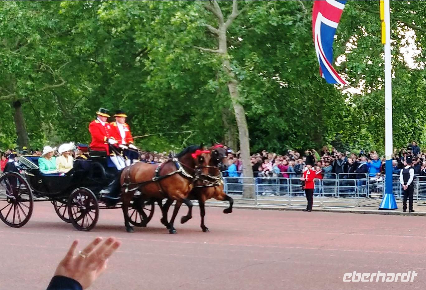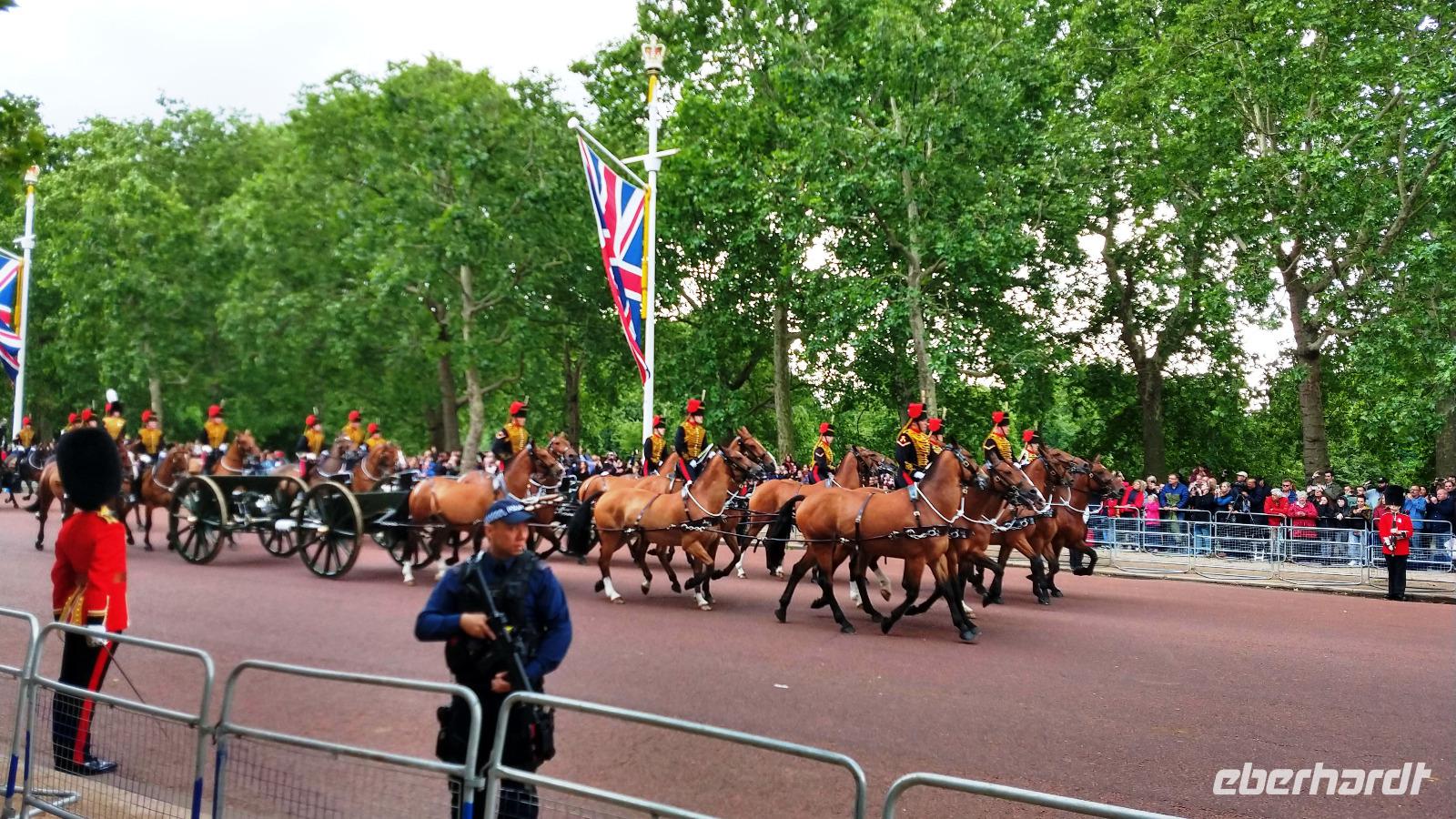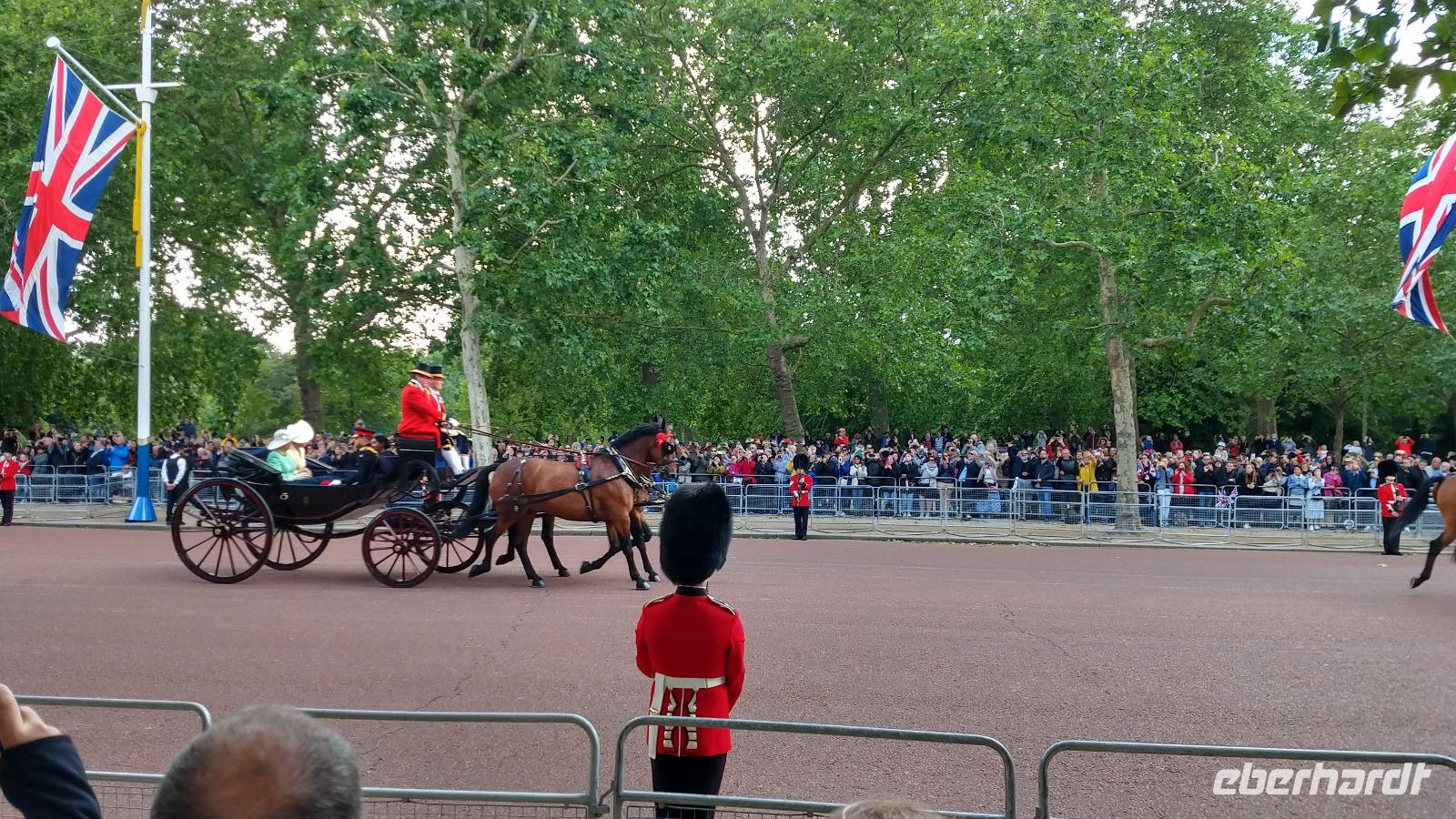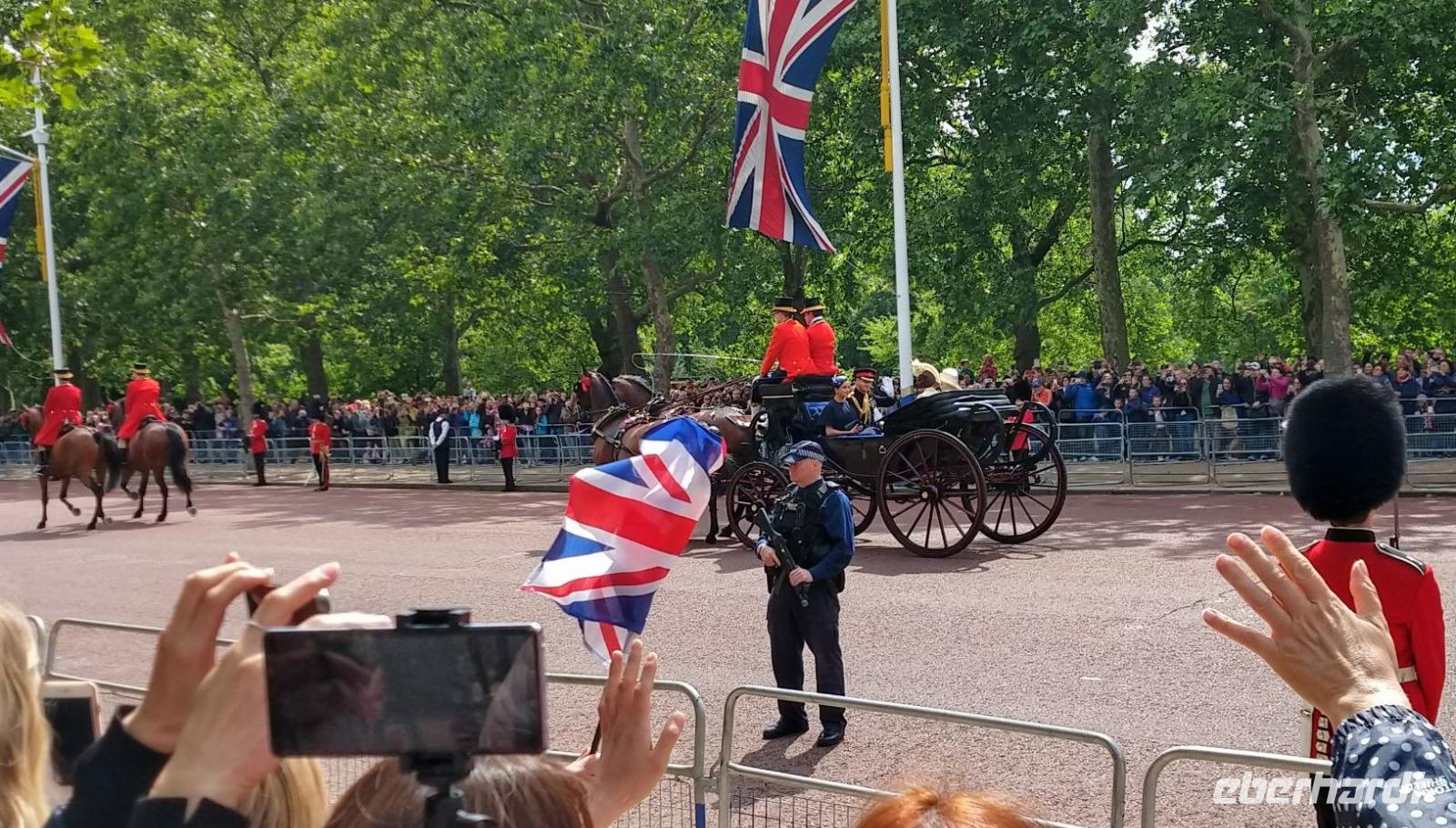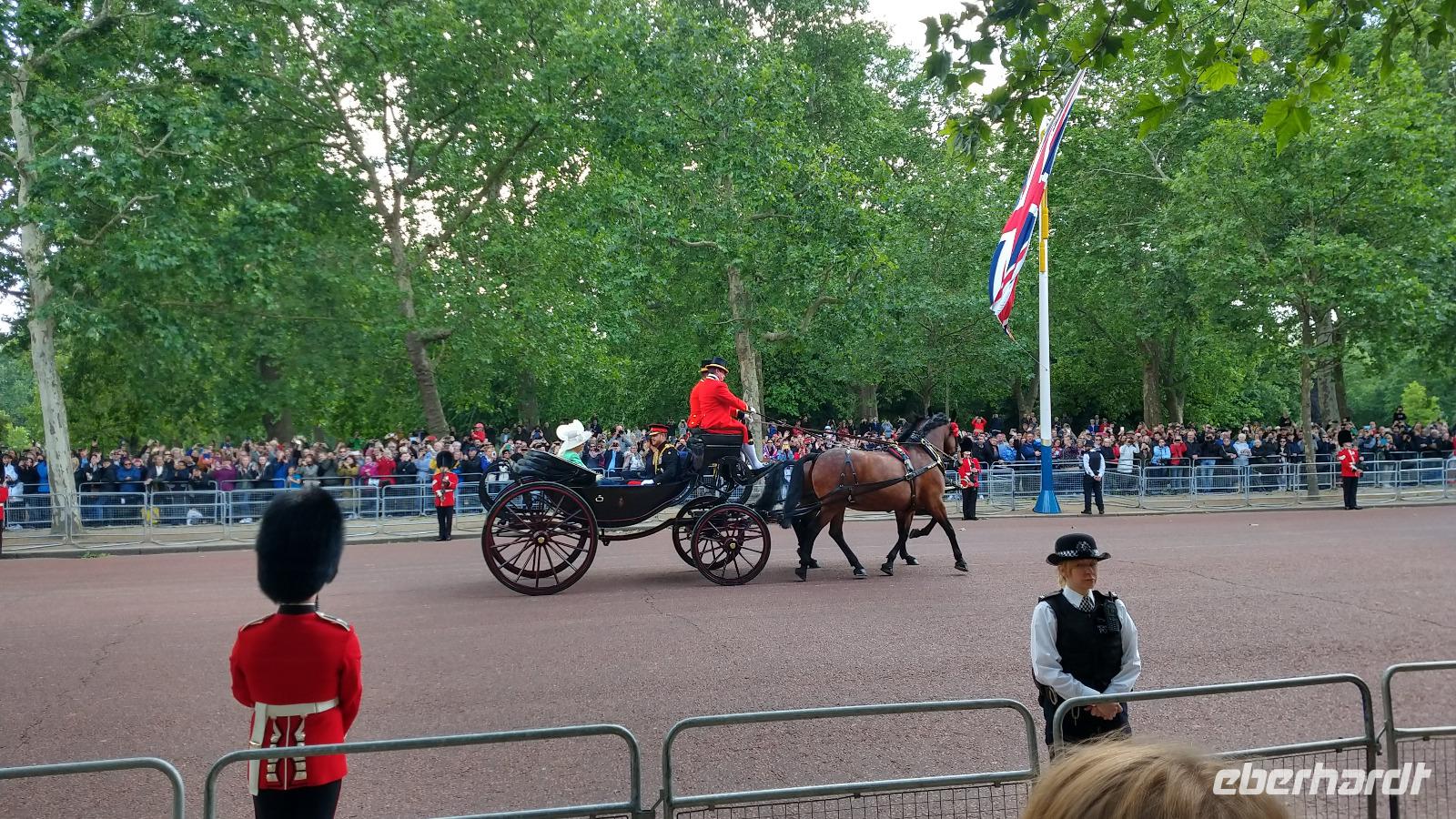 Wir suchen uns geeignete Plätze entlang der Mall für diese Show. Und schon kommen die ersten Regimenter, die Kutschen mit der königlichen Familie und schließlich Queen Elizabeth II. Dann heißt es warten, während des Appells.