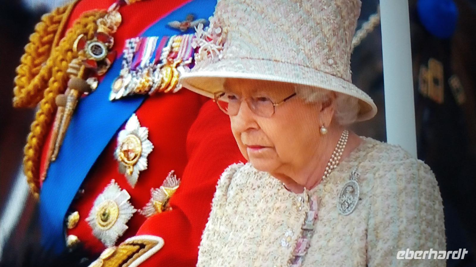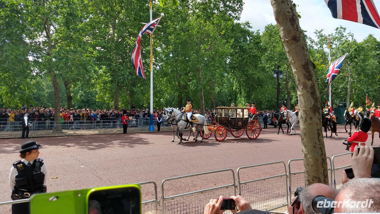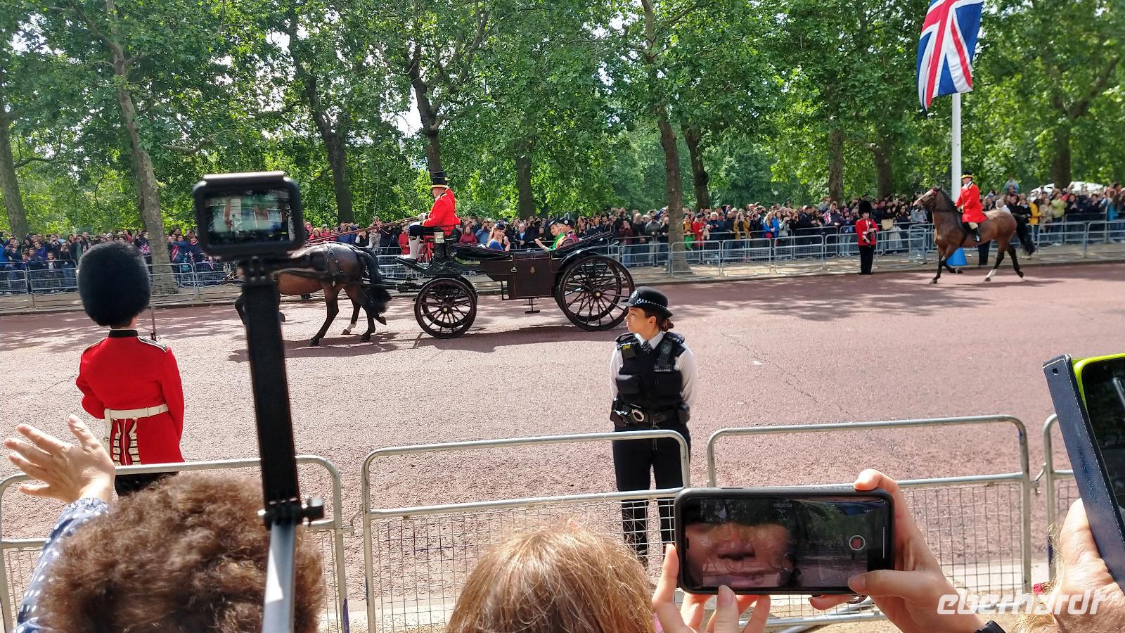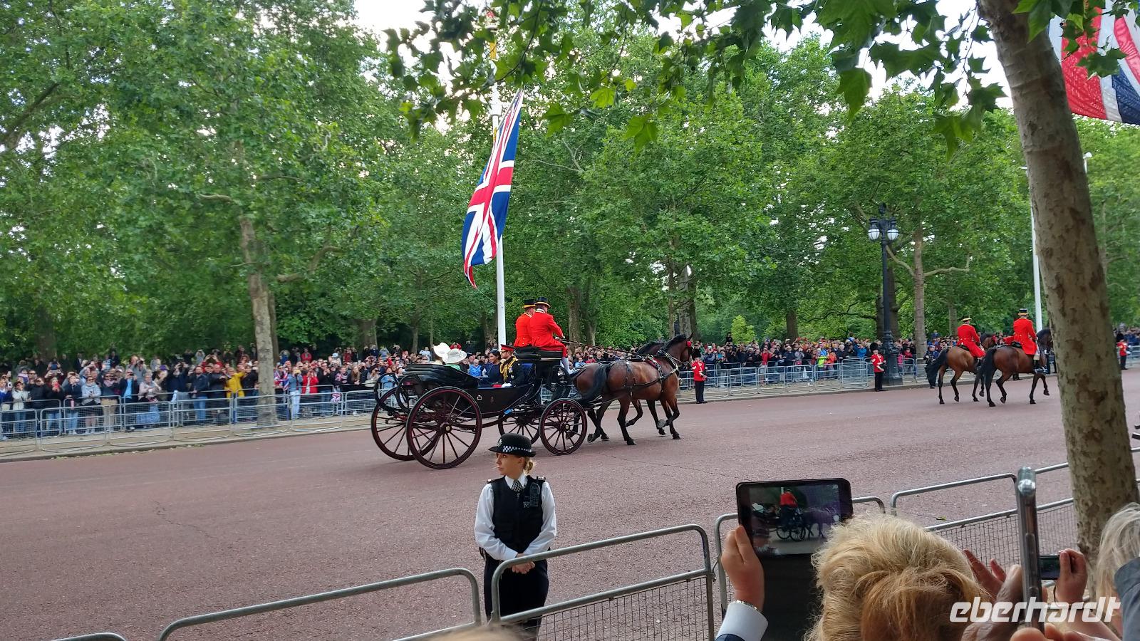 Wir suchen uns geeignete Plätze entlang der Mall für diese Show. Und schon kommen die ersten Regimenter, die Kutschen mit der königlichen Familie und schließlich Queen Elizabeth II. Dann heißt es warten, während des Appells.
