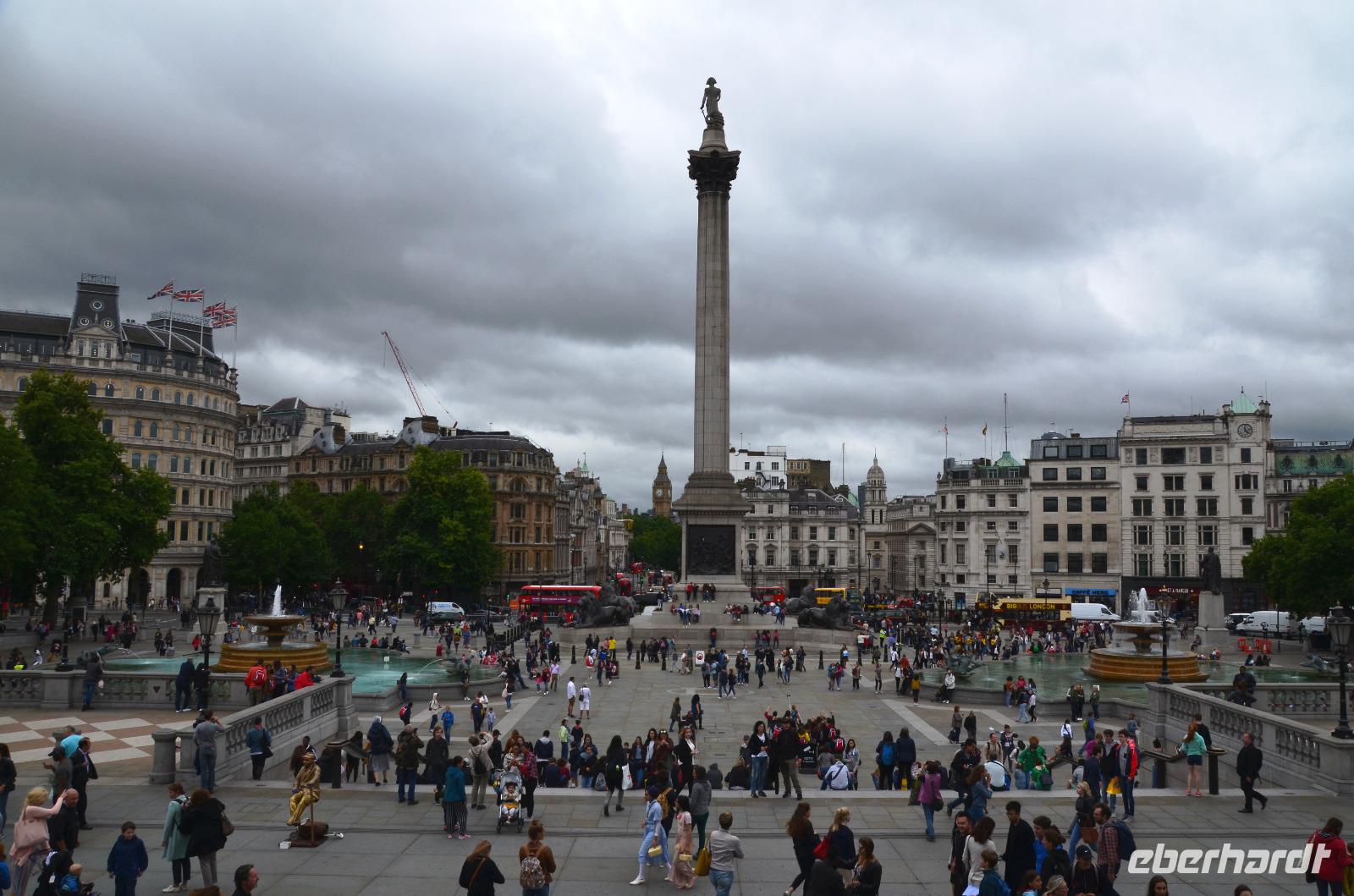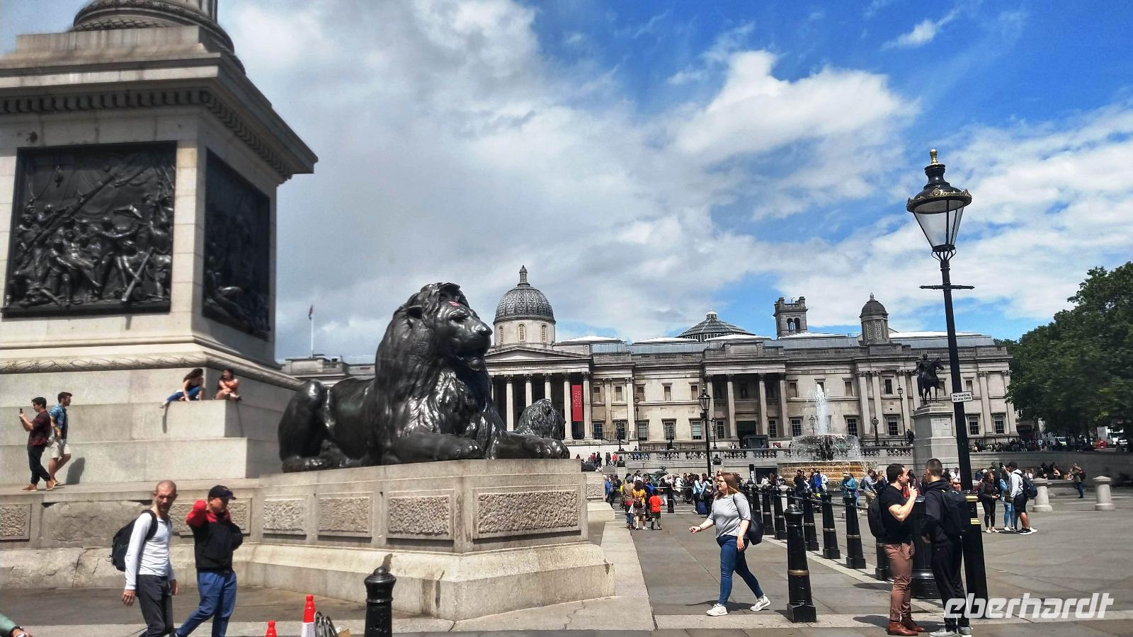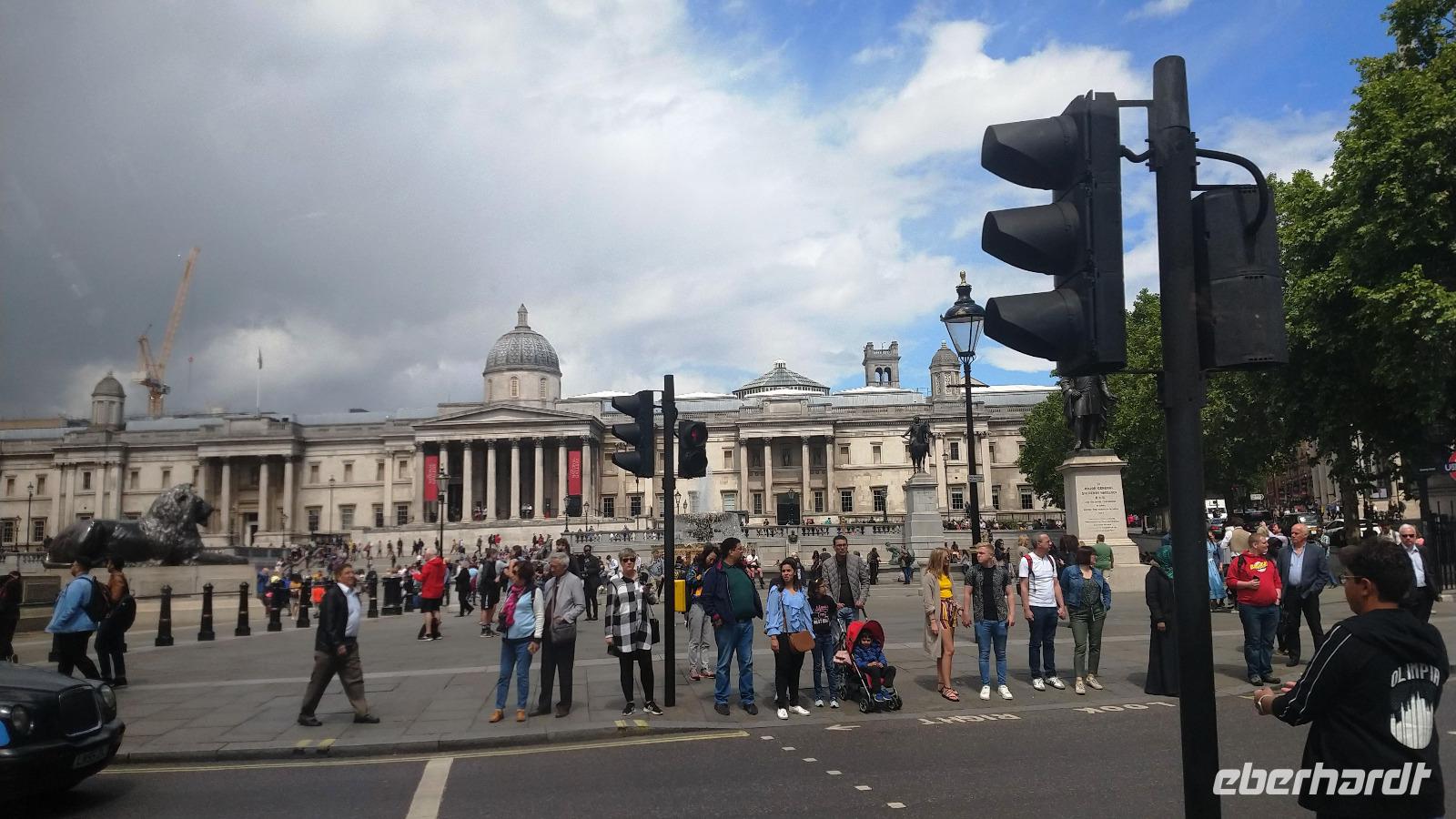 Später treffen wir uns in der Hotellobby und fahren mit dem Linienbus 15 vom Tower Hill zum Trafalgar Square. Dazu sind alle mit Oustercards ausgestattet. Von hier führt uns der gemeinsame Fußweg über den berühmten Platz mit dem Denkmal für Admiral Nelson, dem prunkvollen Gebäude der Nationalgalerie und der hübschen Kirche St. Martin in the Fields, hin zur „The Mall". Hier findet heute zu Ehren des 93. Geburtstags der Queen die Präsentation der Truppenfahne der königlichen Guards statt. Mit großem Appell aller Wachregimentern auf der Horse Guards Parade und anschließender Parade aller zum nahen Buckingham Palace.