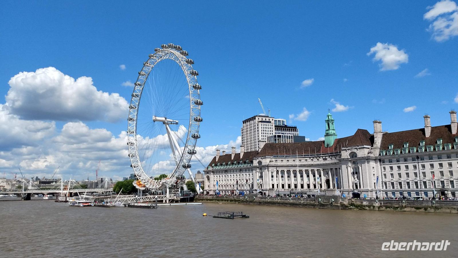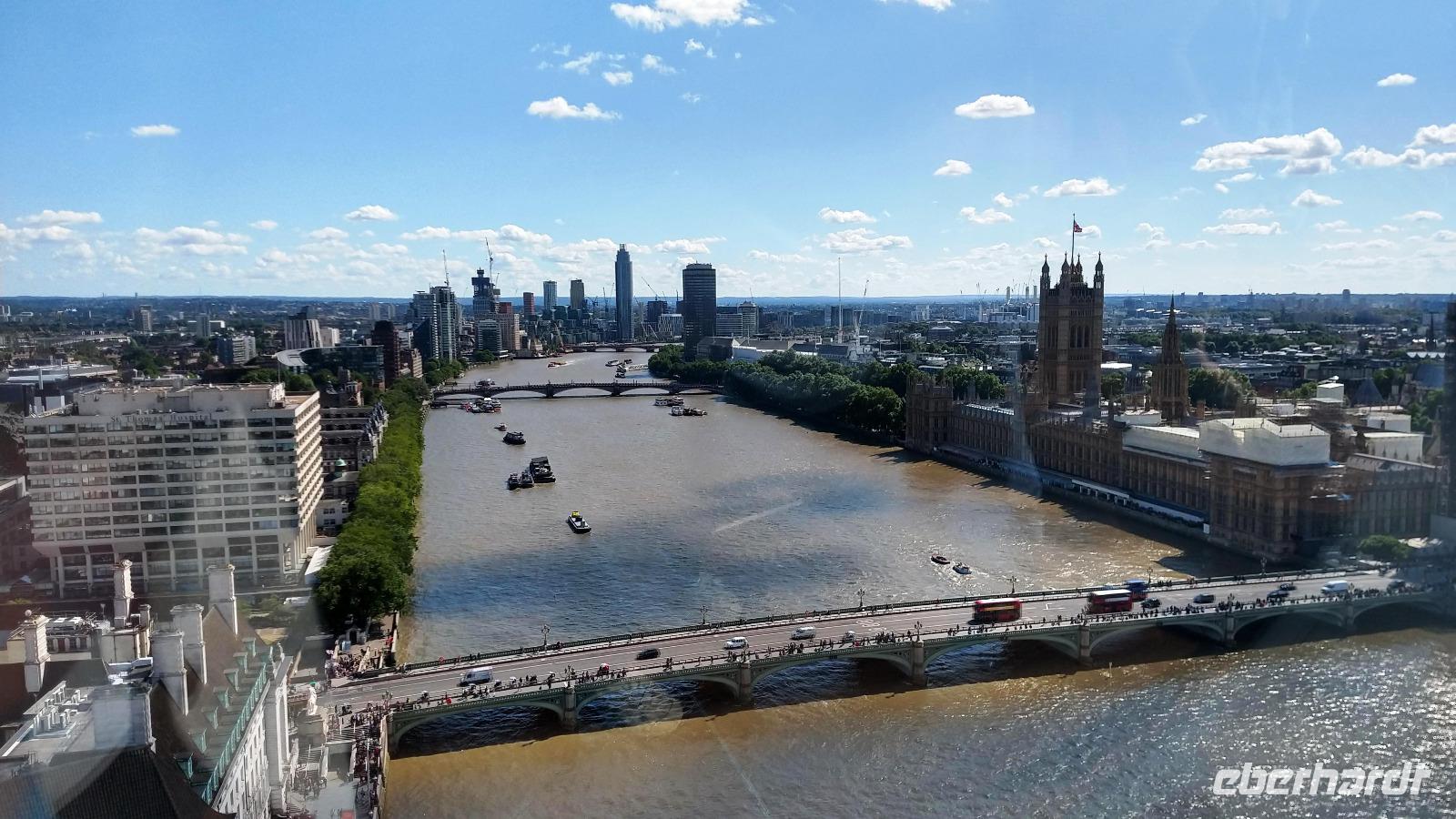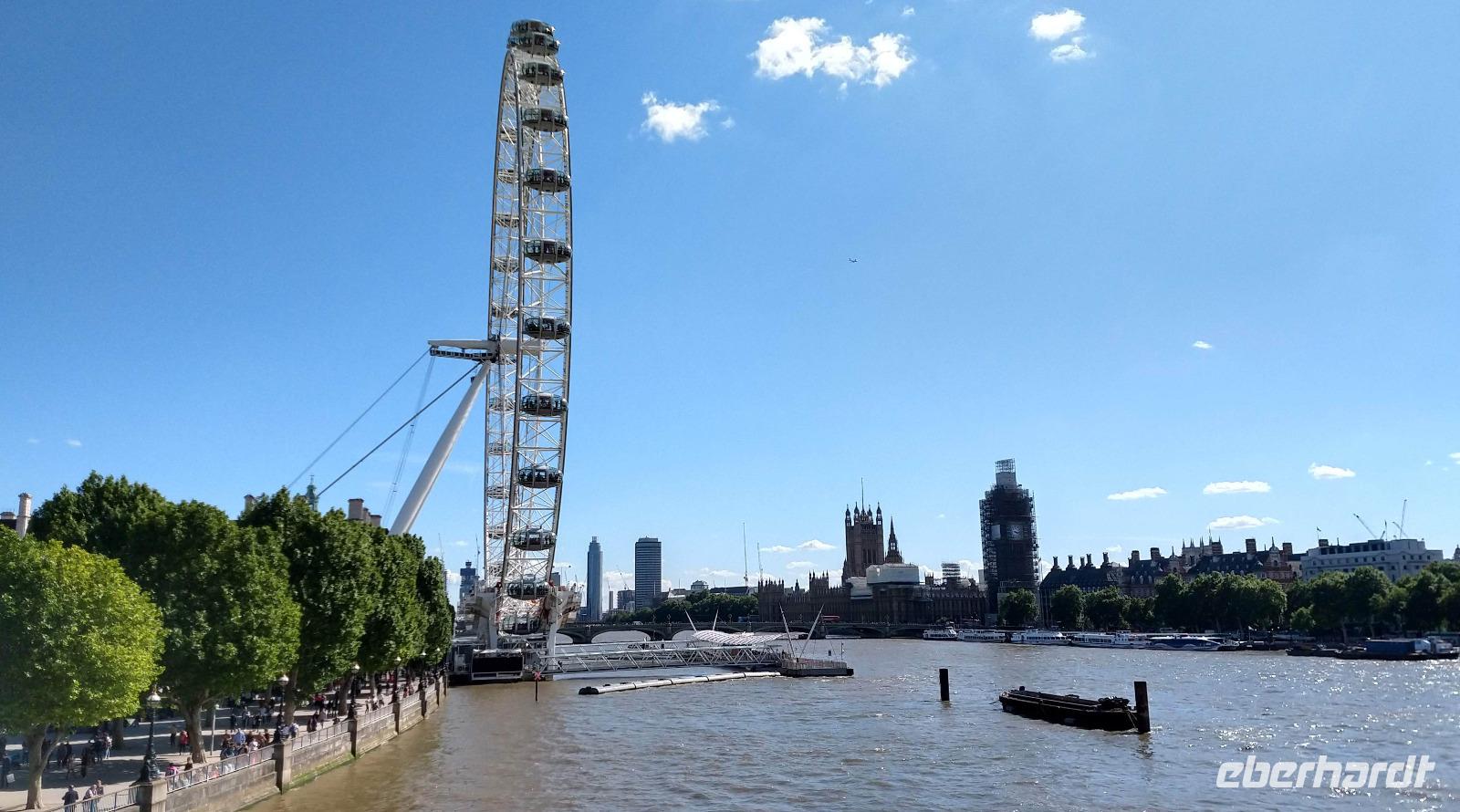 Nach angenehmen und reibungslosen Flügen, erreichen wir alle am Mittag unser direkt neben der Tower Bridge liegendes Hotel. Die Begrüßung ist herzlich und nach einer kleinen Stärkung brechen wir mit unserem kleinen Reisebus auf, die britische Hauptstadt zu erobern. Durch den dichten Verkehr in der City of London fahren wir über die Lower Thamse Street und die London Bridge nach Southwalk und Waterloo, denn unser erstes Besuchsziel ist das London Eye. Wir steigen neben dem berühmten Riesenrad aus und unternehmen gemeinsam einen Spaziergang am Themseufer entlang und über die Westminster Bridge zum Westminster Square.