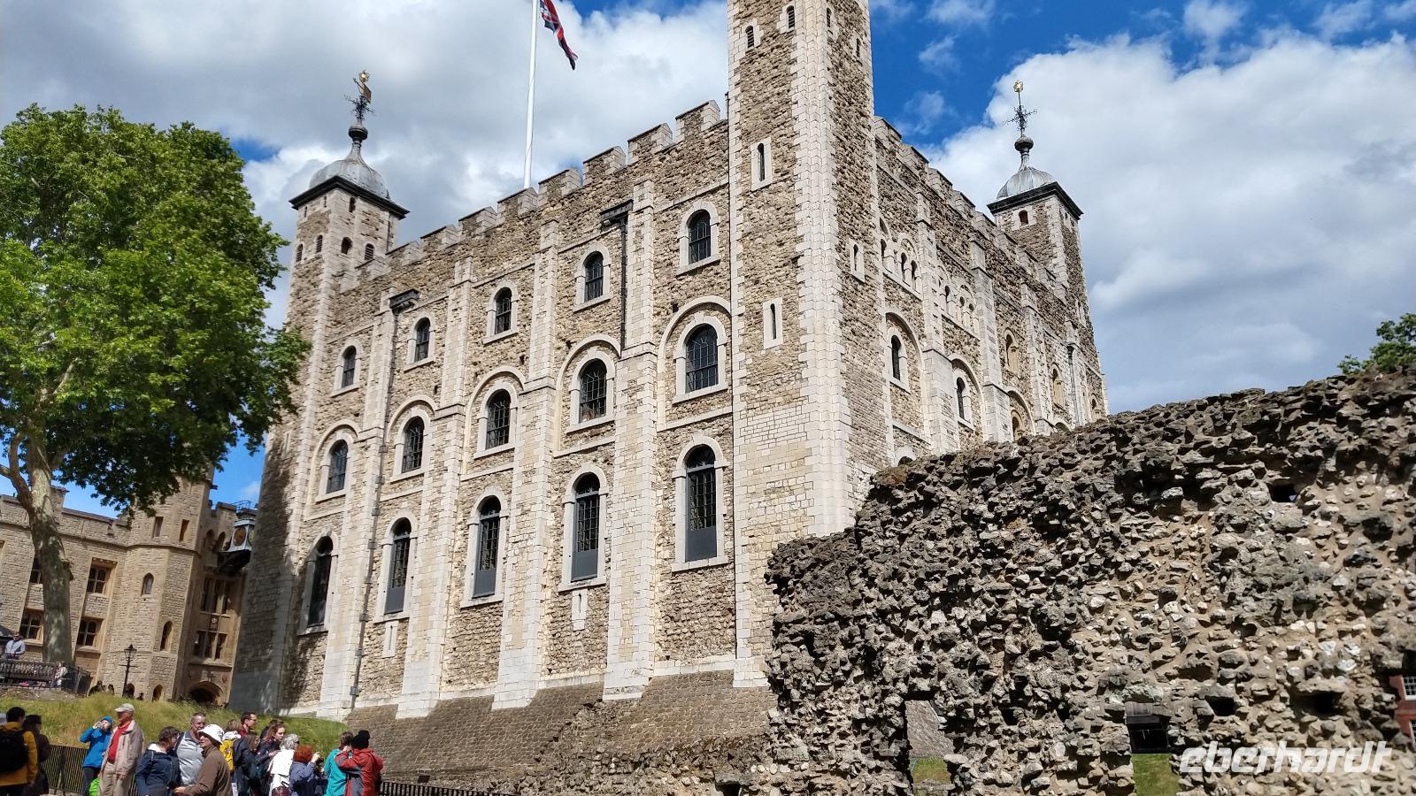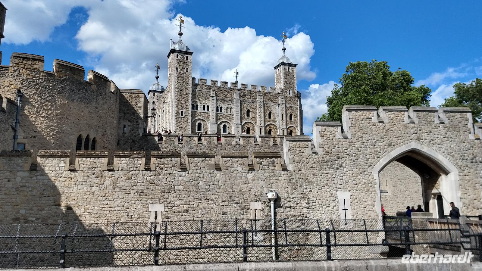 Als Nächstes besuchen wir alle gemeinsam den Tower von London, laufen vom Tower Hill zum Eingangs-Gate hinunter, erfahren mehr über die nahen Sehenswürdigkeiten und machen die ersten Fotos der ständig wachsenden Londoner Skyline um uns herum. Ausgerüstet mit Eintrittskarte und Orientierungsplan betreten wir dann durch das Eingangstor die alte Festungsanlage, der von den „Beefeatern" bewachten und durch die Kolkraben beschützten Anlage. Wilhelm dem Eroberer, der Normanne, gegründet 1078 diese Mauern. Davon zeugt noch immer der „Weiße Turm", der mächtige Keep, der aus dieser Zeit erhalten ist und den zentralen Wohnbereich der Burganlage bildete.