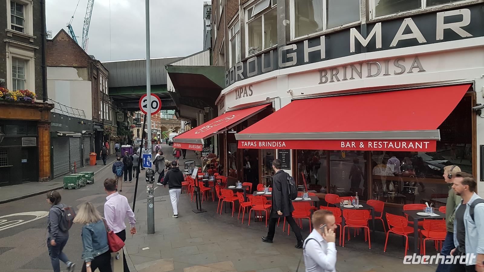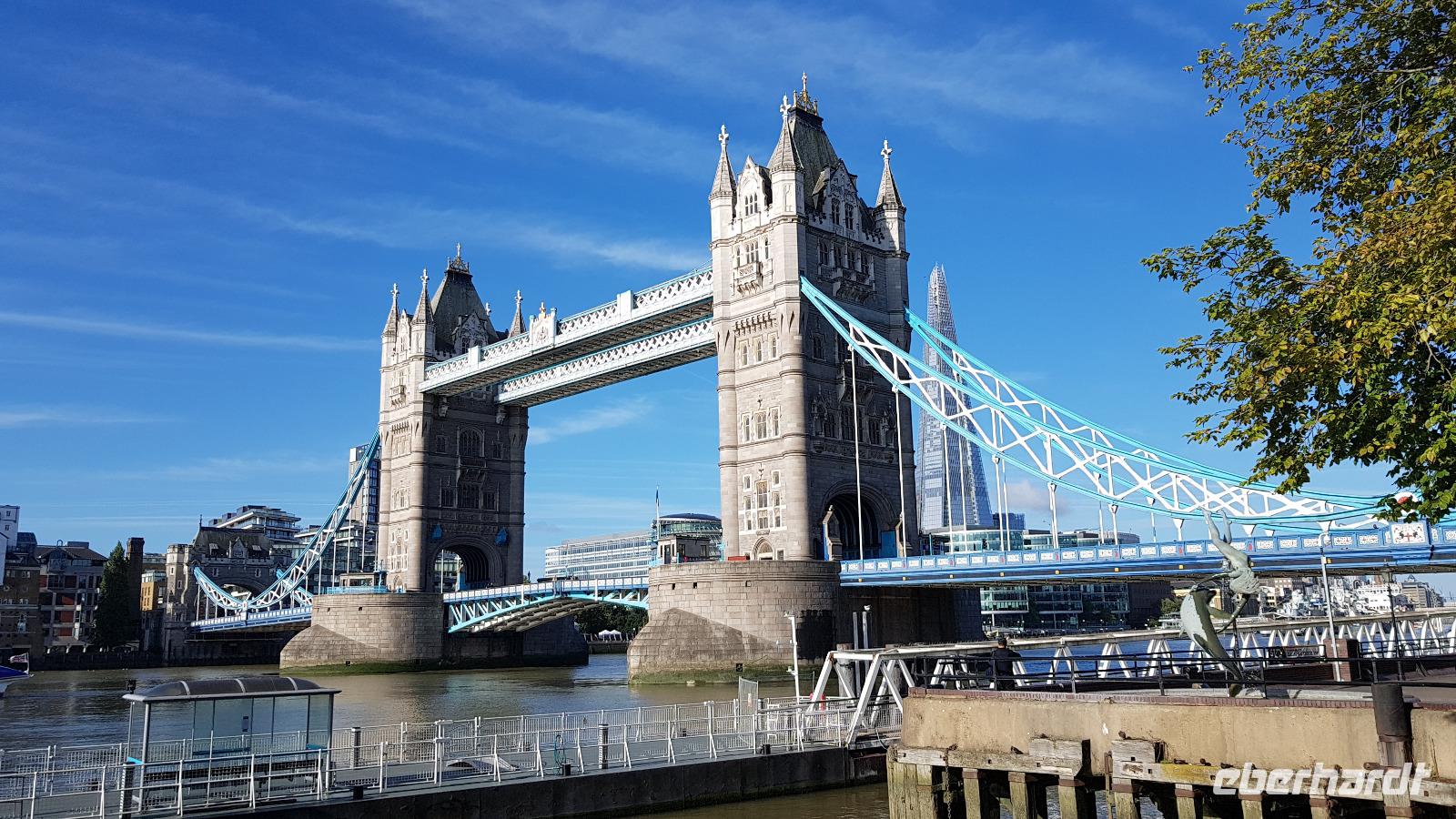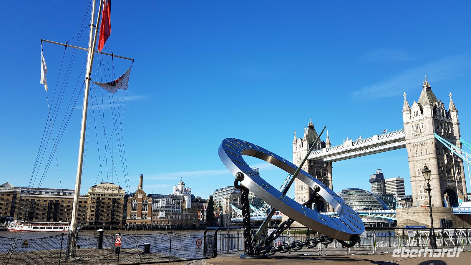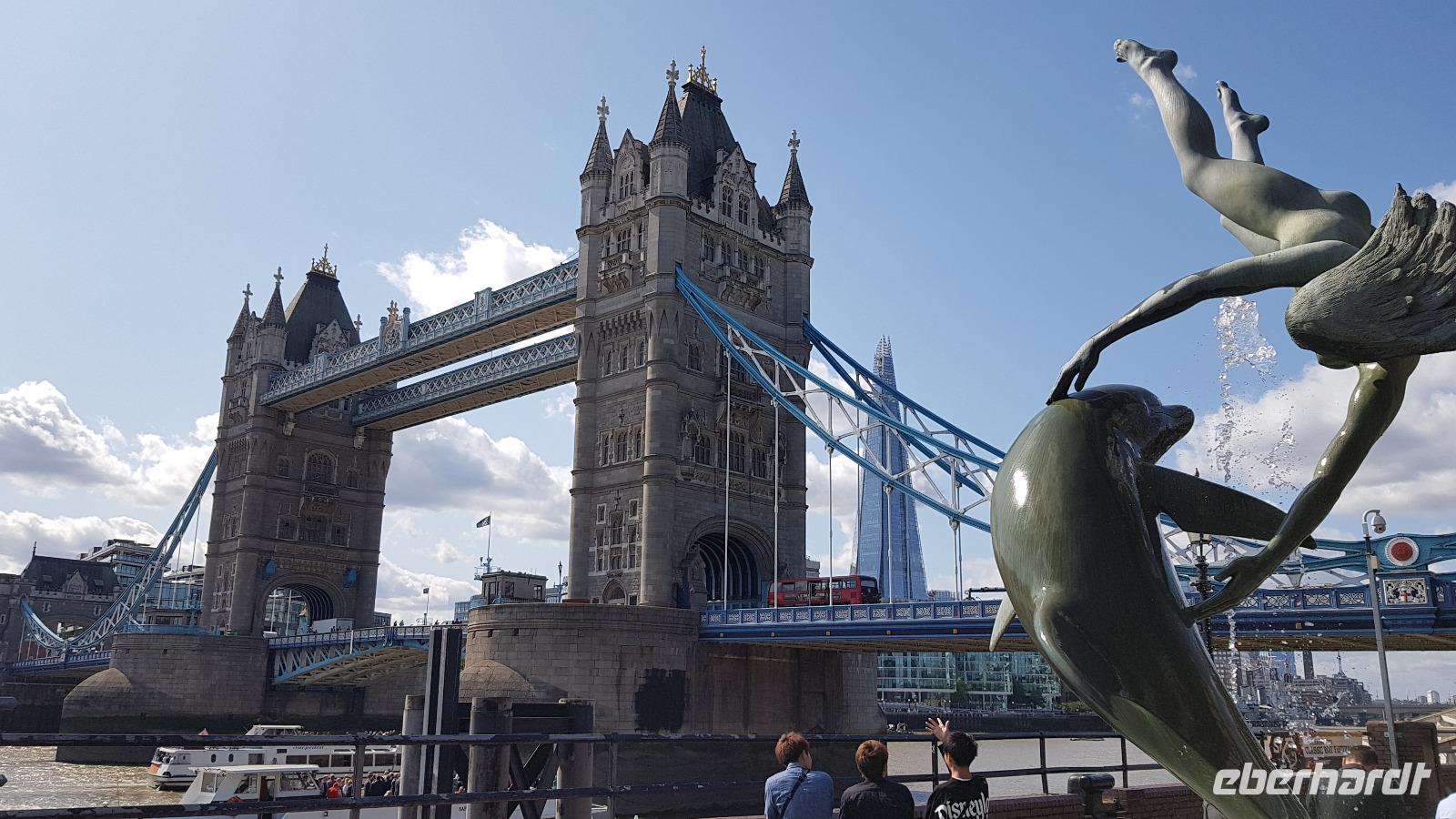 Entgegen aller Vorhersagen ist das Wetter ausgesprochen freundlich. Viel Sonne, einige Wolken und etwas Wind- was wollen wir mehr. Nach einem ausgiebigen Frühstück treffen wir uns in der Lobby des Hotels mit Rosie, unserer Statdtführerin. Auch Roberto ist mit seinem Bus bereits da und wir können starten. Unsere Bedenken wegen der vielen Staus gestern lösen sich rasch auf, wir kommen gut voran und Rosie kann uns viel von ihrer Stadt zeigen. Über die Southwark Bridge geht es vorbei am Borough Market, einem tollen Marktplatz, zurück über die London Bridge bis zum "The Monument", einer Säule, die als Erinnerung an das große Feuer 1666 errichtet wurde. Damals wurde fast die ganze Stadt zerstört, 5 Tage lang wüteten die Flammen. Durch die City of London geht es, hier wohnen 9.000 Menschen- aber 120.000 arbeiten hier und pendeln täglich hierher, wir passieren das Mansion House, den Sitz des Lord Mayor of London, des Bürgermeisters der City of London. In der Nähe der