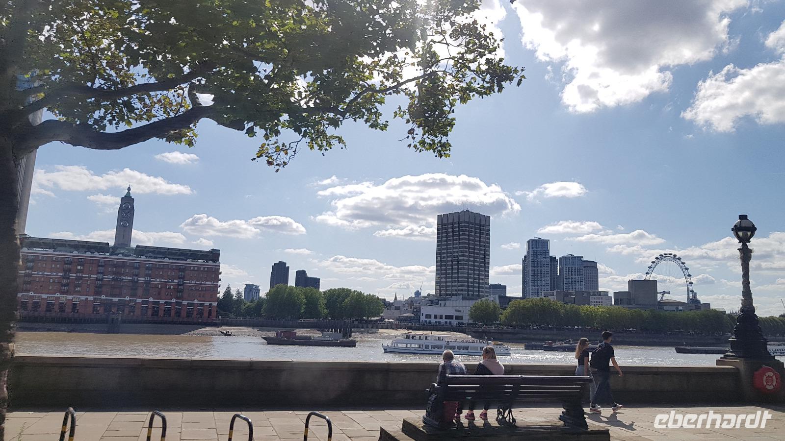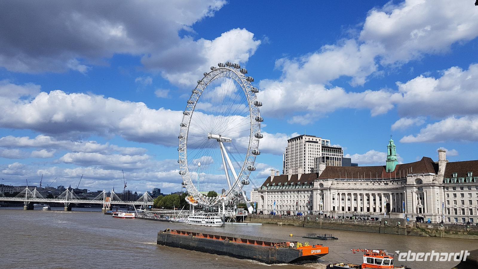 Wir fahren bis Westminster und nutzen die Gelegenheit für einen kleinen Blick zum Parliament Square, zum Elisabeth-Tower mit Big Ben, der gerade saniert wird und zu den Houses of Parliament. Über die Westminster Bridge erreichen wir schließlich das Riesenrad- Wahrzeichen Londons seit der Jahrtausendwende. Eigentlich sollte es nur 5 Jahre stehen bleiben, mittlerweile gehört es aber zur Londoner Skyline dazu und niemand kann sich London ohne sein London Eye mehr vorstellen. Dann fahren wir bei schönstem Sonnenschein hinauf, 15 Minuten himauf benötigen wir mit unserer Gondel, in der bis zu 25 Personen Platz haben- 32 Gondeln hat das Riesenrad- für jeden Stadtteil Londons eine. Und weitere 15 Minuten vergehen, bis wir wieder aussteigen. Bis dahin genießen wir grandiose Blicke über die Stadt. Mit vielen tollen Fotos im Gepäck gehen wir auf weitere Erkundungstour, einige zu Fuß an der Themse entlang, andere wollen Westminster Abbey sehen, wieder andere fahren zurück ins Hotel. Hier treffen wir uns am Abend zum gemeinsamen Dinner. Dabei können wir auf die Marina hinter dem Hotel schauen und sind von der Umgebung restlos begeistert. Ein leckeres 3-Gänge-Menü rundet diesen Tag ab und wir verabschieden uns bis morgen.