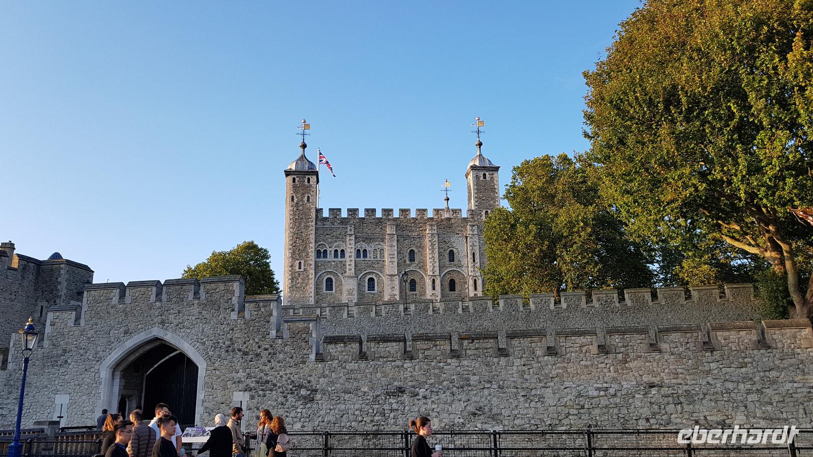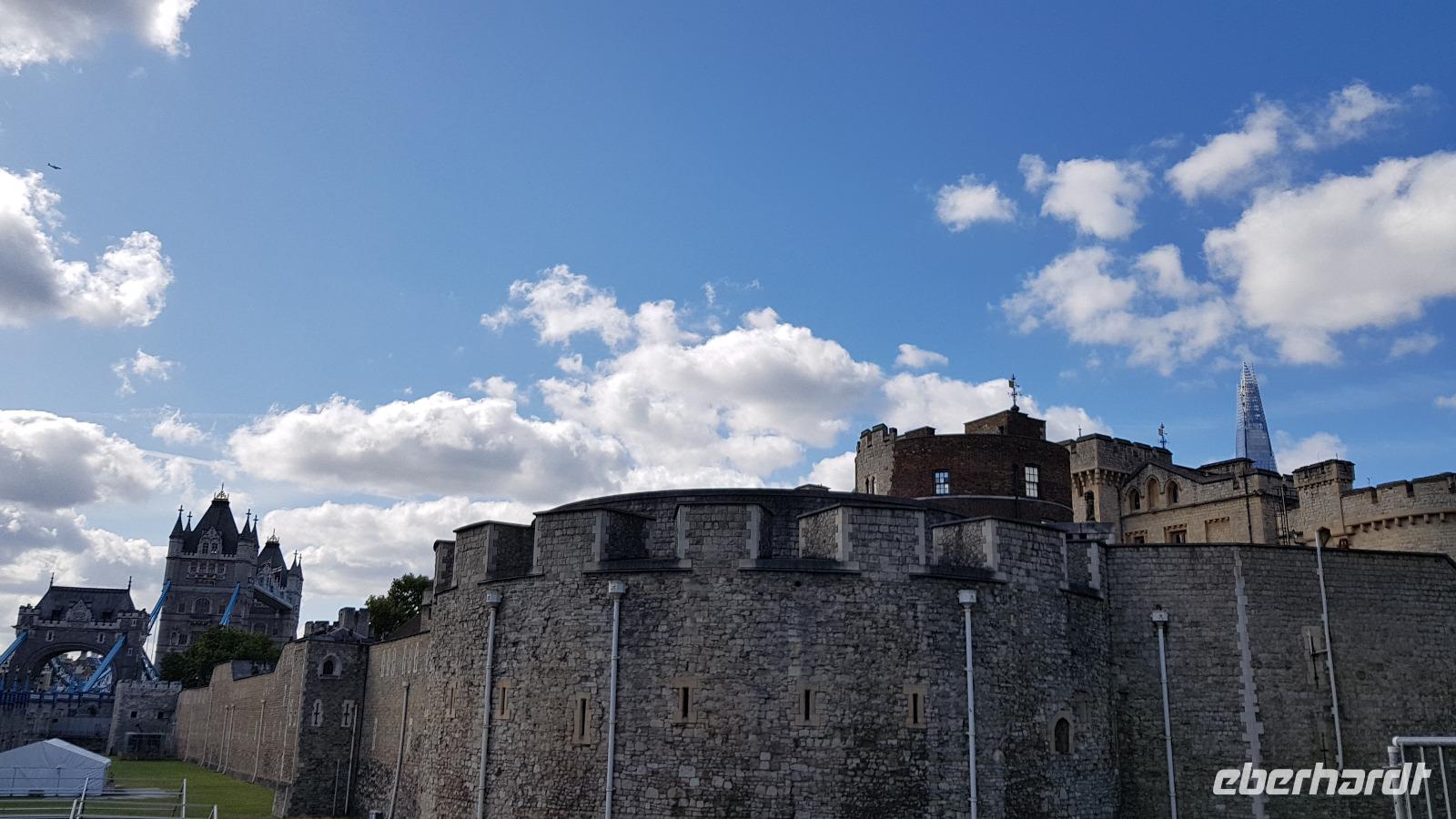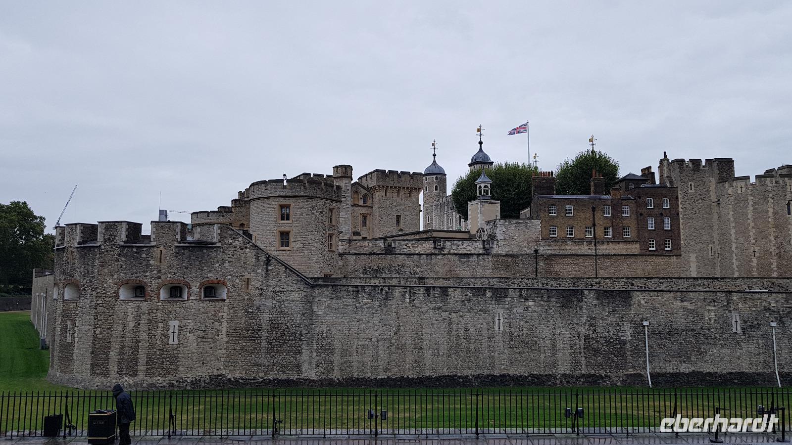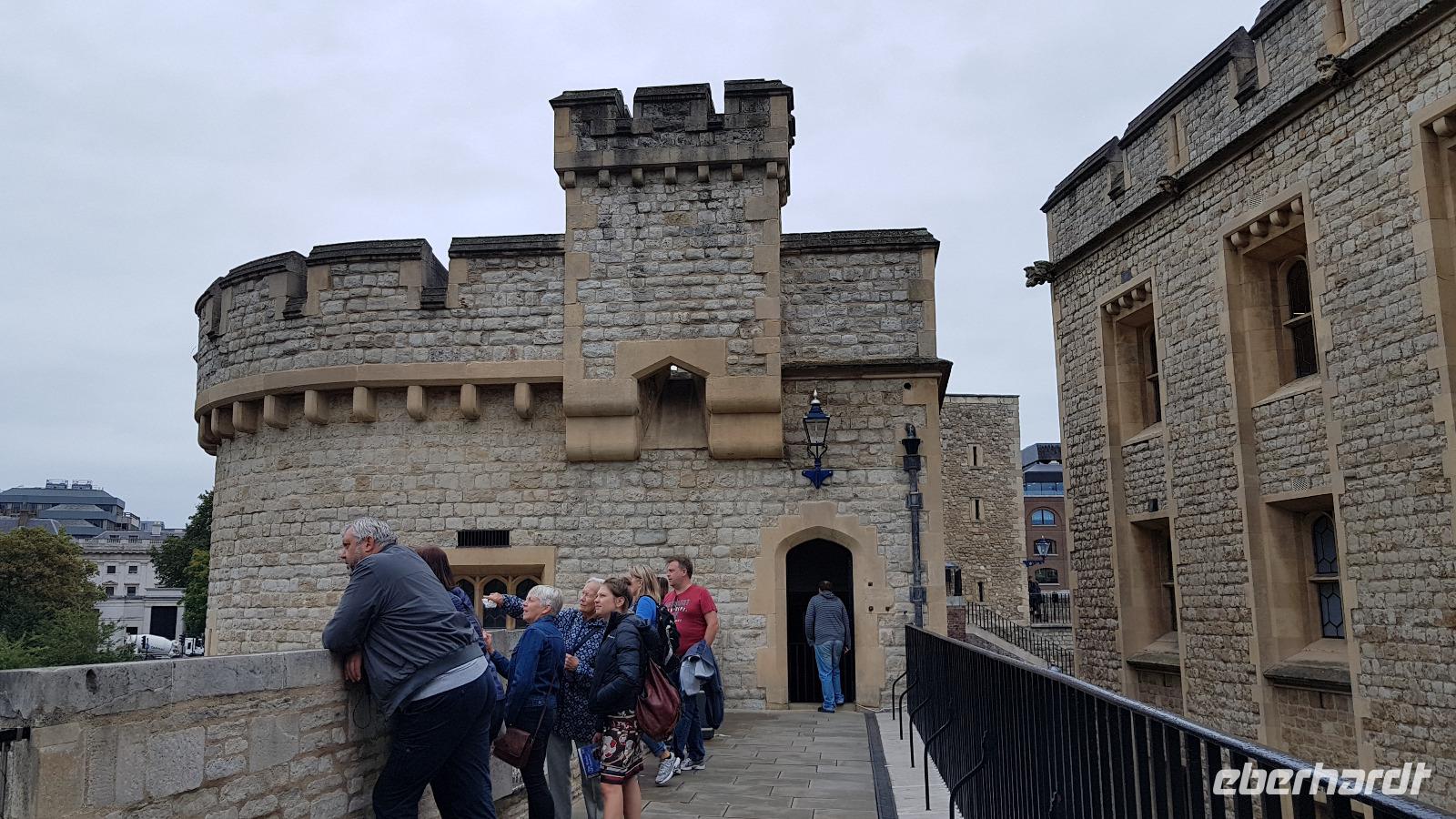 Er geht zurück auf William den Eroberer, er ließ den heutigen White Tower erbauen, um das eroberte Land zu kontrollieren. Um 1100 wurde die Burg fertiggestellt und dann erfolgte eine Erweiterung nach der anderen. Die Ringmauern kamen später dazu und sind heute um die 700 Jahre alt. Im Laufe einer Geschichte war der Tower of London vieles: Königspalast, Gefängnis, Hinrichtungsstätte, Münzprägestätte, sogar ein Zoo war einmal hier untergebracht. Den Elefant hatte Ludwig der XIV. von Frankreich dem englischen König geschenkt. Die Wachen des Tower, die sogenannten Yeoman Warders wurden früher auch Beefeater genannt- vermutlich, weil sie Fleisch für ihren harten Dienst bekamen, das konnte sich die normale Bevölkerung nicht leisten. Heute führen sie die Besucher durch den Tower und leben auch mit ihren Familien im Tower. Ein Abstecher zu den Kronjuwelen durfte natürlich nicht fehlen, ebenso wie der Besuch der Kapelle, der Zellen oder ein Rundgang auf den Mauern. Einige Gäste hatten danach noch einen besonderen Termin: sie hatten einen Ausblick vom