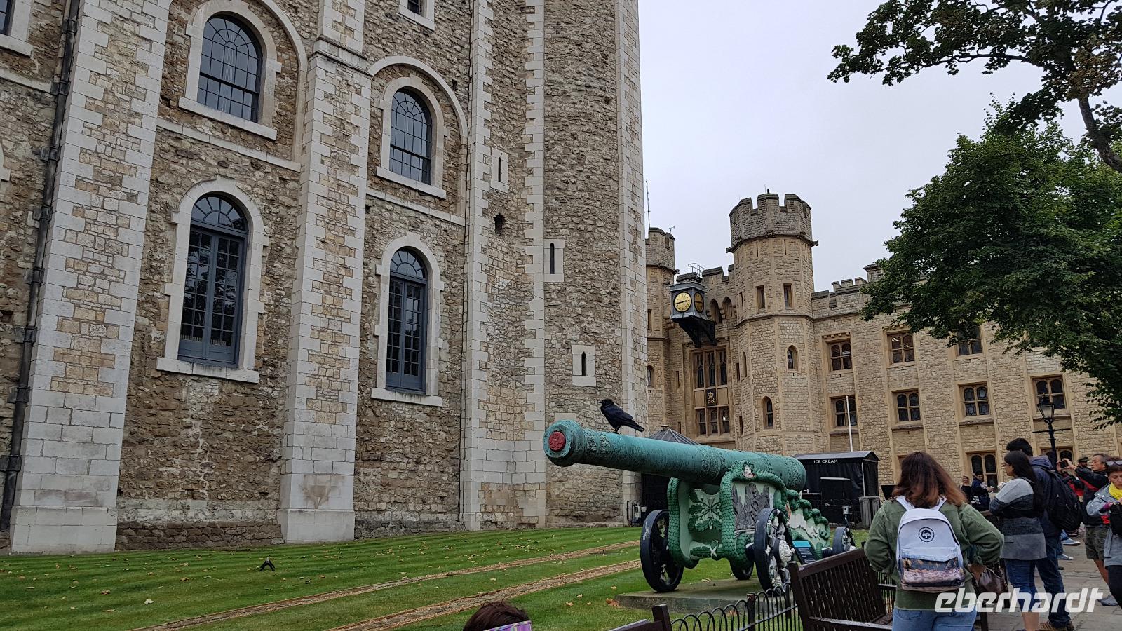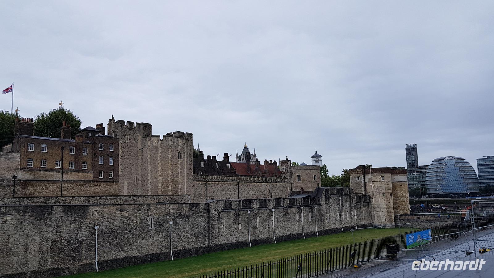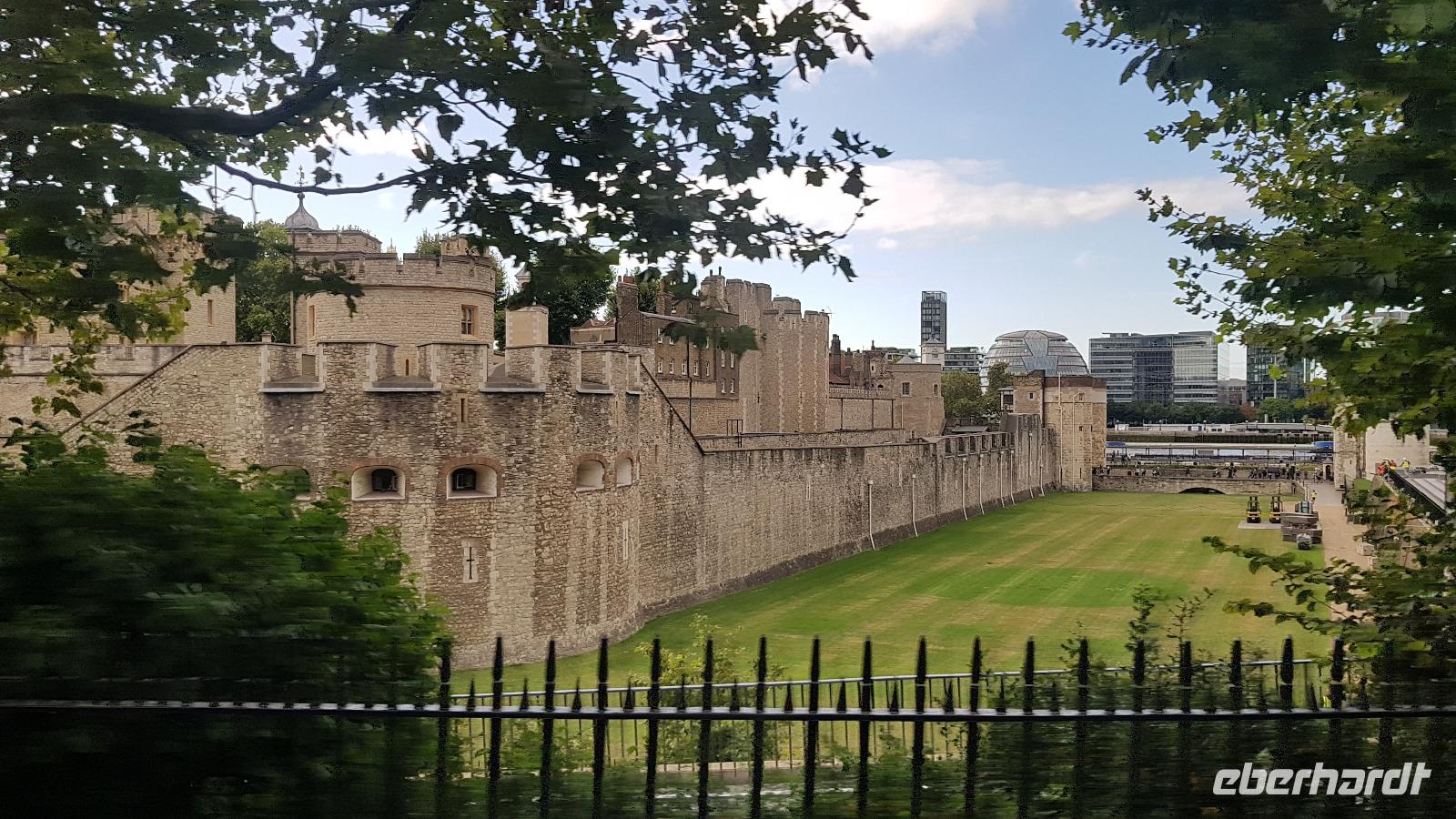 Er geht zurück auf William den Eroberer, er ließ den heutigen White Tower erbauen, um das eroberte Land zu kontrollieren. Um 1100 wurde die Burg fertiggestellt und dann erfolgte eine Erweiterung nach der anderen. Die Ringmauern kamen später dazu und sind heute um die 700 Jahre alt. Im Laufe einer Geschichte war der Tower of London vieles: Königspalast, Gefängnis, Hinrichtungsstätte, Münzprägestätte, sogar ein Zoo war einmal hier untergebracht. Den Elefant hatte Ludwig der XIV. von Frankreich dem englischen König geschenkt. Die Wachen des Tower, die sogenannten Yeoman Warders wurden früher auch Beefeater genannt- vermutlich, weil sie Fleisch für ihren harten Dienst bekamen, das konnte sich die normale Bevölkerung nicht leisten. Heute führen sie die Besucher durch den Tower und leben auch mit ihren Familien im Tower. Ein Abstecher zu den Kronjuwelen durfte natürlich nicht fehlen, ebenso wie der Besuch der Kapelle, der Zellen oder ein Rundgang auf den Mauern. Einige Gäste hatten danach noch einen besonderen Termin: sie hatten einen Ausblick vom