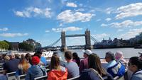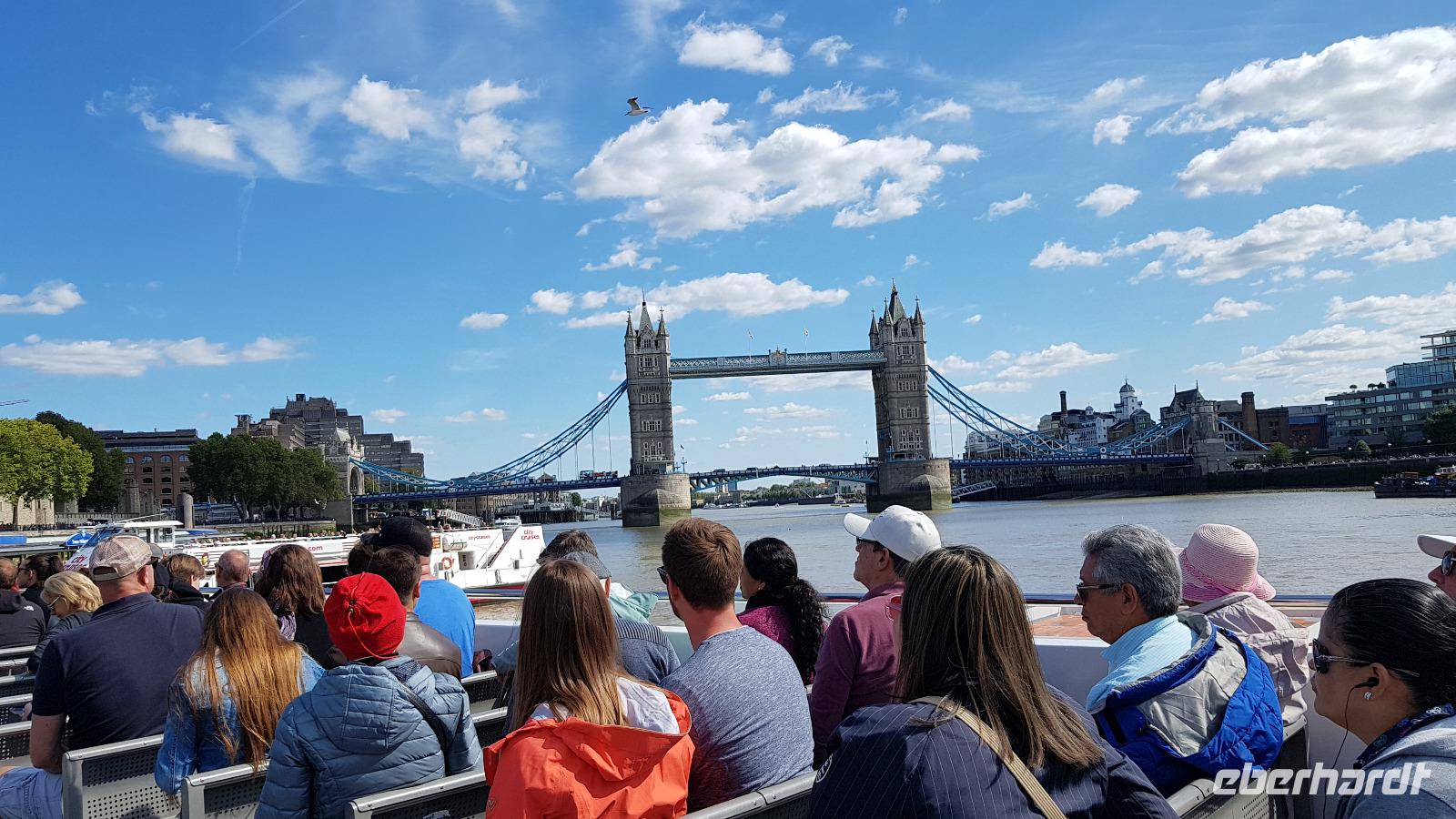 fahren wir als nächstes. Hier haben wir wieder eine kleine Pause und jeder kann den Palast und den Platz mit dem Brunnen und den Blumen erkunden. Zum Abschluß schließlich noch 3 Brücken- die Lambeth Bridge, die Westminster und schließlich die Waterloo Bridge. Was für tolle Blicke auf London! Nun haben wir unser nächstes Ziel für heute erreicht: den Pier am London Eye. Wir verabschieden uns von Rosie und danken ihr herzlich für ihre vielen Informationen und Geschichten über London. Nach einer Mittagspause treffen wir uns wieder und fahren mit dem Schiff eine Stunde lang die Themse hinauf nach