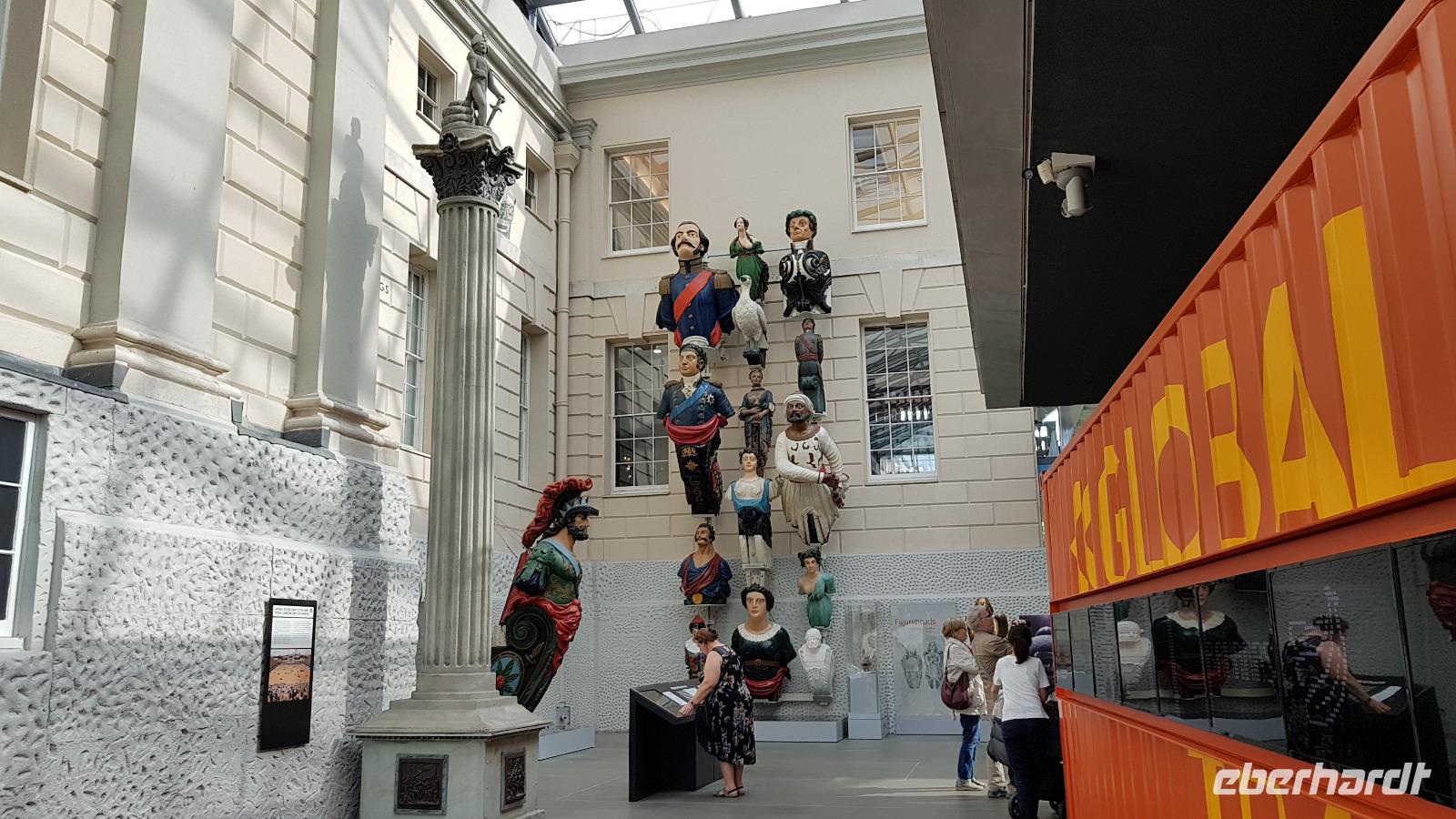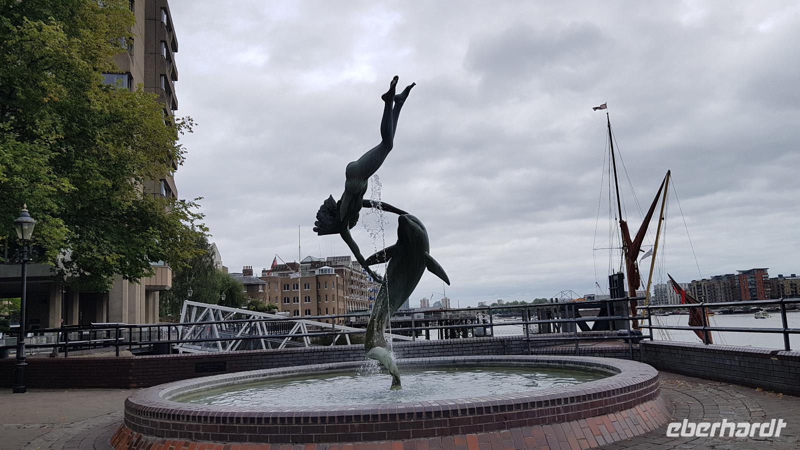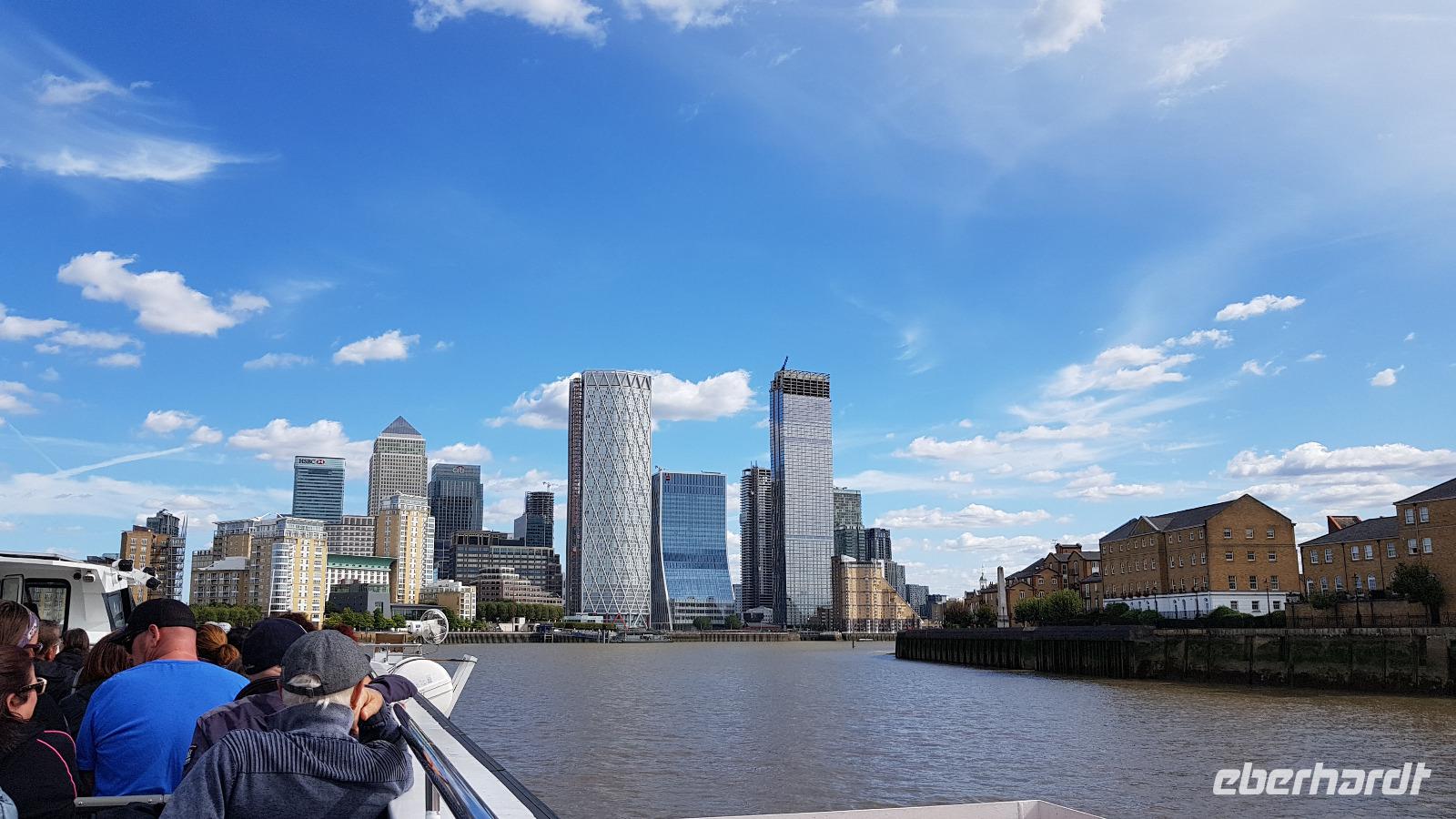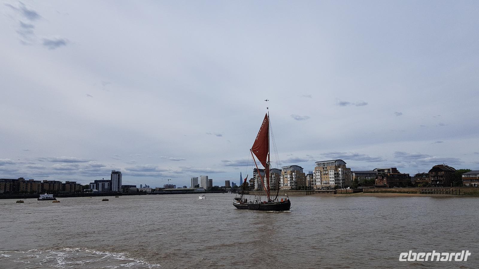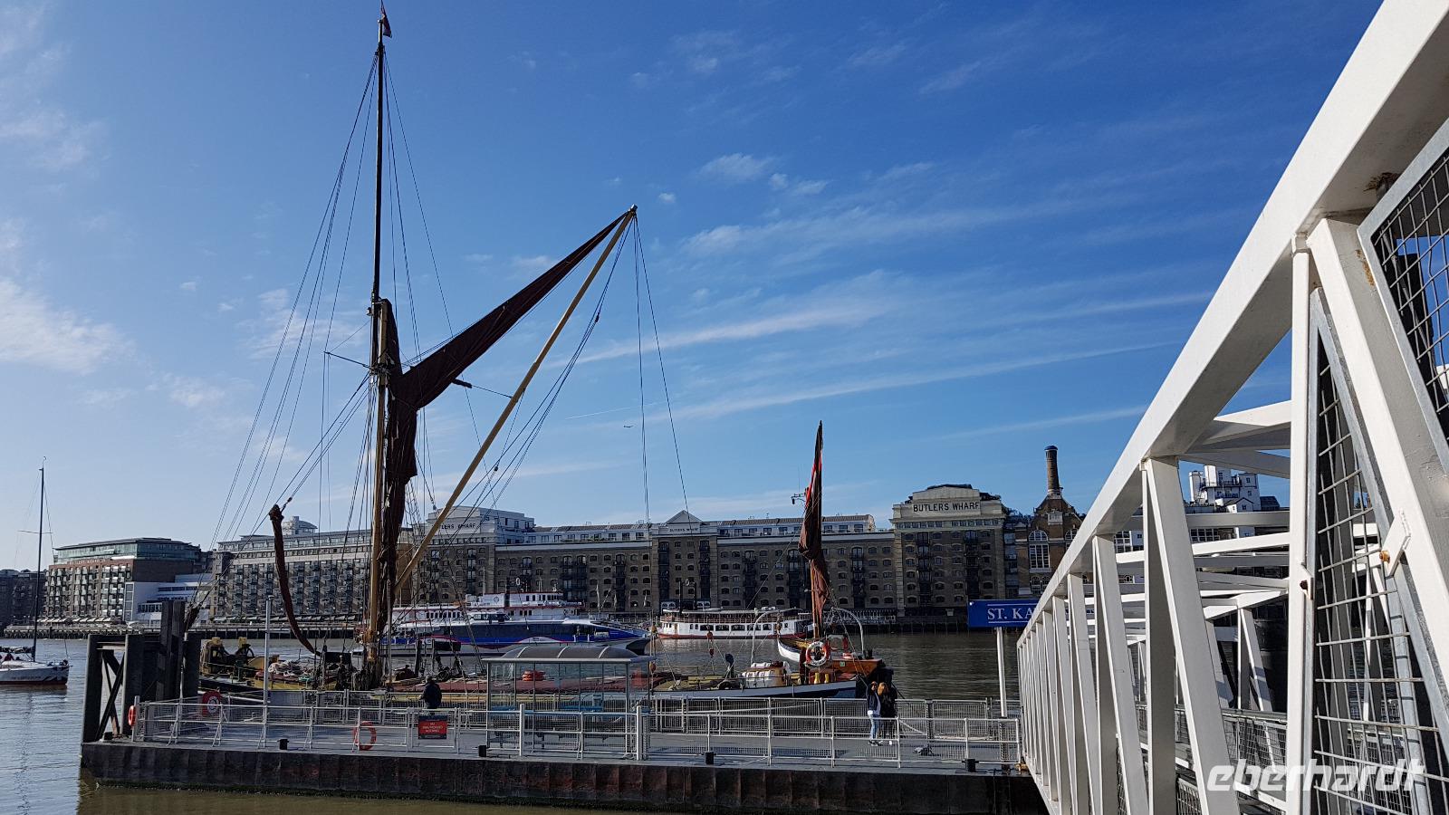 Wir genießen die Sonne auf dem Oberdeck und die Aussichten auf die Stadt, die sich bieten. Am Südufer der sogenannten "Isle of Dog" steigen wir aus und spazieren zuerst zur Cutty Sark. Einst war dieses Segelschiff der schnellste Teesegler der Welt, heute liegt es hier als Museumsschiff und kann besichtigt werden. Durch das