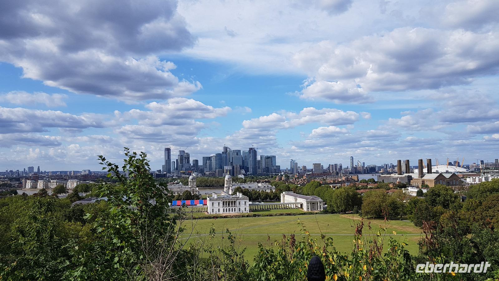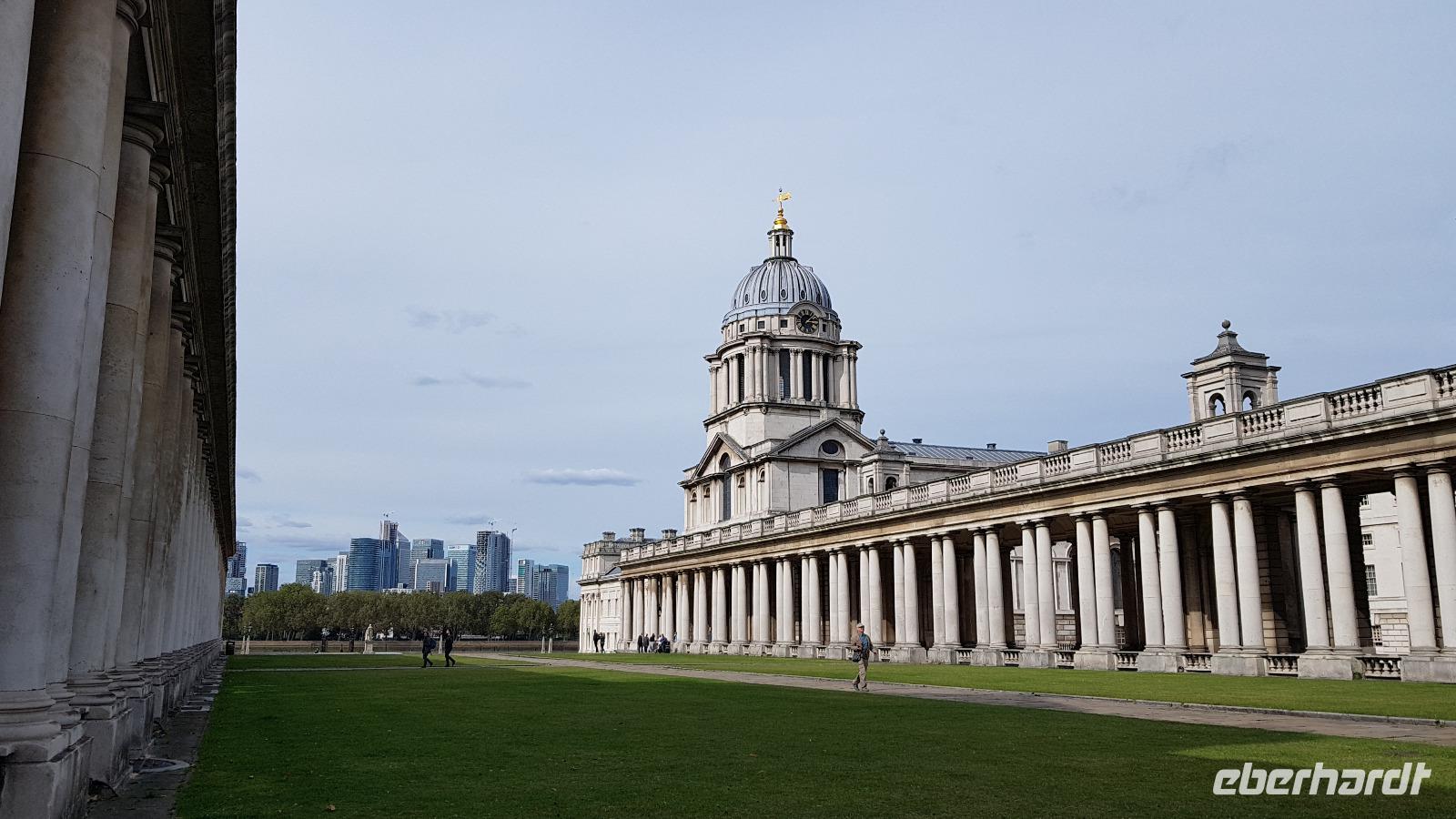 geht es weiter, eim 17. Jahrhundert sollte hier die neue Königsresidenz entstehen, man entschied sich aber für ein Seemanns-Pensionat. Mehr als 2000 Pensionäre lebten hier Ende des 19. Jahrhunderts. Im alten Speisesaal ist heute die Painted Hall für jedermann geöffnet und die Gebäude gehören nun zur University of Greenwich und beherbergen das Musik-College. Sir Christopher Wren zeichnete für die Architektur verantwortlich und wir erkennen leicht seine Handschrift an den Kuppeln wieder, die wir bereits bei der St. Pauls Kathedrale gesehen hatten. Seine Bauten flankieren das "Queens House", welches heute Bestandteil des National Maritime Museums ist, des größten Seefahrt- Museums der Welt. Von hier aus machen wir uns auf zum