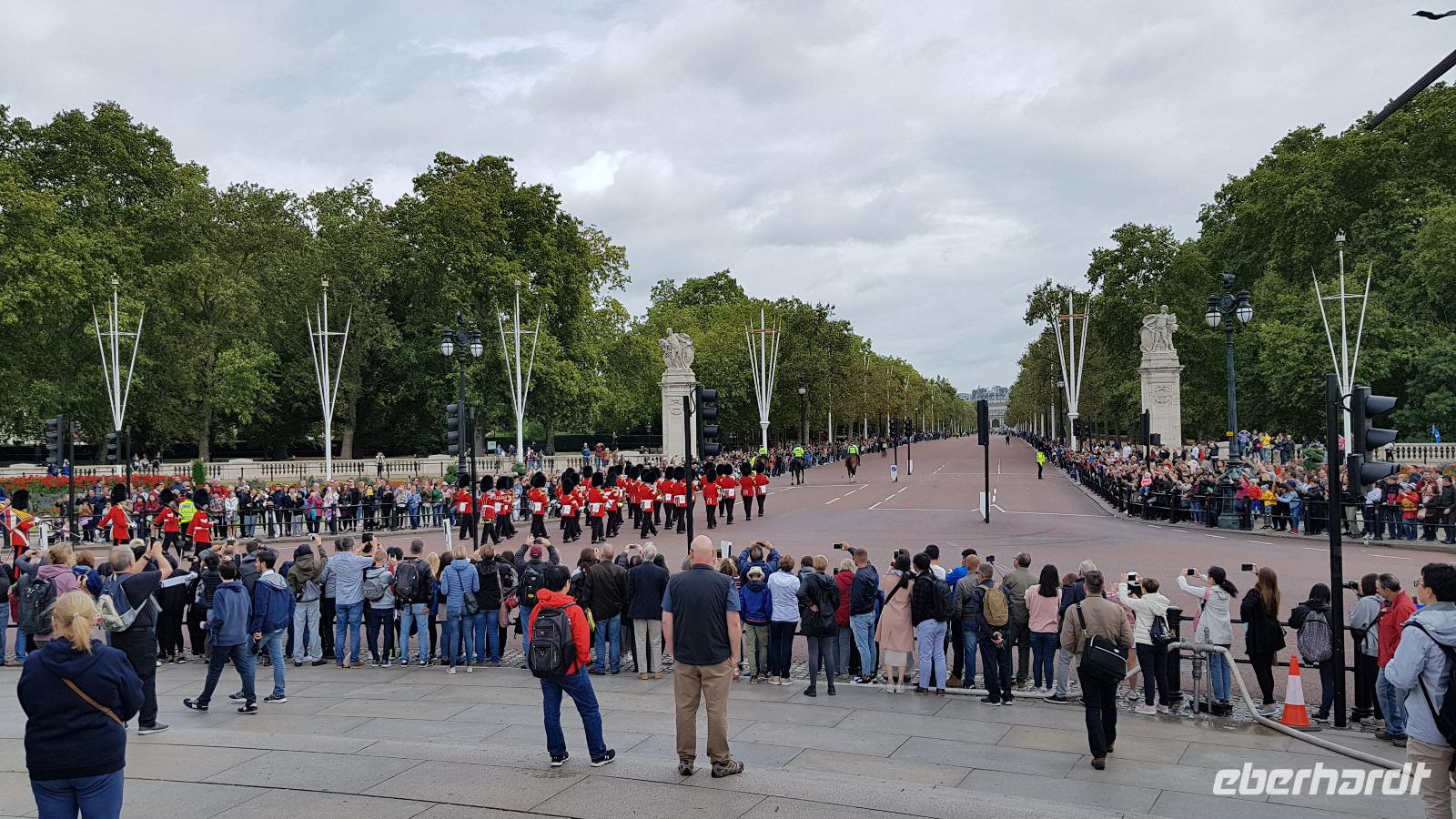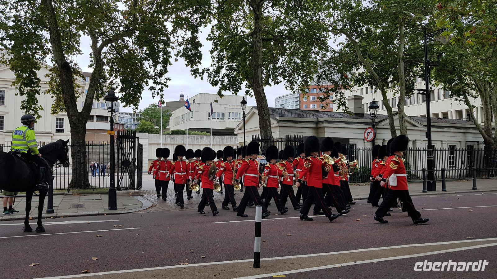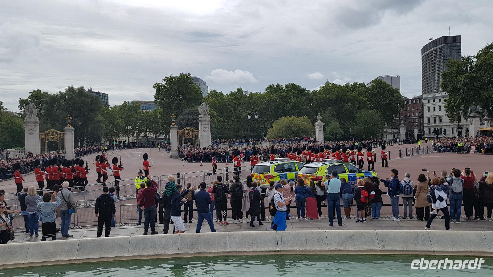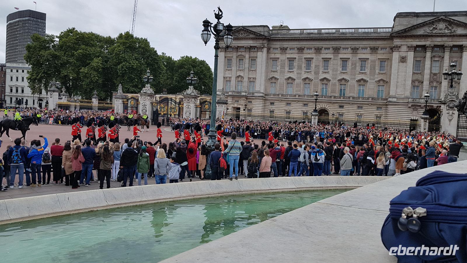 sehen. Einer über 700- jährigen Tradition gemäß wird hier die Wache vor dem Buckingham Palast in einem Zeremoniell abgelöst. Doch kurz bevor wir aufbrechen können: Feueralarm im Hotel! Wir sammeln uns draußen und auch die letzten vier Gäste schaffen es über die Treppen hinaus. So verlassen wir das Hotelgelände und spazieren gemeinsam zu U-Bahn-Station Tower Hill. Wir fahren bis zur Westminster Station und laufen dann an Downing Street vorbei auf den großen Paradeplatz an den Horse Guards. Durch den St. James´s Park schließlich erreichen wir die Wellington Barracks. Wir kommen gerade pünktlich 10 Uhr an, denn da starten die neuen Wachen zum Buckingham Palast. Vor dem Palast dann eine kurze Orientierung- die Reitergarde kommt vom St. James´s Palast die Mall herunter, die Musikparade von den Wellington Barracks. Also sucht sich jeder einen guten Platz zum Zuschauen und verfolgt gespannt das Geschehen. Danach gehen einige individuel weiter, besuchen noch die Westminster Abbey oder Harrods, die anderen fahren mit mir zurück zum Tower Hill. Hier verbringt jeder eine kleine Mittagspause und so gestärkt erkunden wir gemeinsam den