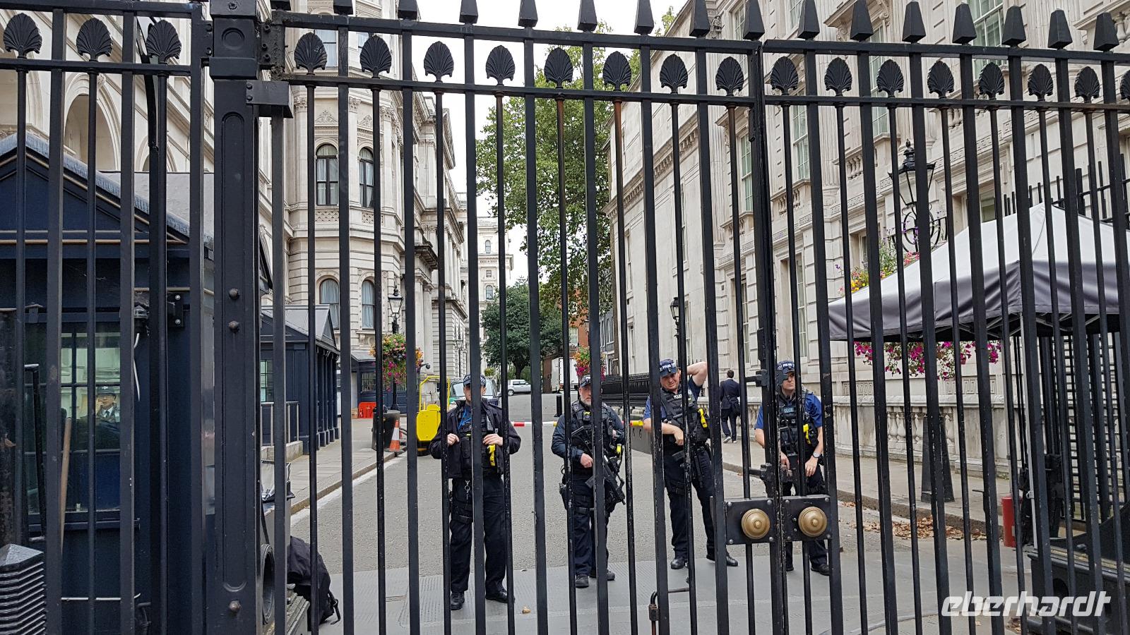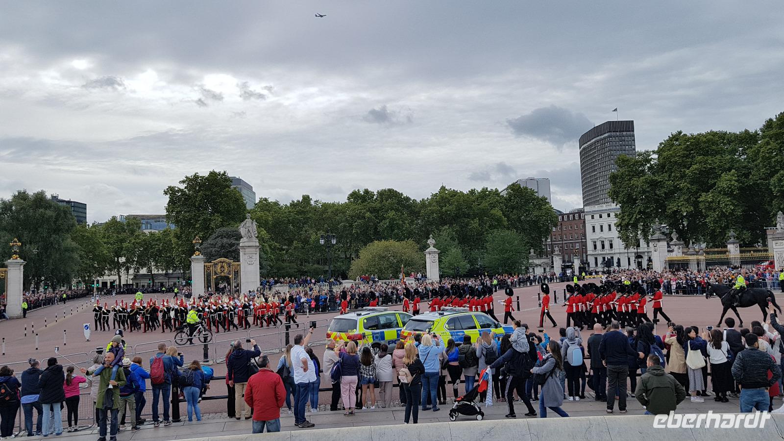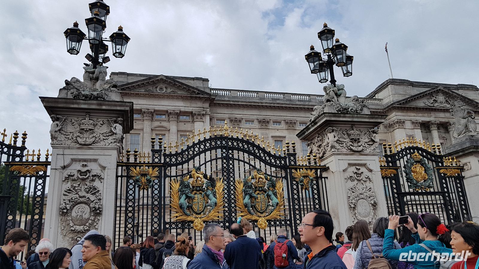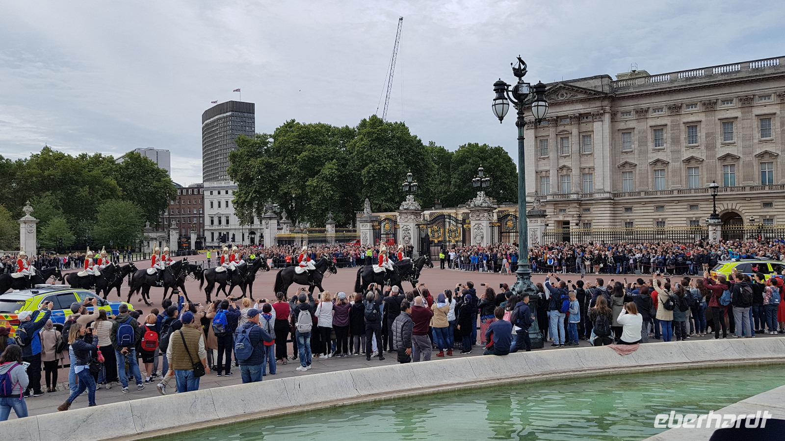 sehen. Einer über 700- jährigen Tradition gemäß wird hier die Wache vor dem Buckingham Palast in einem Zeremoniell abgelöst. Doch kurz bevor wir aufbrechen können: Feueralarm im Hotel! Wir sammeln uns draußen und auch die letzten vier Gäste schaffen es über die Treppen hinaus. So verlassen wir das Hotelgelände und spazieren gemeinsam zu U-Bahn-Station Tower Hill. Wir fahren bis zur Westminster Station und laufen dann an Downing Street vorbei auf den großen Paradeplatz an den Horse Guards. Durch den St. James´s Park schließlich erreichen wir die Wellington Barracks. Wir kommen gerade pünktlich 10 Uhr an, denn da starten die neuen Wachen zum Buckingham Palast. Vor dem Palast dann eine kurze Orientierung- die Reitergarde kommt vom St. James´s Palast die Mall herunter, die Musikparade von den Wellington Barracks. Also sucht sich jeder einen guten Platz zum Zuschauen und verfolgt gespannt das Geschehen. Danach gehen einige individuel weiter, besuchen noch die Westminster Abbey oder Harrods, die anderen fahren mit mir zurück zum Tower Hill. Hier verbringt jeder eine kleine Mittagspause und so gestärkt erkunden wir gemeinsam den