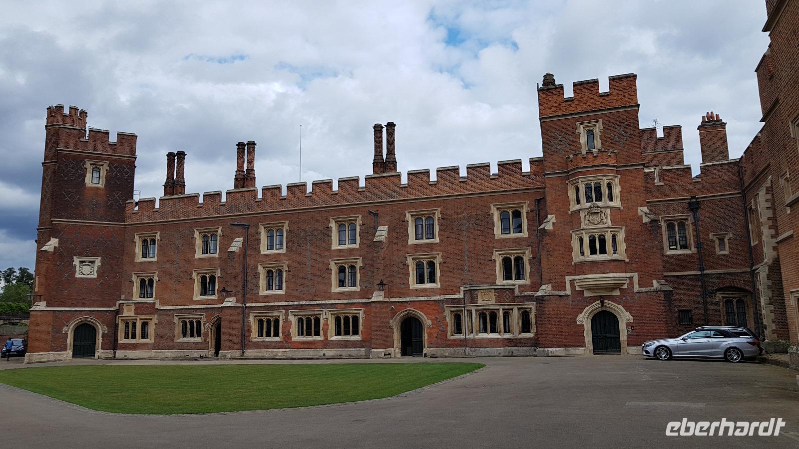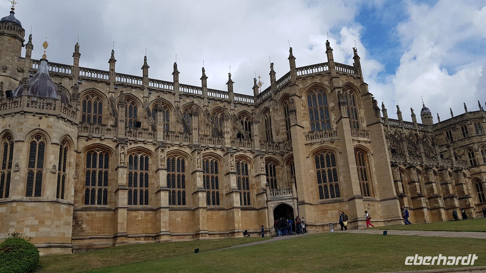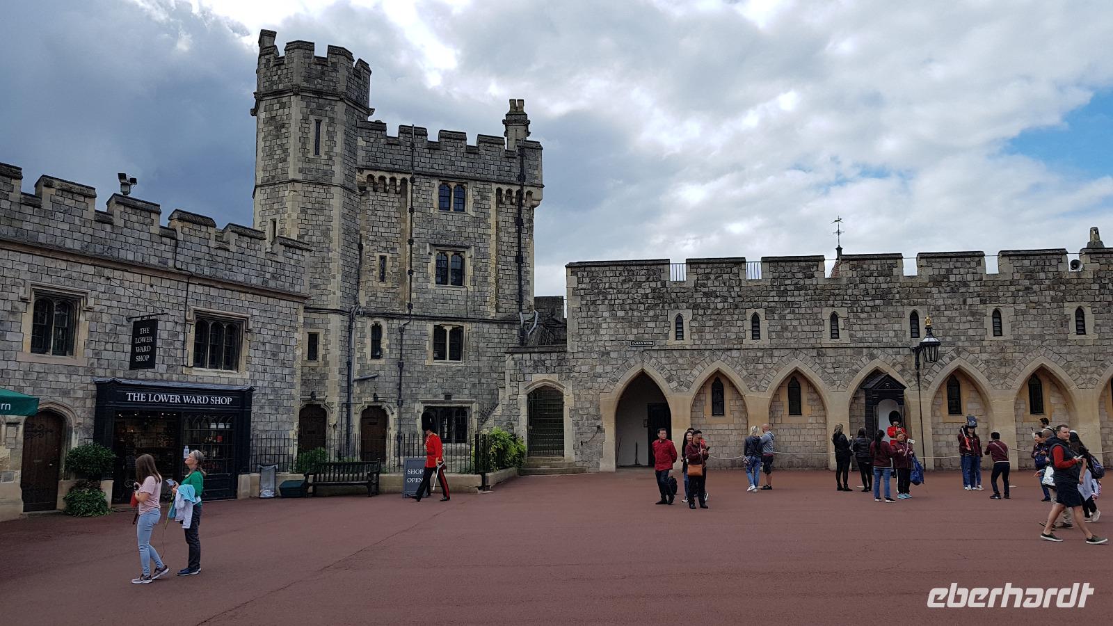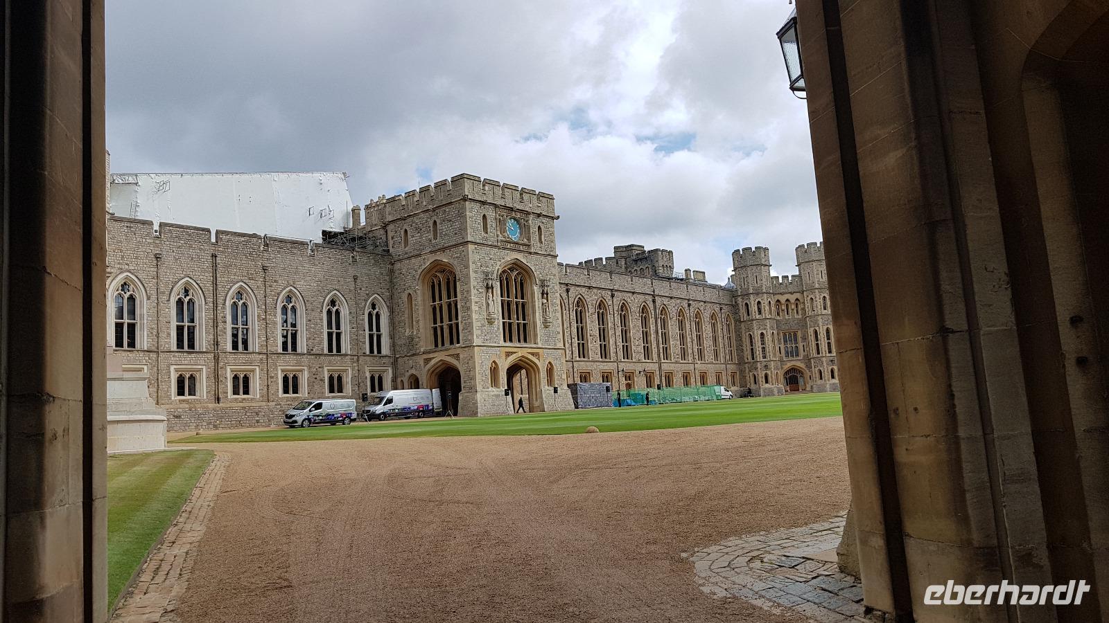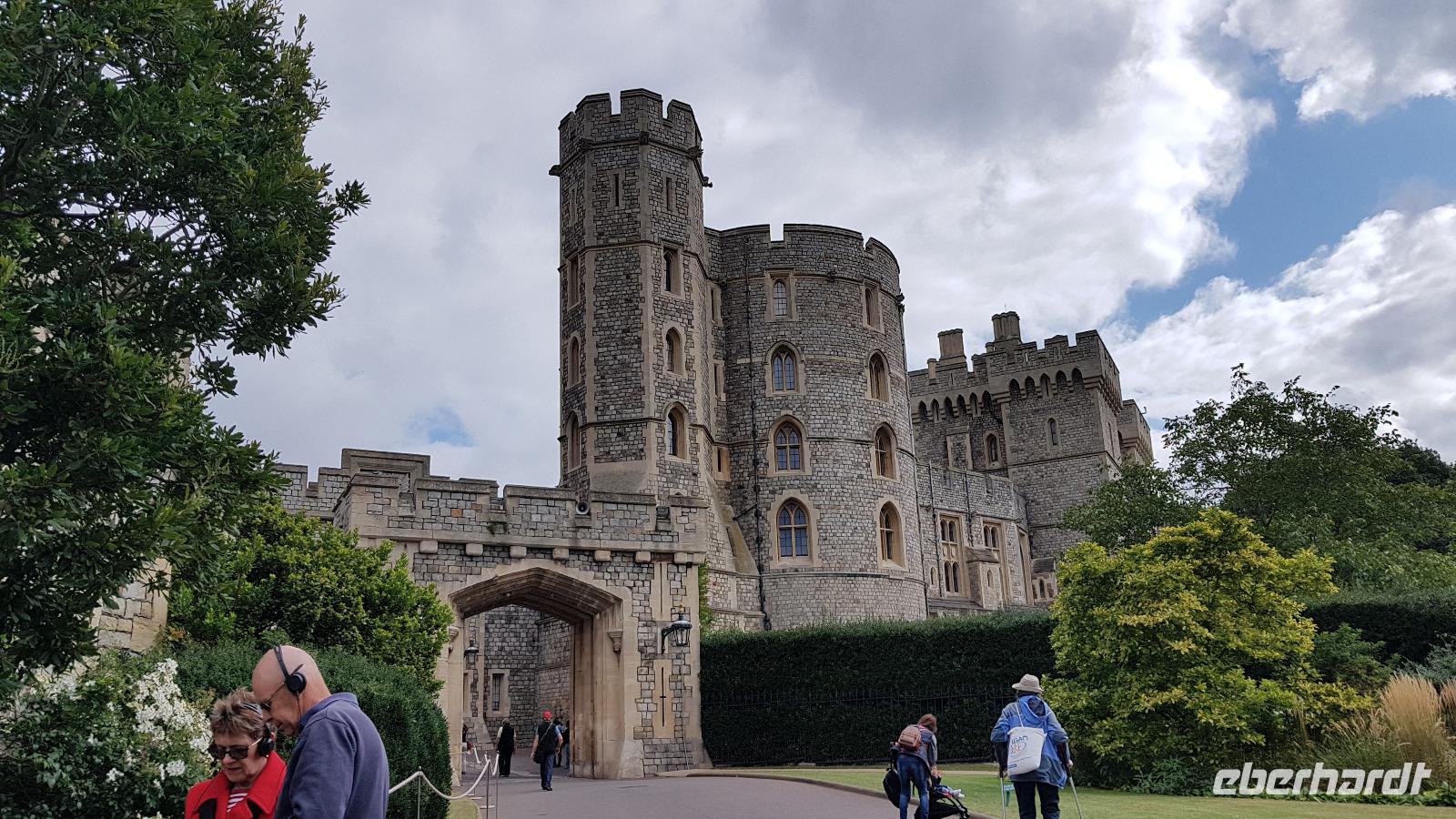 entschieden und so brechen wir kurz vor 9 Uhr auf. Manuel ist unser Fahrer und er bringt uns zügig und sicher an unser Ziel. Die Stadt scheint noch zu schlafen, wir kommen überall sehr gut voran. Auch zum Windsor Castle geht es gut voran, keine Schlange heute für die Sicherheitskontrolle- so schnell war lange keine Gruppe vor dem Castle. Noch die Audio Guides mitgenommen und dann standen wir auch schon am St. Georgs-Tor. Dahinter verbergen sich die Privatgemächer der Königsfamilie im sogenannten oberen Hof. Diese befindet sich derzeit in Schottland auf ihrem Landsitz in Balmoral. Wir erkunden gemeinsam den Weg zur Motte, dem aufgeschütteten Hügel mit dem Rundturm, der ältesten Anlage, die bis auf Wilhelm den Eroberer zurückgeht. Von hier haben wir einen tollen Blick auf den unteren Hof mit der
