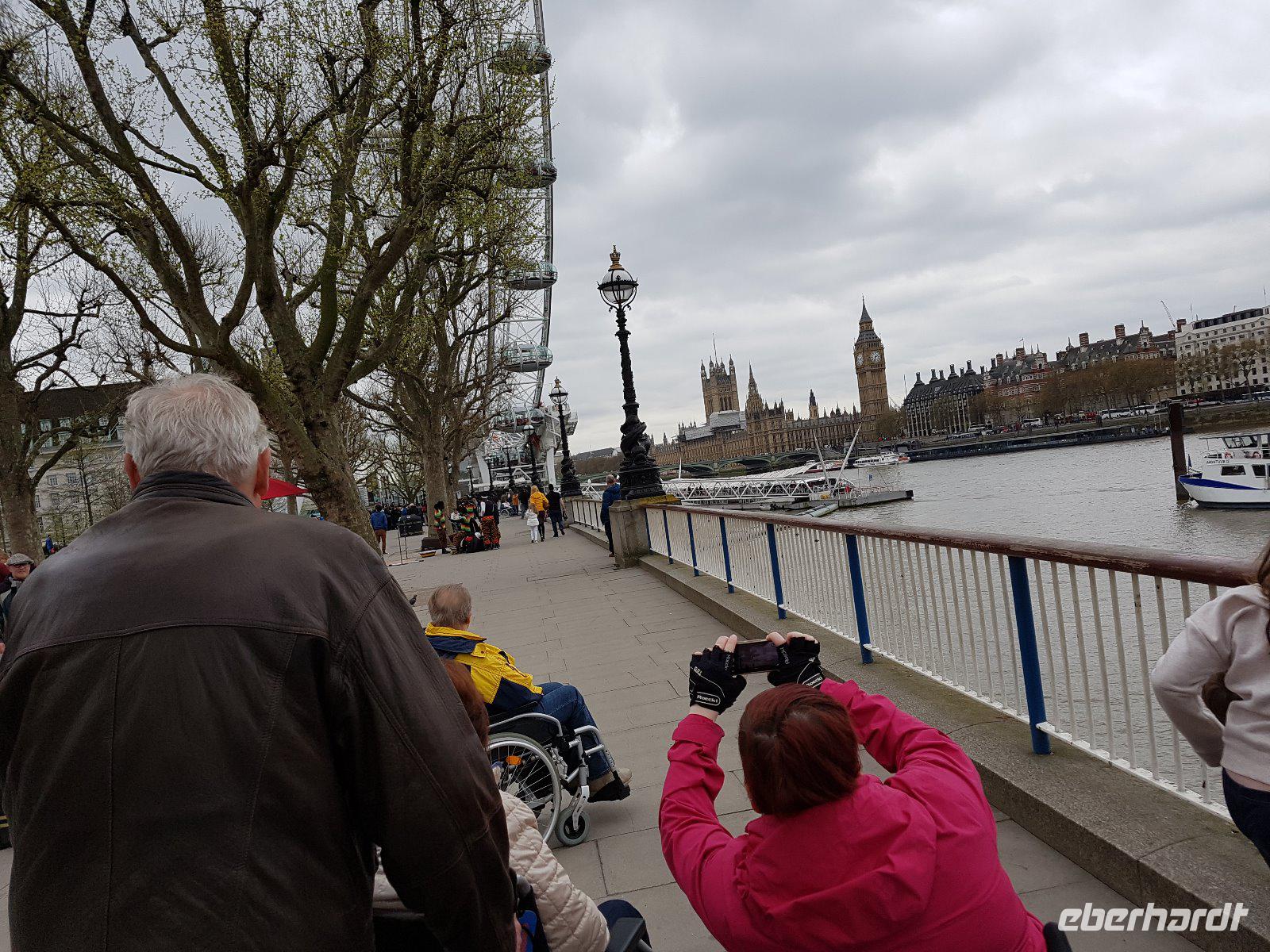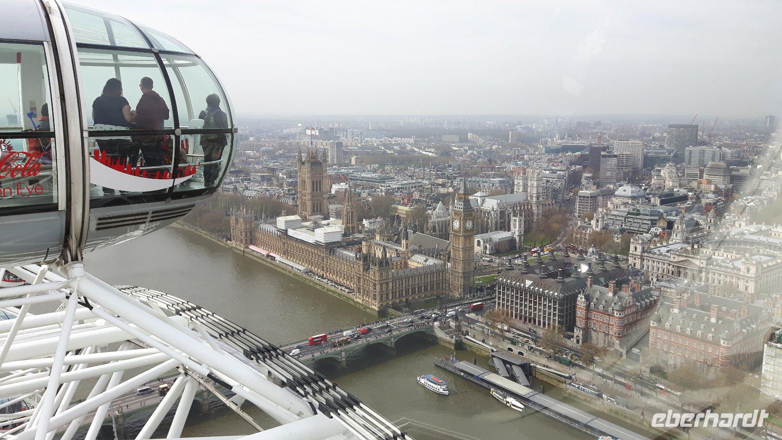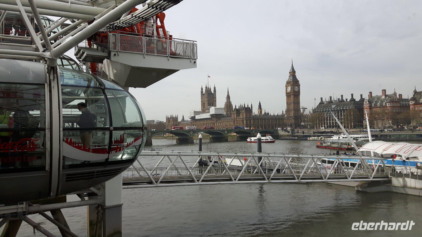 Heute steht zunächst eine Fahrt mit dem London Eye auf dem Programm. Nachdem wir nun schon einige Tage London vom Boden aus erlebt haben, rundet der Blick aus der Vogelperspektive unseren Eindruck von der britischen Metropole perfekt ab; 135m hoch genießen wir phantastische Impressionen.