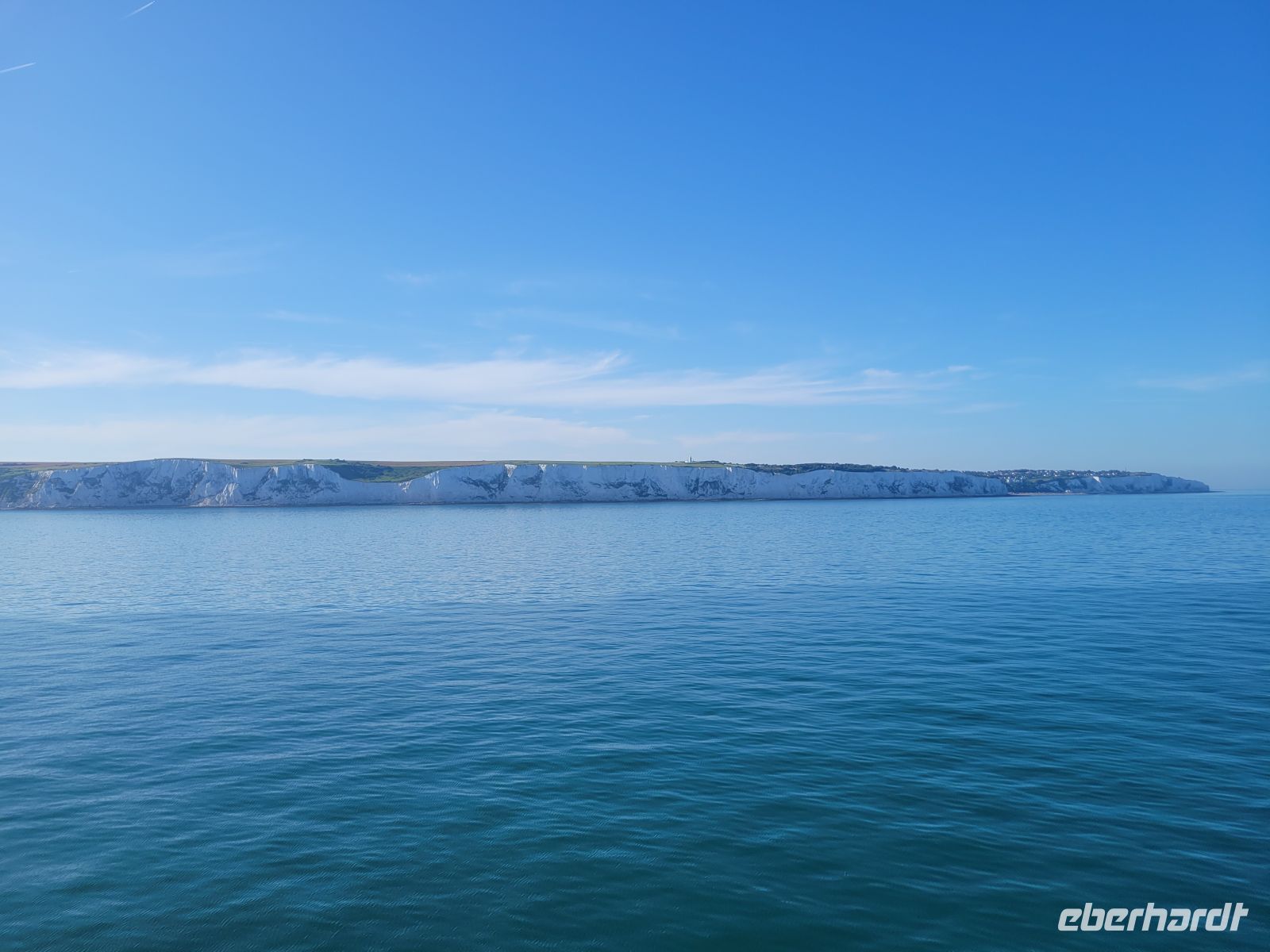 Geduldig durchlaufen wir die neuen, erweiterten Grenzkontrollen und reihen uns in die Warteschlange der Fährgesellschaft P&O ein. Bei bester Aussicht geht es dann über den Ärmelkanal; die White Cliffs of Dover begrüßen uns bei der Ankunft in Großbritannien.