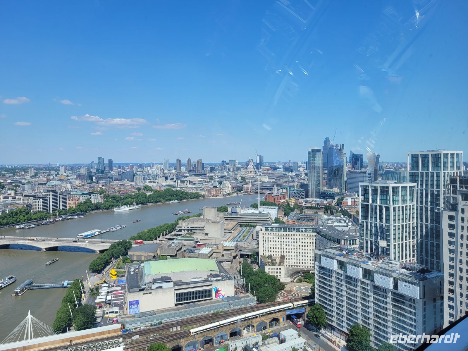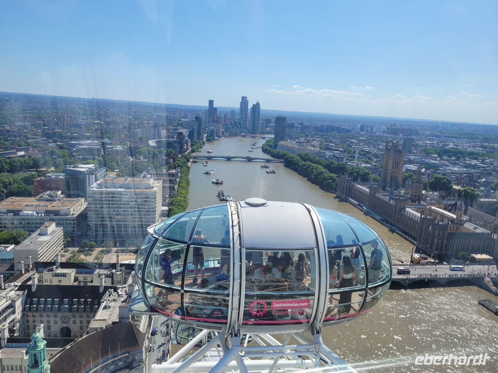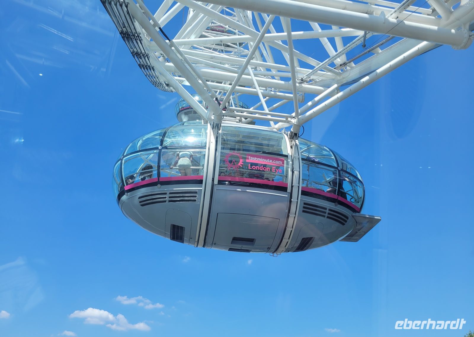Selbstverständlich lassen wir uns eine Fahrt mit dieser Attraktion nicht entgehen. Der Zustieg ist auch für größere Rollstühle problemlos möglich, so können wir also London auch aus der Vogelperspektive genießen.