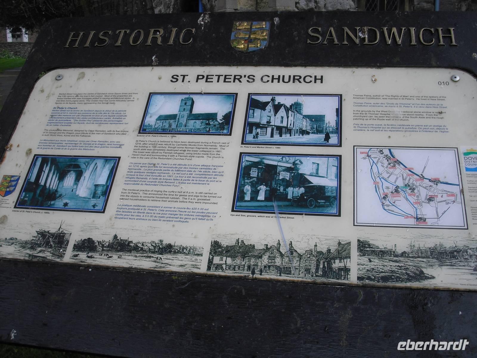 Am Nachmittag besuchten wir Sandwich, ein kleiner verschlafener Ort an der südostenglischen Küste in der Grafschaft Kent. Einst (12.-15.Jh.) gehörte Sandwich zu den Cinque Ports und genoß Privilegien. Hier soll auch das SANDWICH geboren worden sein, als der Earl of Sandwich während des Kartenspiels eine gebratene Fleischscheibe zwischen zwei Brotscheiben orderte.