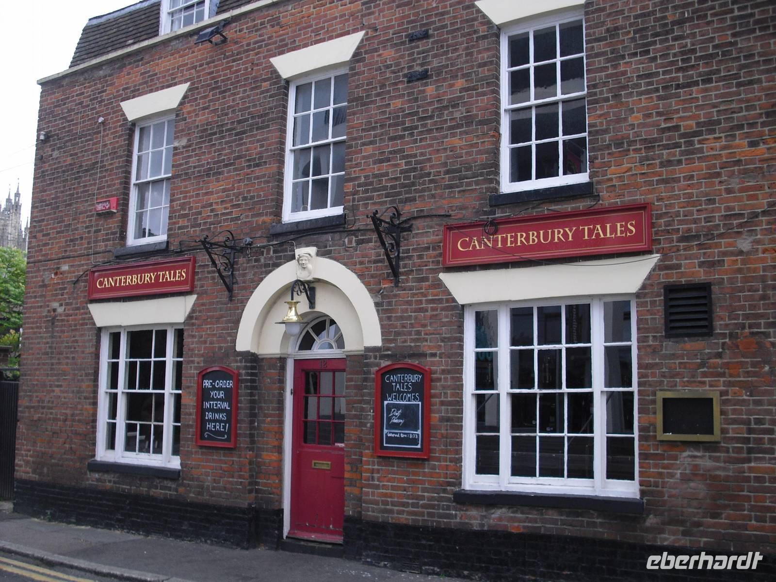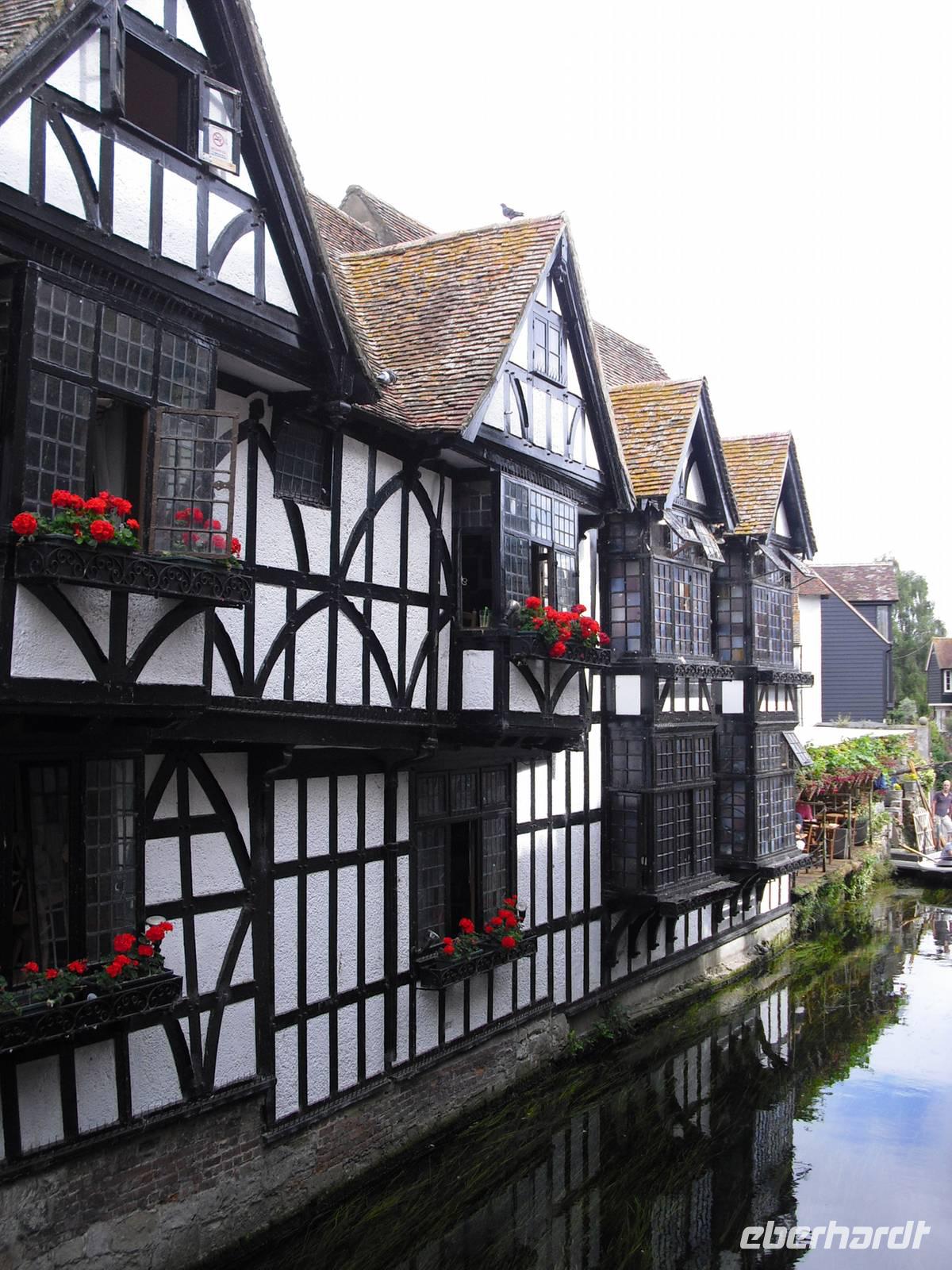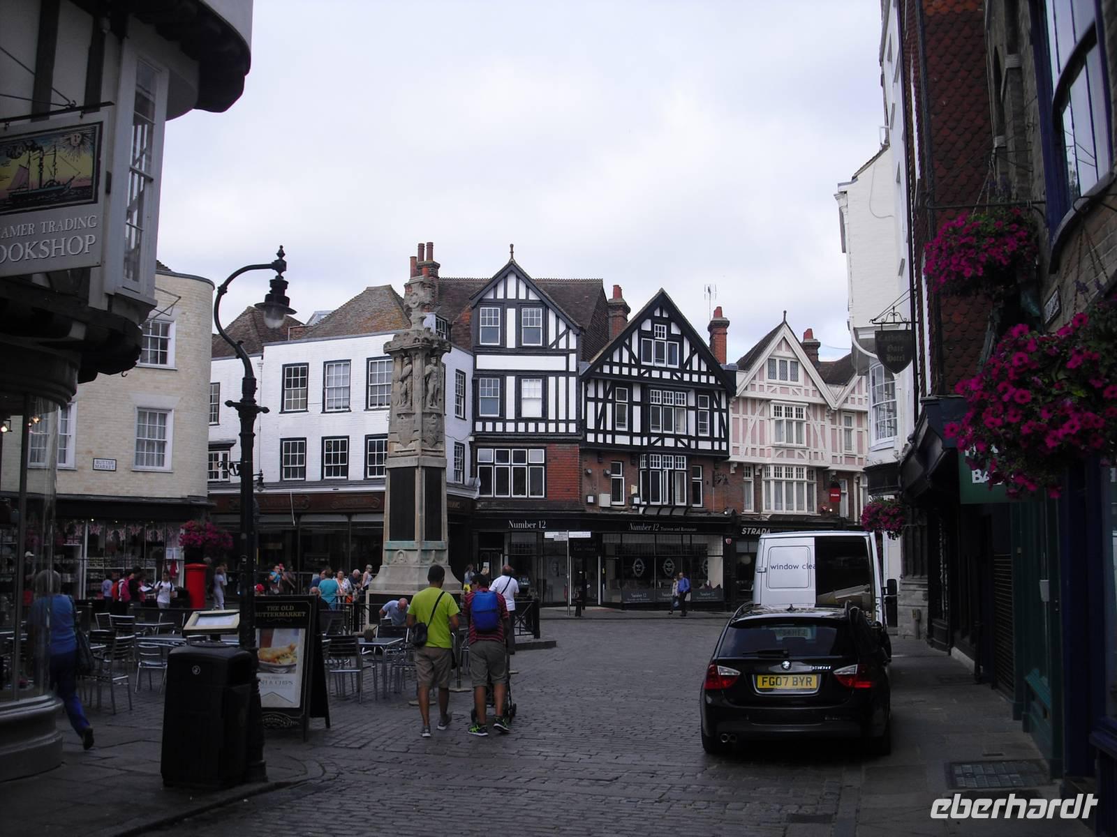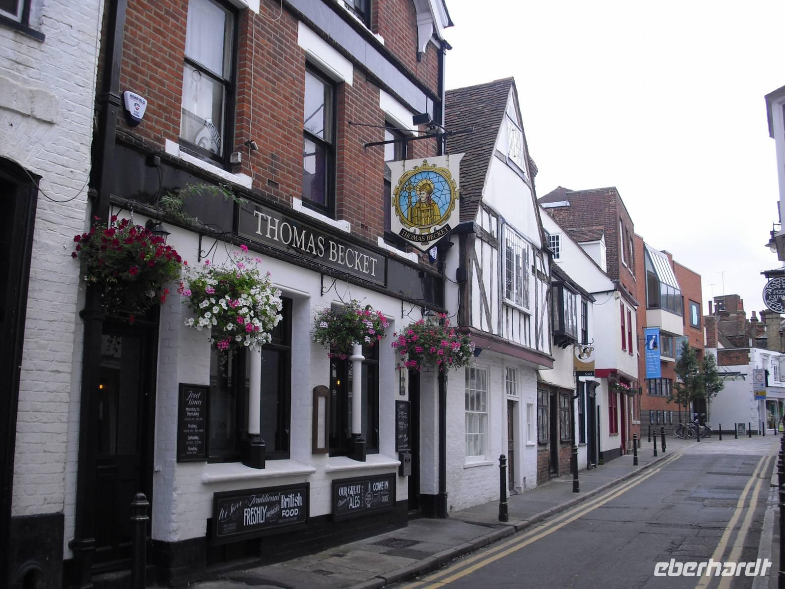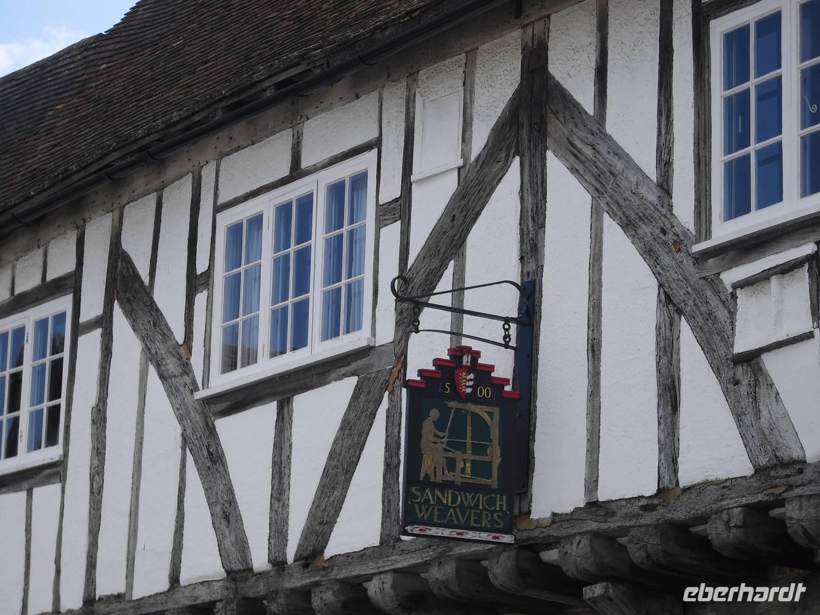 Vom Parkplatz spazierten wir durch die Altstadt von Canterbury, vorbei am Marlowe Theater zu einer Pilgerherberge (nach dem tragischen Tod von Thomas Becket im 12.Jh. wurde Canterbury eine Art Wallfahrtsort) und den Weavers Houses, den Fachwerkhäusern der aus Frankreich geflüchteten Hugenotten. Sie stellten an ihren Webstühlen Tuch her und daran erinnern noch einige Exponate im heutigen Pub.