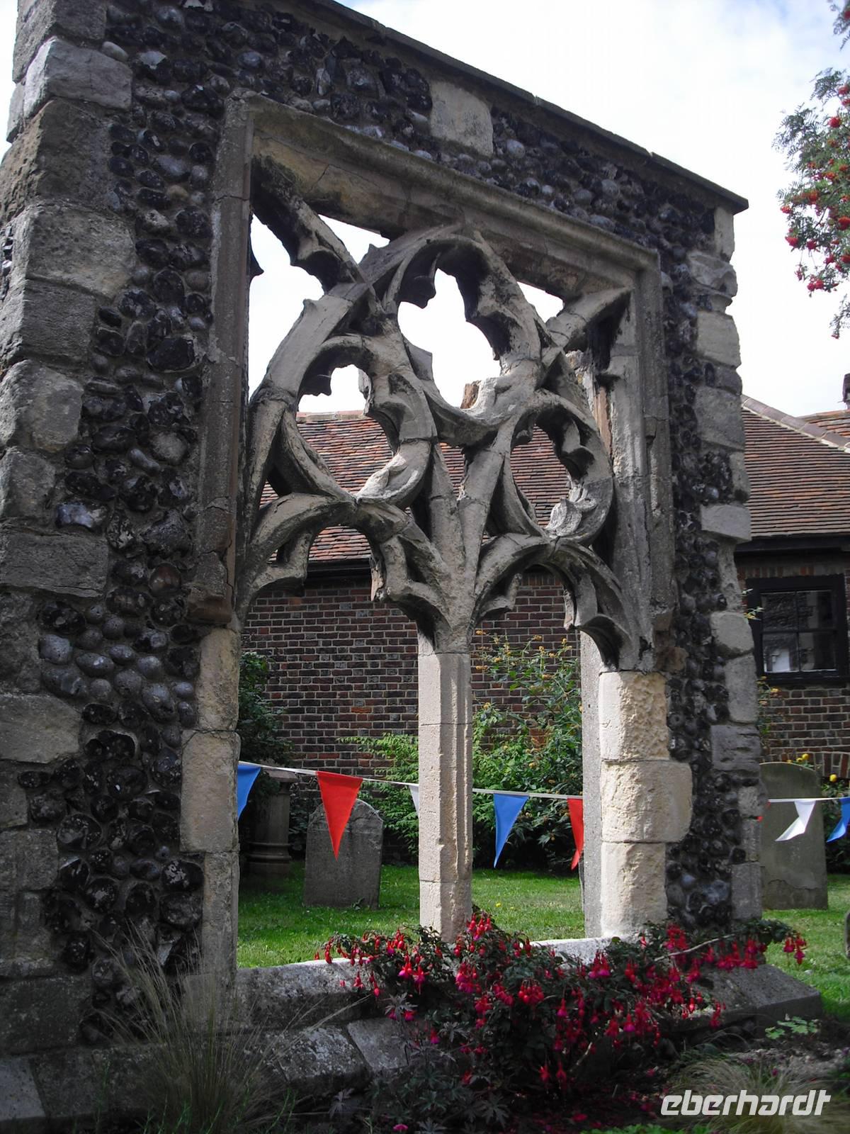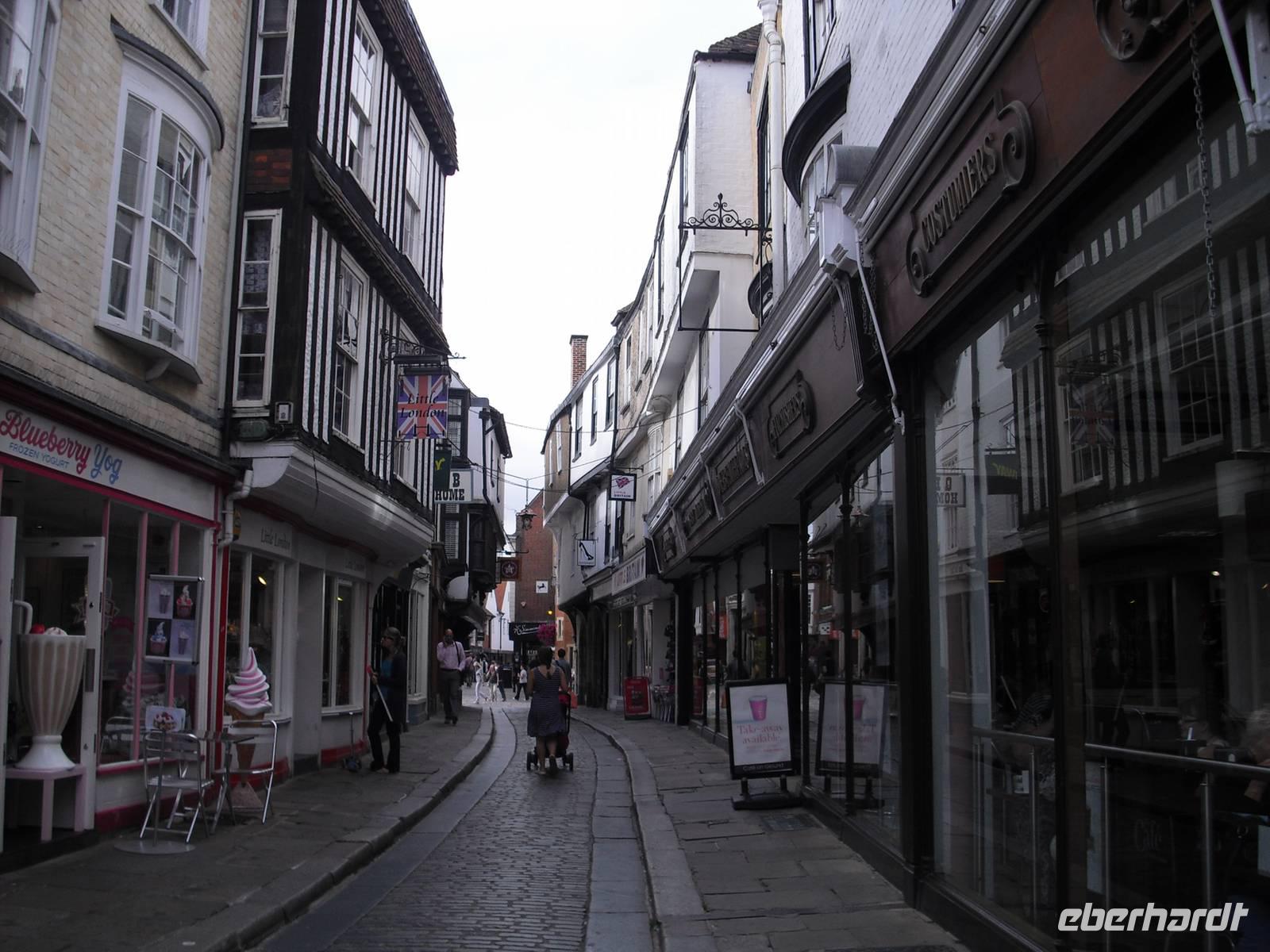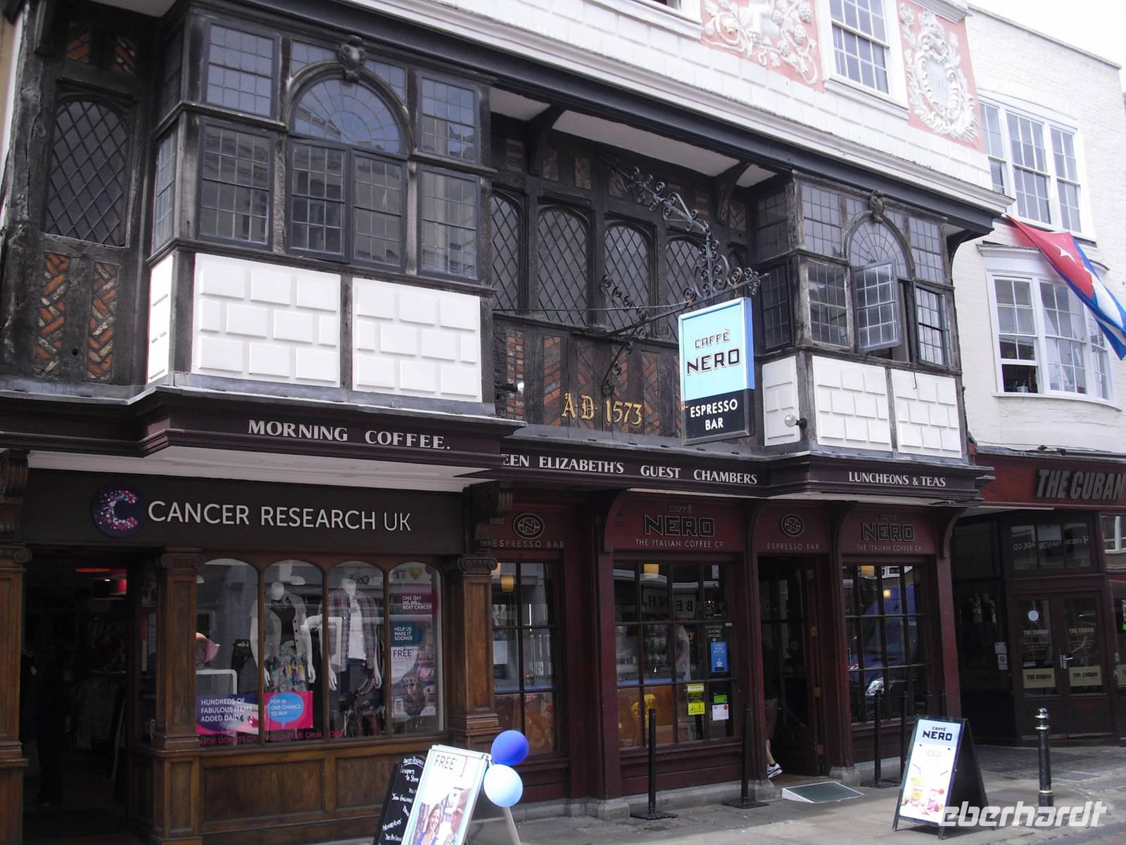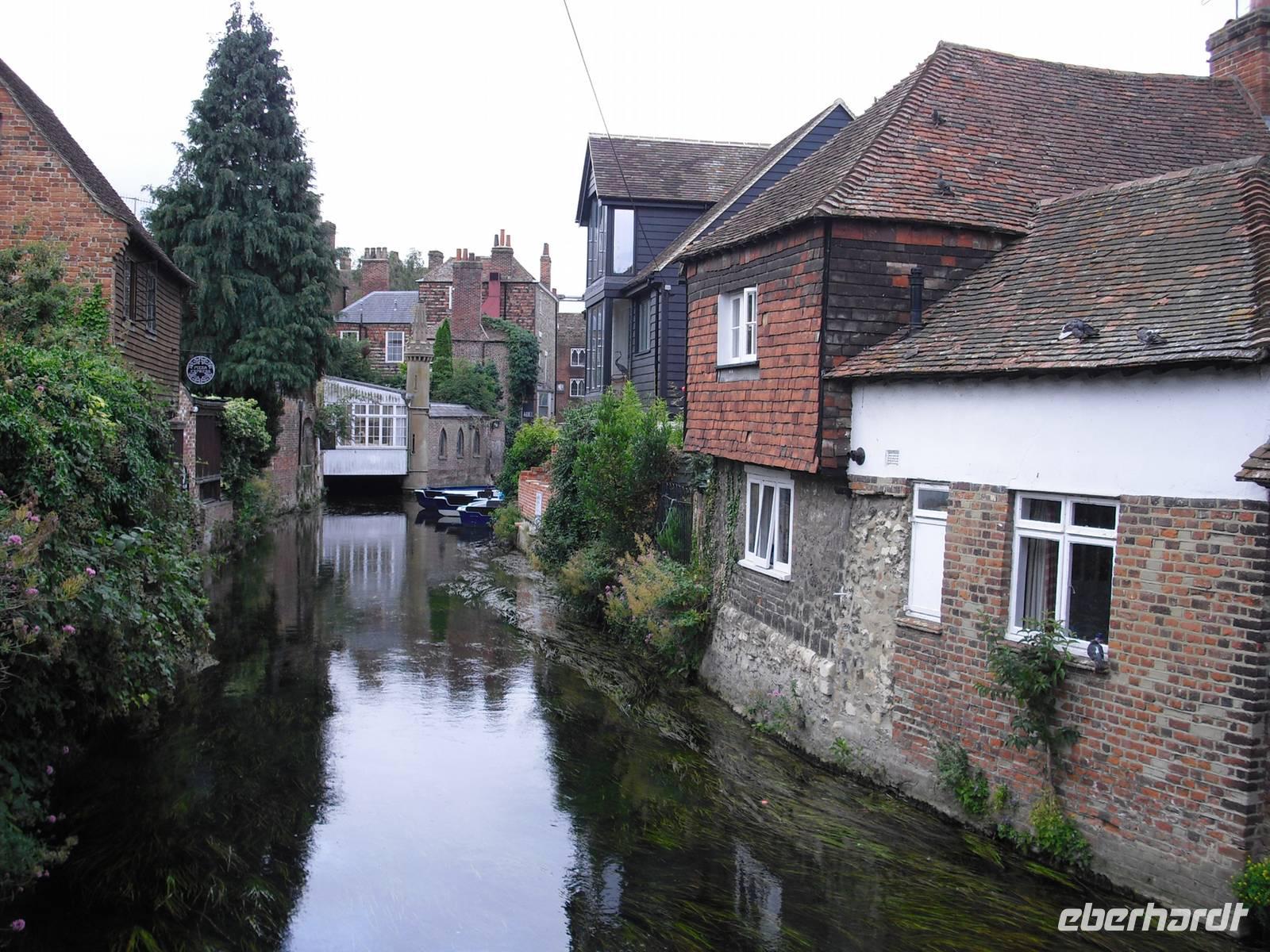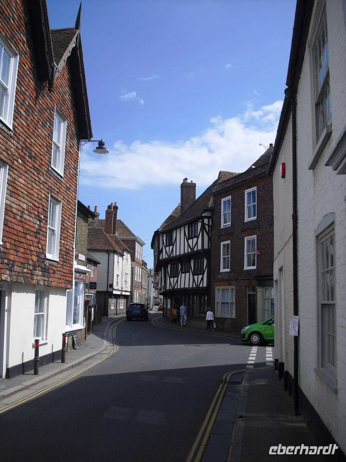 Vom Parkplatz spazierten wir durch die Altstadt von Canterbury, vorbei am Marlowe Theater zu einer Pilgerherberge (nach dem tragischen Tod von Thomas Becket im 12.Jh. wurde Canterbury eine Art Wallfahrtsort) und den Weavers Houses, den Fachwerkhäusern der aus Frankreich geflüchteten Hugenotten. Sie stellten an ihren Webstühlen Tuch her und daran erinnern noch einige Exponate im heutigen Pub.