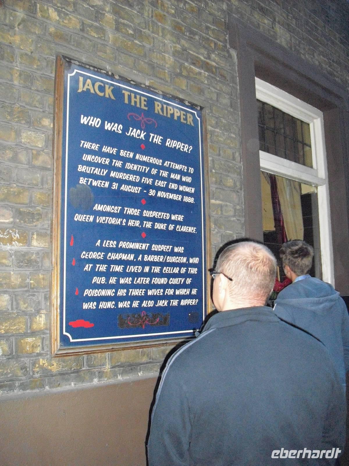Nach der Rückfahrt zum Hotel gab es unser Abendessen und anschließend brachte uns Holger mit dem Bus nach Whitechapel. Hier erwartete uns wieder der Mark und nahm uns dort mit in das London am Ende des 19.Jh. - wir folgten den Spuren von JACK THE RIPPER.