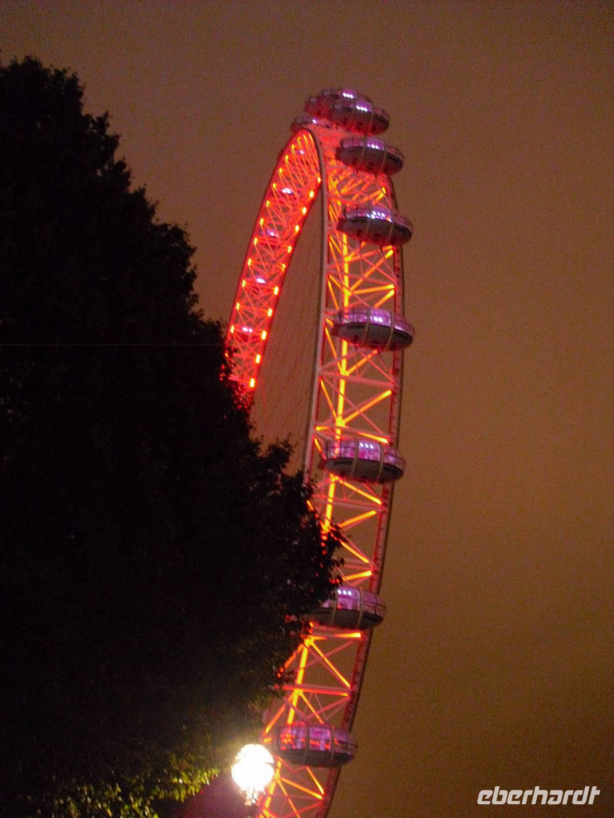 Ein großer Teil der Gruppe wollte eine Fahrt mit dem englischen siebenten Wunder unternehmen - das LONDON EYE. Ein Riesenrad als Wunder. Darauf können nur Engländer kommen. Tatsächlich jedoch ist dieses Riesenrad, es wurde Ende 1999 am südlichen Ufer der Themse aufgebaut, ein sehr schönes und lohnenswertes Ziel bei einem Aufenthalt in London. Mit einer Höhe von 135 m bietet es aus einer der 32 Kapseln, in denen jeweils 24 Personen Platz finden, innerhalb von 30 Minuten atemberaubende Blicke auf die Stadt.