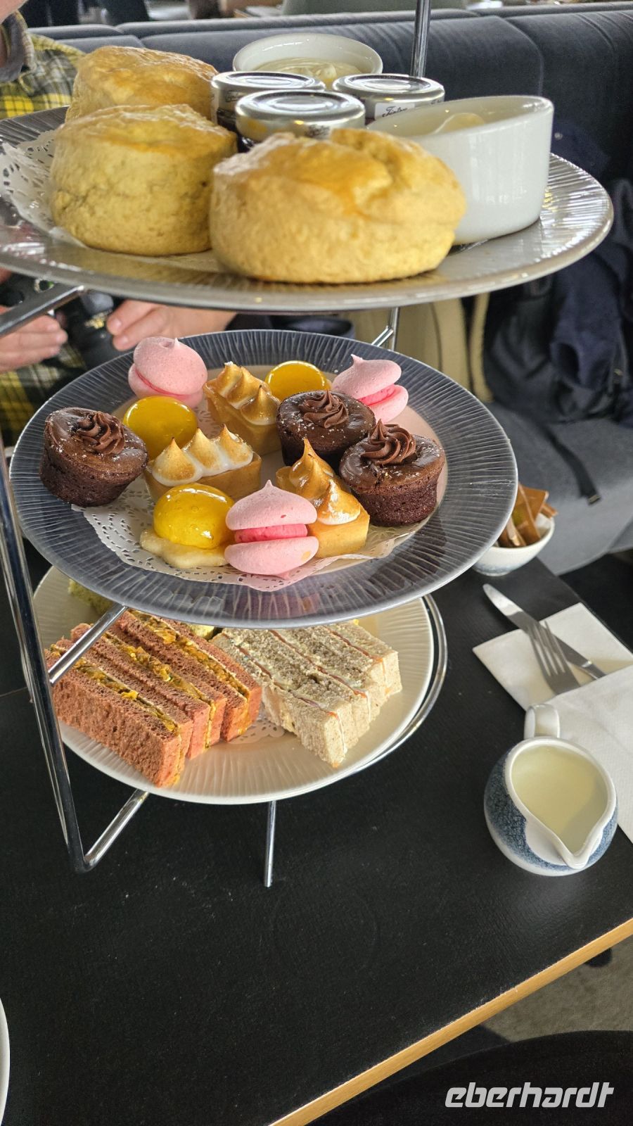 Eigentlich ist der Vormittag heute zur freien Verfügung- aber alle Gäste haben mein Angebot angenommen, nach Camden Town zu fahren. Also starten wir nach einem guten Frühstück, dass keine Wünsche offen ließ, mit einem kleinen Spaziergang zur Bushaltestelle. Die Linie 27 bringt uns direkt nach Camden Town und unterwegs genießen wir das Londoner Flair. Chalk Farm heißt die Endhaltestelle der Linie und ab hier erleben wir die Welt des Camden Market. Zunächst bringt uns ein Spaziergang die Highstreet entlang zur Metro. Hier werden wir uns nach dem Mittag treffen. Begeisterte die Highstreet schon mit ihren bunten und hippen Fassaden und Läden, so tut es der Market am Camden Lock noch mehr. Unter der Bahnbrücke waren früher Pferde untergebracht, die Waren auf dem Fluss in die umliegenden Orte treidelten. Heute gibt es Läden, Shops, Ateliers, Werkstätten, Cafés, Imbiss- Stände...Selbst eine eigene Brauerei und eine Gin Distillery gibt es. Also genug zum Schauen, Bummeln, Staunen und Genießen. So vergeht die Zeit wie im Flug und schon sehen wir uns an der Tube, wie die Londoner ihre U- Bahn nennen. Die bringt uns zur London Bridge. Was für ein toller Blick auf die City of London! Unterhalb des Towers befindet sich der Pier für unser Schiff, mit dem wir auf der Themse entlang schippern wollen. Auf dem Weg dorthin erleben wir den London Marathon noch in vollem Gange. Auch zu dieser späteren Stunde bejubeln die Zuschauer an der Strecke die Läufer, die quasi auf einer Woge der Begeisterung die letzten Kilometer ihres Marathons absolvieren. Wir absolvieren die letzten Schritte bis zum Pier und warten dann geduldig auf unser Boot. An Bord sind unsere Plätze reserviert und wir können während der Fahrt einen Afternoon Tea genießen. Sandwiches, Scones mit clotted cream, Pralines und Gebäck versüßen uns die Fahrt. Ein Stück nach Osten geht es Richtung Greenwich zur Skyline des neuen Bankenviertels und dann retour und bis Westminster. Der Elisabeth- Tower mit Big Ben und die Houses of Parliament grüßen, wie auch das London Eye- das Riesenrad. Zurück an der Tower Bridge endet unsere Fahrt und wir spazieren gemeinsam zur Metro. Unterwegs immer noch der Jubel der Zuschauer, die die Marathon- Läufer anfeuern. So erreichen wir unsere Metro Station Tower Hill und fahren von hier zurück zum Hotel. Ein gemeinsames Abendessen bringt uns noch einmal zusammen. Allerdings fällt es nicht so üppig aus, der Afternoon Tea war mehr als reichlich. So bleibt leider viel übrig und wir verabschieden uns- bis morgen.