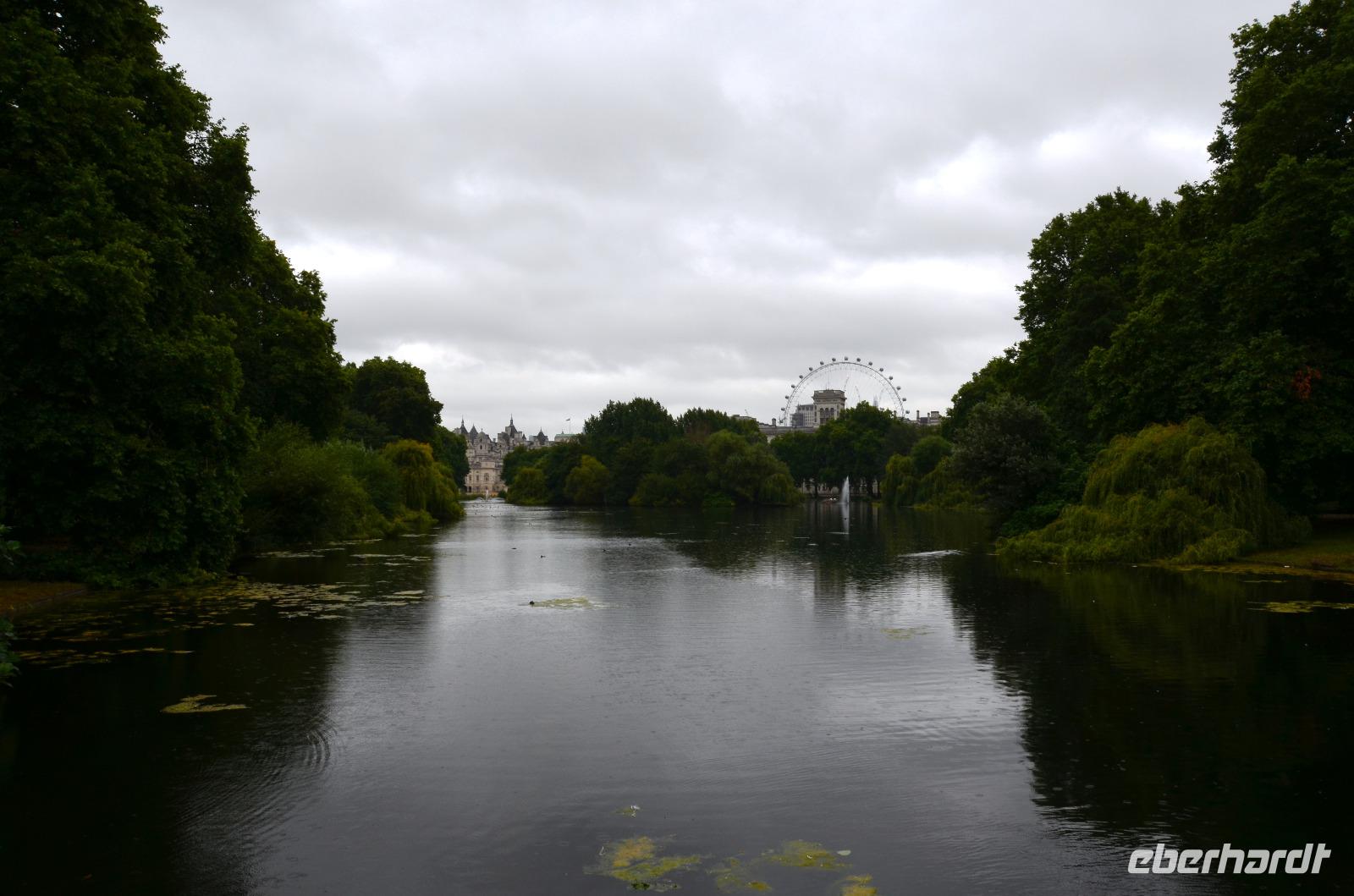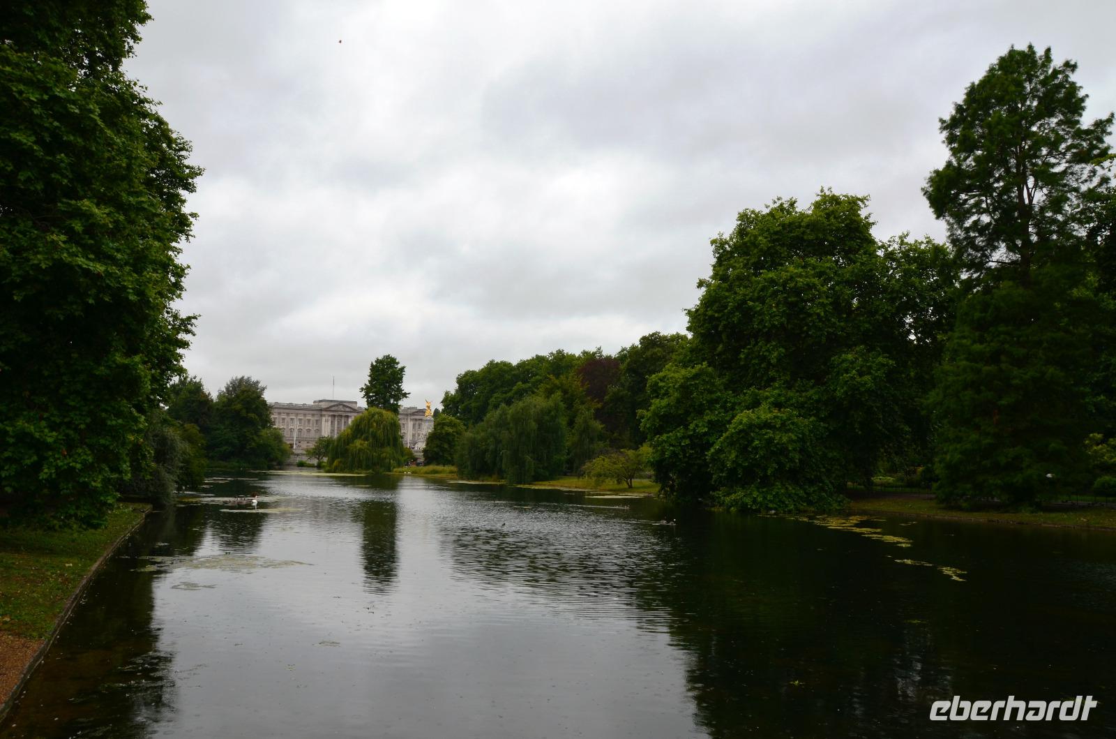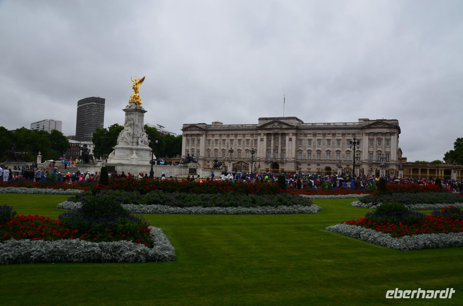 09:00 Uhr treffen wir uns dann in der Lobby des Hotels und machen uns auf einen kurzen gemeinsamer Fußweg zur Bushaltestelle der Buslinie 485. Mit dem modernen roten Doppelstockbus fahren wir bis zur Westminster City Hall und ab hier beginnt nun unsere gemeinsamer Spaziergang zur Pferdewache, durch den St. James´s Park geht es hinüber zur Garnison der Guards. Hier besteht eine gute Beobachtungsmöglichkeit des Appells und der Probe des Orchesters. Leider beginnt es jetzt leicht zu regnen. Trotzdem beginnt genau 11:00 Uhr der Aufmarsch zur Wachablösung am Buckingham Palace.