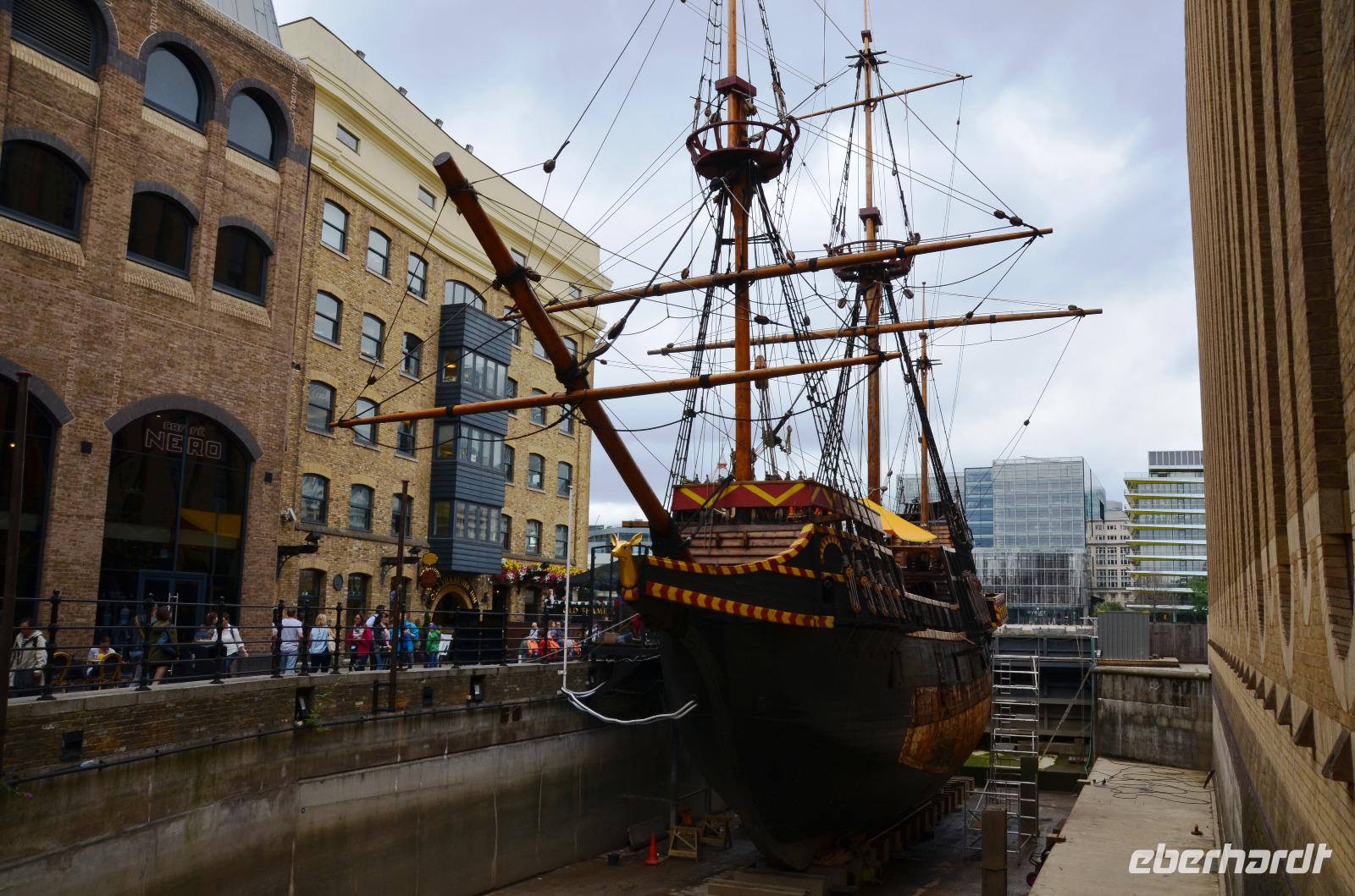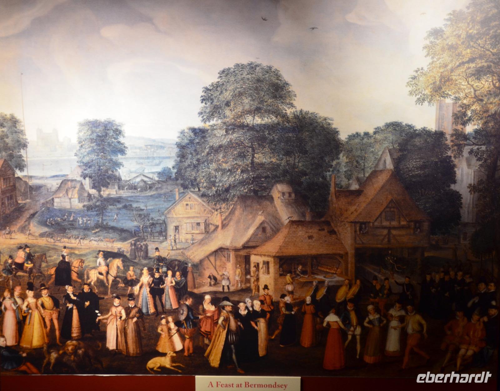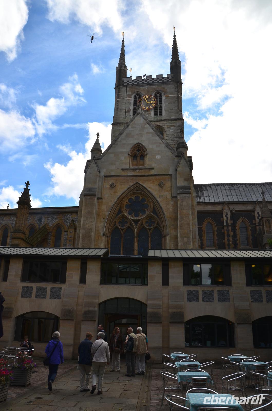 Die gemeinsame Fahrt mit Bus 485 bis Westminster Station und ab hier mit der Jubilee Line der Tube bringt uns bis zum Haltepunkt London Bridge. Ideal als Ausgangspunkt für den gemeinsamen Spaziergang zur und um die Southwalk Cathedral, den Eintritt und die Führung innen. Schließlich ruhen alle bei einer gemeinsame Pause im Cafe etwas aus. Anschließend spazieren wir weiter - zur „Golden Hynde", dem Nachbau des Schiffes von Sir Francis Drake, der Ruine des Bischofspalastes von Westminster, zum alten Pub „The Ancor" und zum neu errichteten Globe Theatre, wobei uns Ulla auch dessen alten, ursprünglichen Standort zeigt.