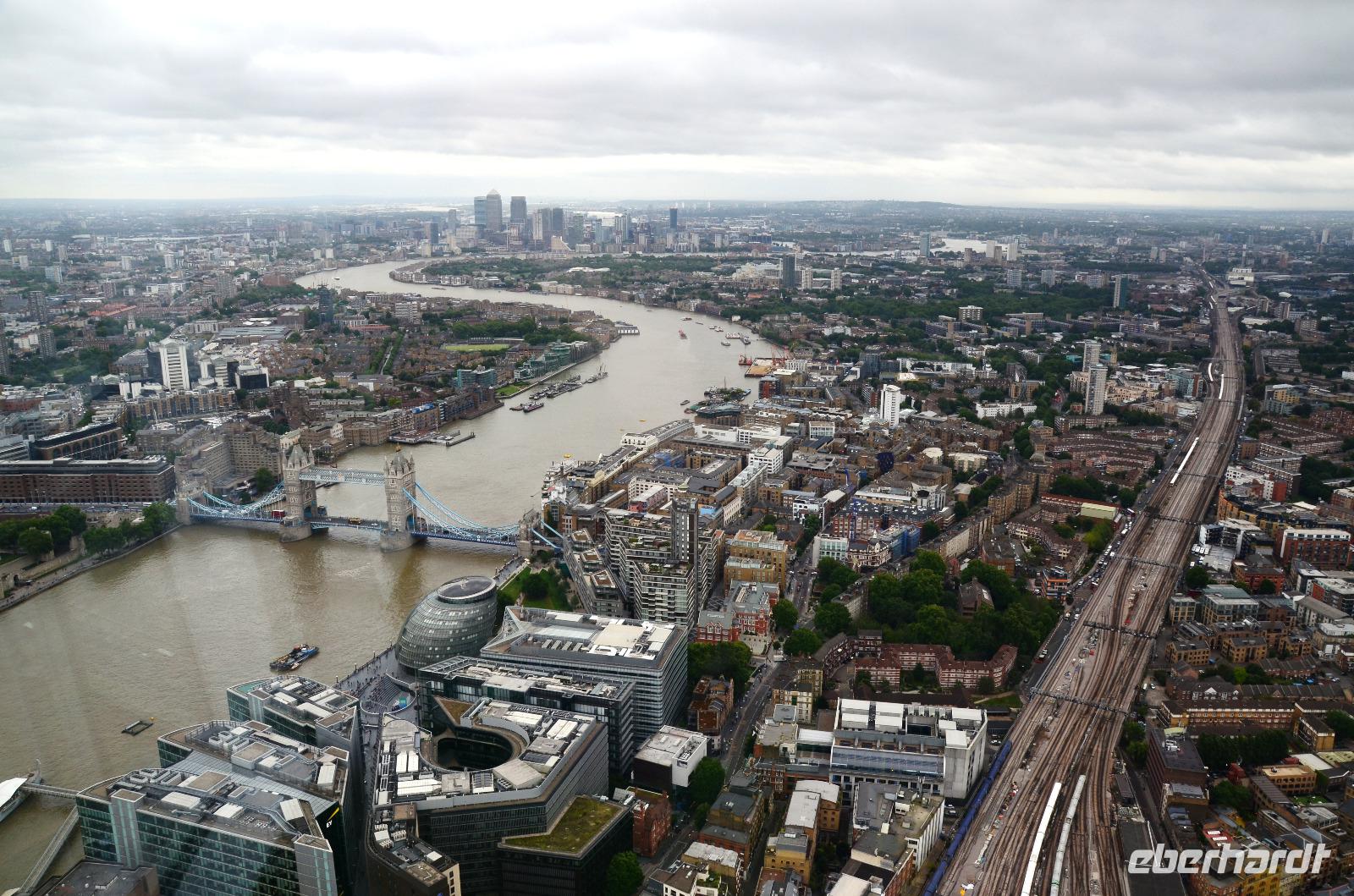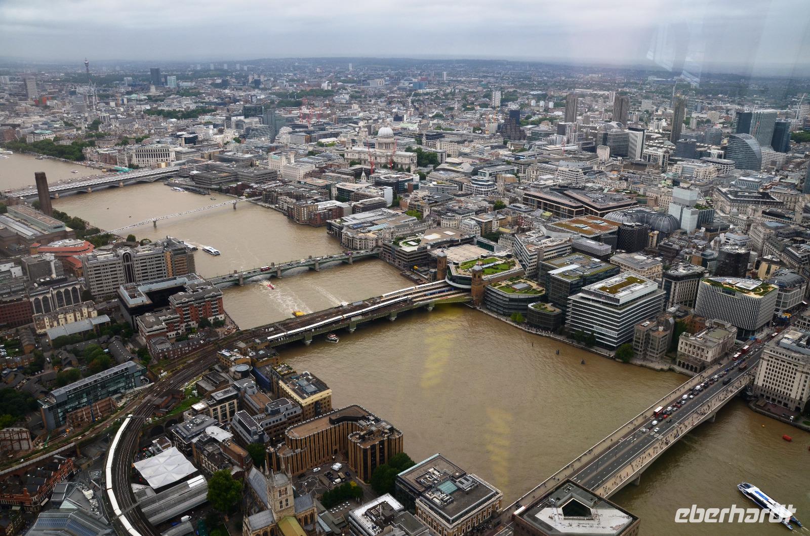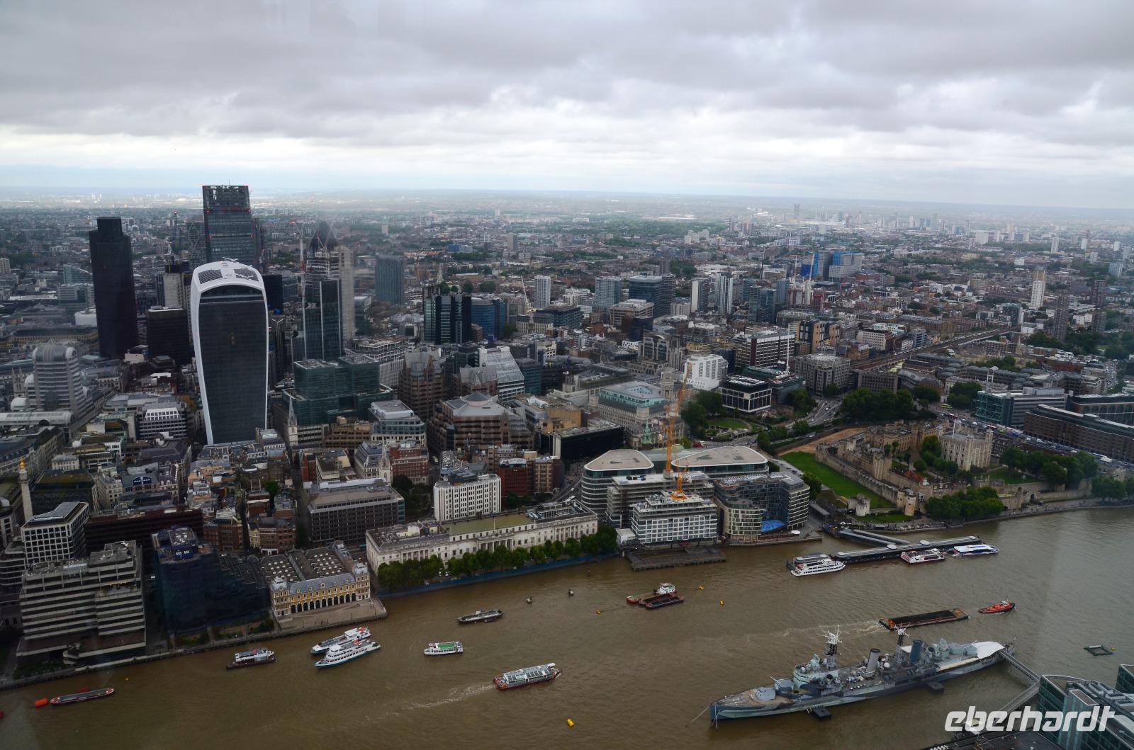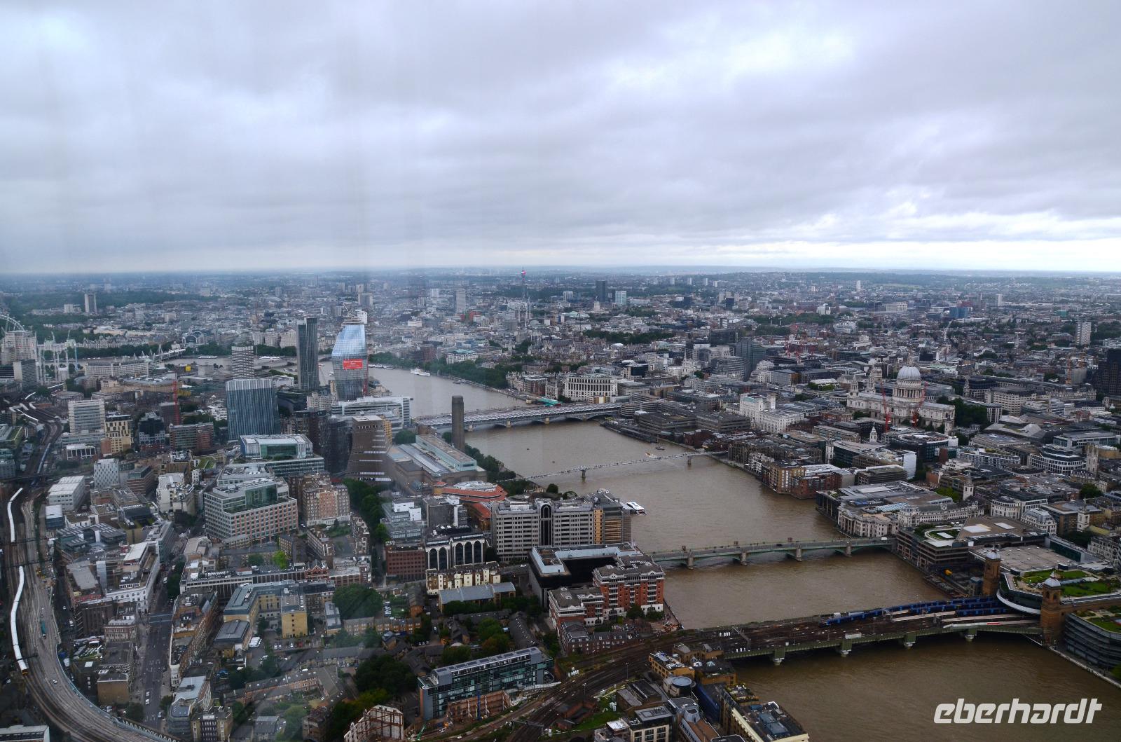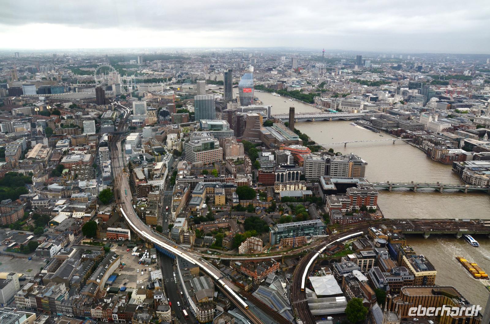 Mit dem Bus 24 fahren wir zurück zur Westminster Station und von hier mit der Jubilee Line nach London Bridge. Durch die Shard-Galeria gelangen wir schnell zum „Shard"-Hochhaus - machen die gemeinsame Auffahrt und genießen die tolle, einfach überwältigende Aussicht mit einem Glas Sekt. Im Fischrestaurant am Borough Market klingt der schöne Tag bei einem gemeinsamen Umtrunk und der herzlichen Verabschiedung von Ulla aus.